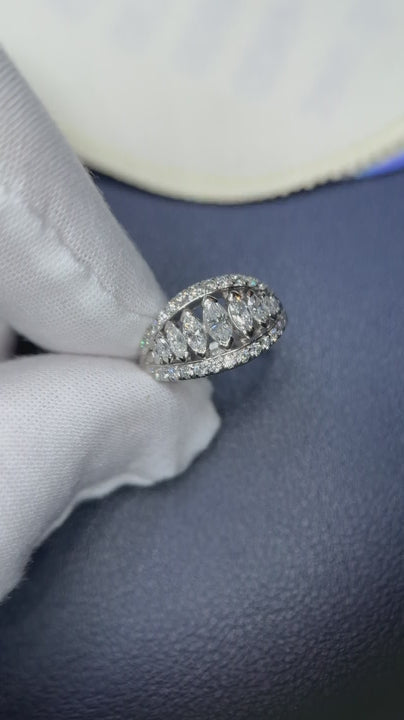 A brilliant graduated row of natural marquise cut diamonds is nestled along the center of this wide platinum band. The marquise diamonds weigh just over 1.00 carat in total and are near colorless and eye clean. They are accented on their north and south sides by brilliant round diamonds weighing just under 1/2 carat total. The band weighs 7.8 grams and is stamped '%IRIDPLAT' on the interior of the band. It is a size 7, and we offer complementary resizing. It measures 11.40mm wide and tapers down to 2.00mm at its base. This cocktail band is pre-owned and in excellent overall condition.