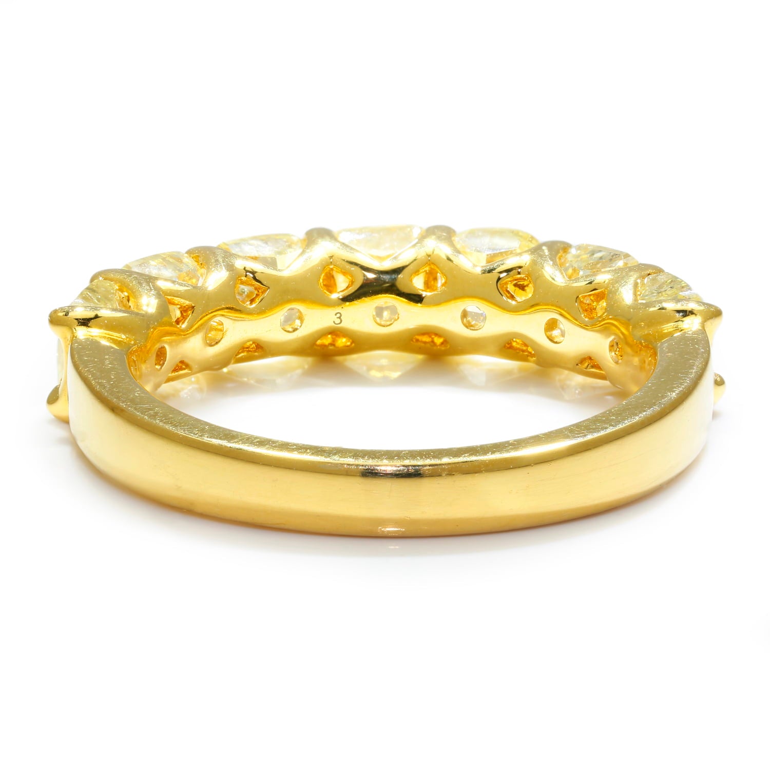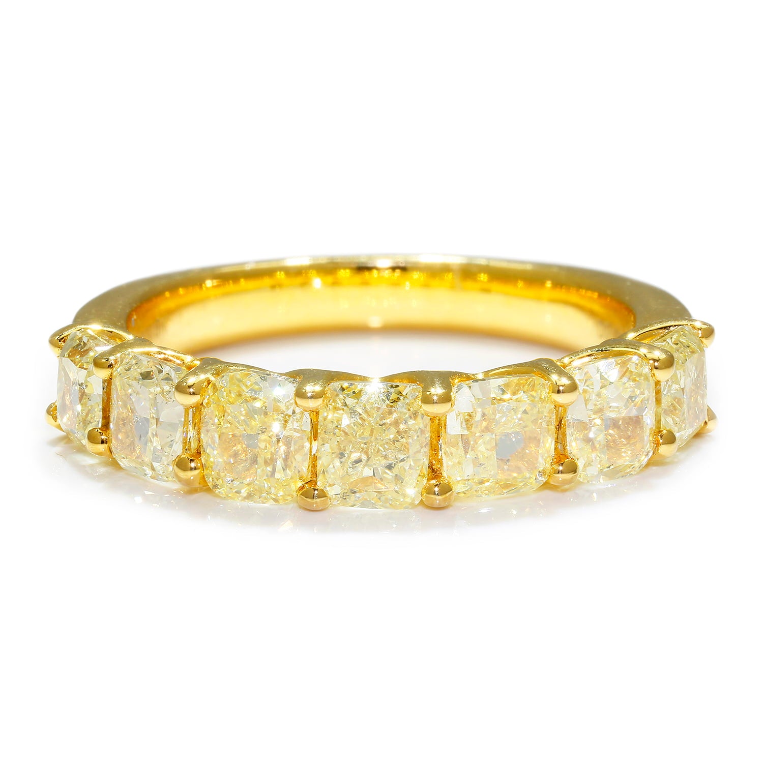 This natural fancy yellow diamond band is made of solid 18kt yellow gold and features 2.90 carats of diamonds. There are 7 cushion-cut, shared-prong, beautifully matched diamonds set in a straight band. The scalloped prong set design allows you to see the diamonds from the side and lets the most light reach them. The band's width measures 4.25mm, and it is a size 6.5. It is brand new!