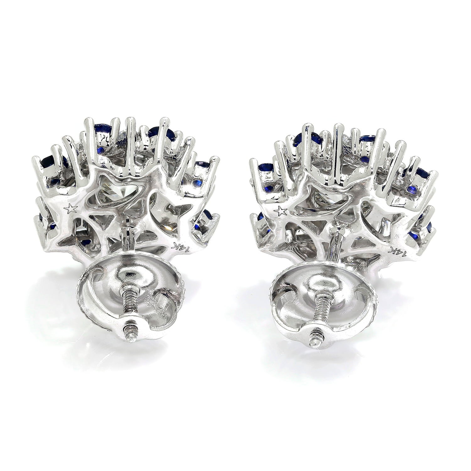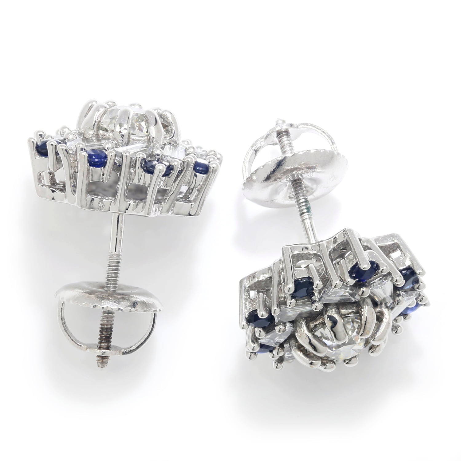 A whirlwind of baguette-cut diamonds and blue sapphires swirl around old European-cut diamonds in these unique stud earrings. These are crafted of solid 14kt white gold and use threaded posts and screw-backs for a secure closure. The Euro diamonds offer a distinctive contrast against the baguette diamonds and halo of sapphires. These exhibit a ton of sparkle and fire. The earrings have a diameter of 12.00mm. These are like new.