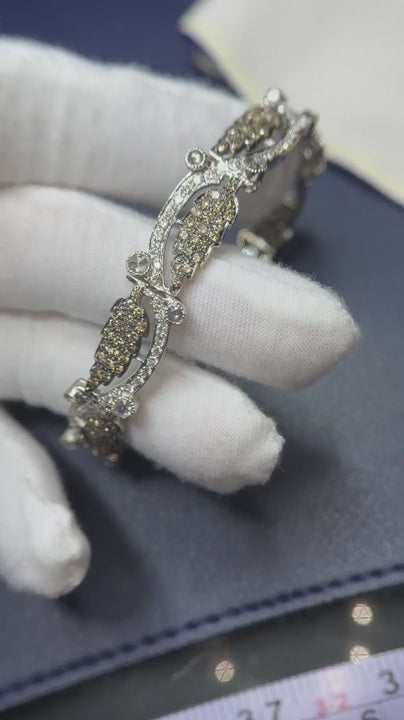 This exciting diamond link bracelet features a row of colorless diamonds that weaves in and out of the fancy brown diamond leaf designs. There are approximately 2 3/4 carats of fancy brown color diamonds and approximately 3 carats of rose cut and round brilliant colorless diamonds in this bracelet, totaling nearly 6 carats of diamonds! It is made of solid white and black oxidized gold weighing 26.7 grams. It measures 7 3/8 inches long and 7/16 inches wide. It is expertly crafted and uses a secure box clasp with a safety catch for added security. It is pre-owned and in very good condition with signs of wear.