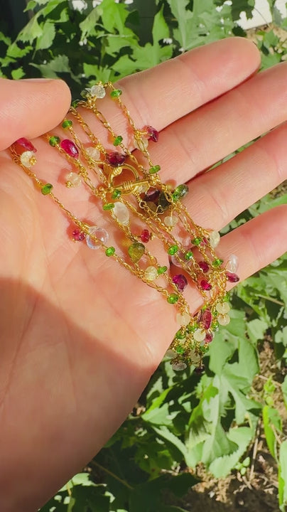 This 39-1/2-inch-long necklace by jewelry artist Laura Gibson features a variety of multi-colored semi-precious gemstones strung along a solid 22 karat yellow gold necklace strand. It is pre-owned and in Like New condition.