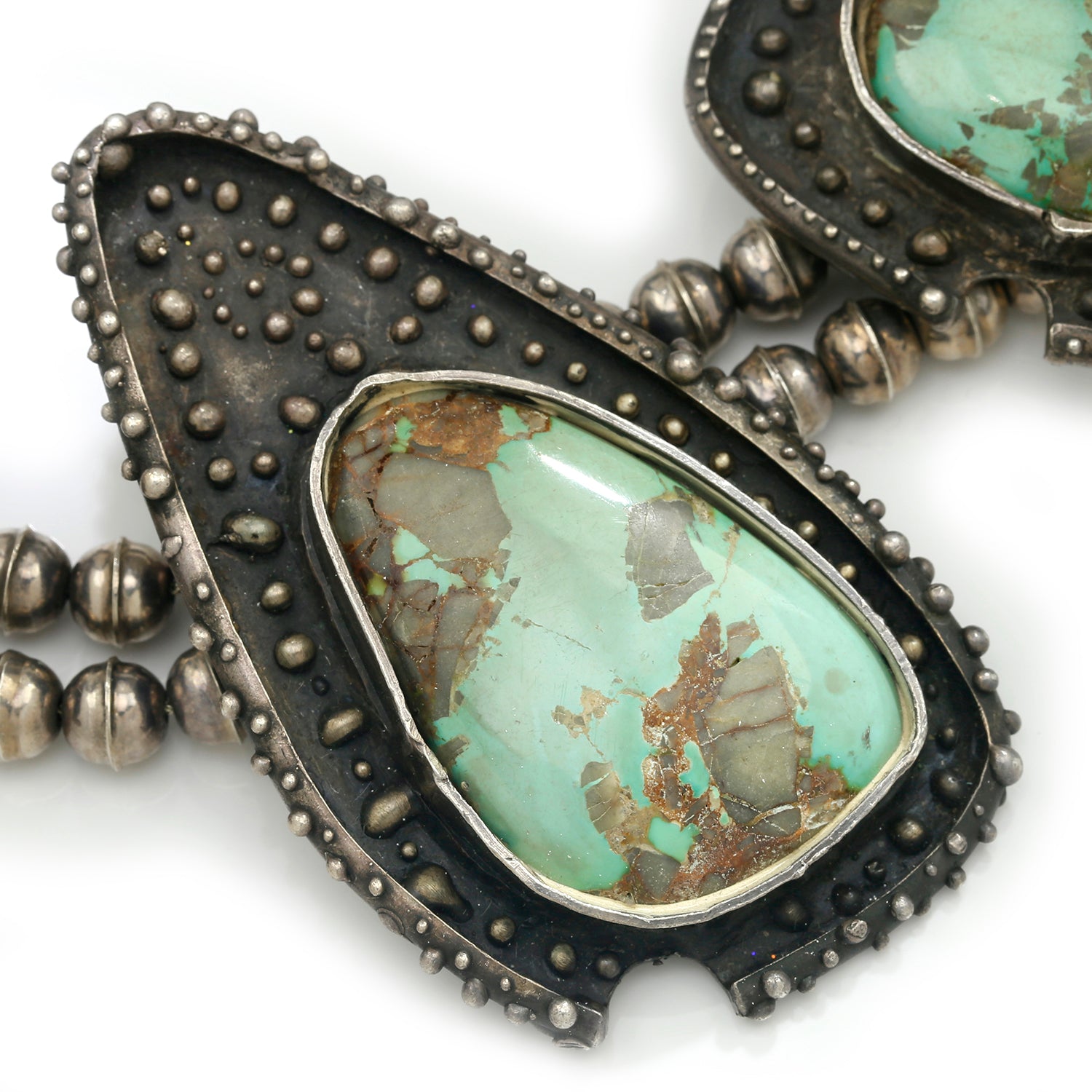 This gorgeous Navajo squash blossom is jaw-dropping! It features the largest turquoise gem at the center and eight others in freeform shapes bezel set in sterling silver. The pictures do not do this piece justice. In person, this necklace is stunning and beautifully crafted. The necklace measures about 26" in length and weighs 465.9 grams. Please ask us if you have any questions about this truly one-of-a-kind piece. It is pre-owned and in excellent condition.