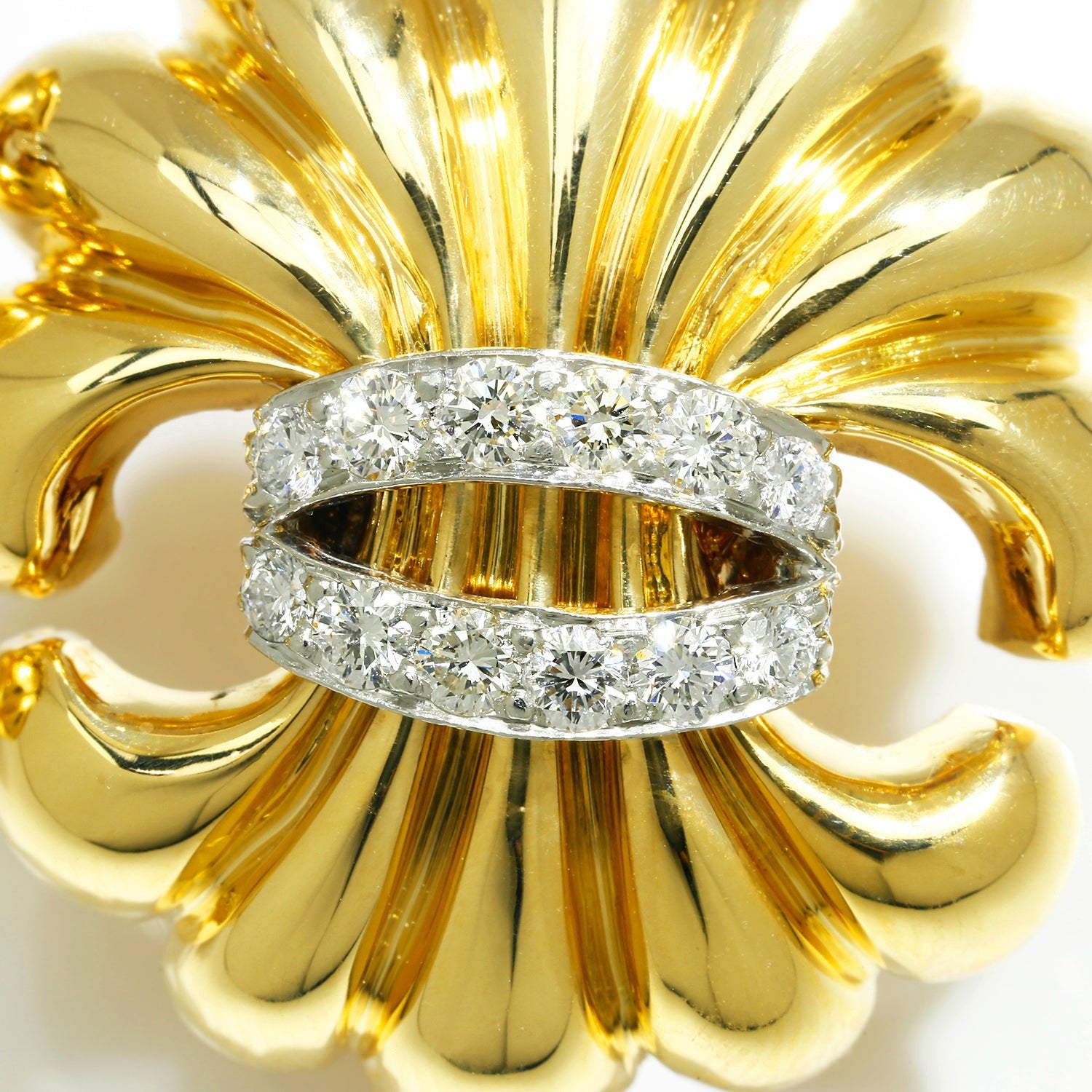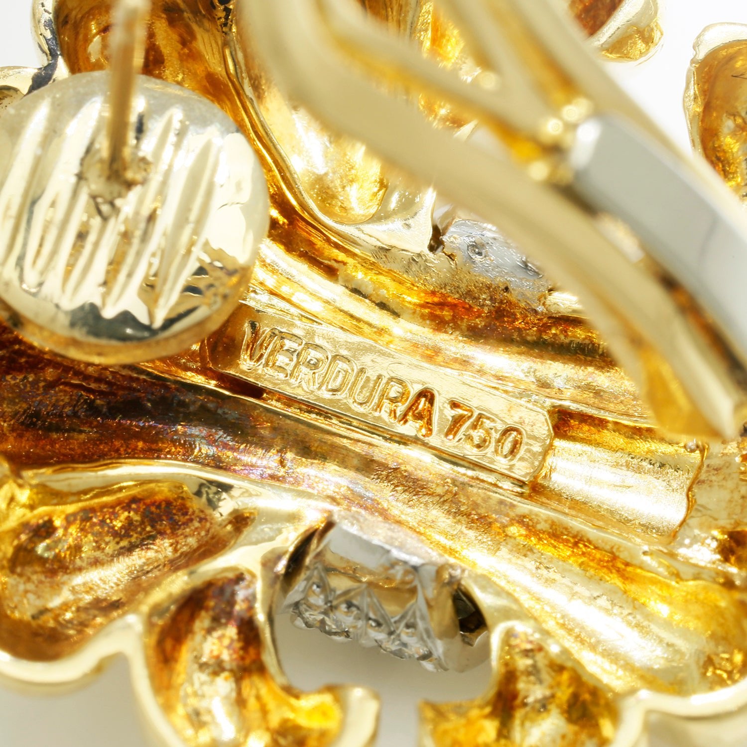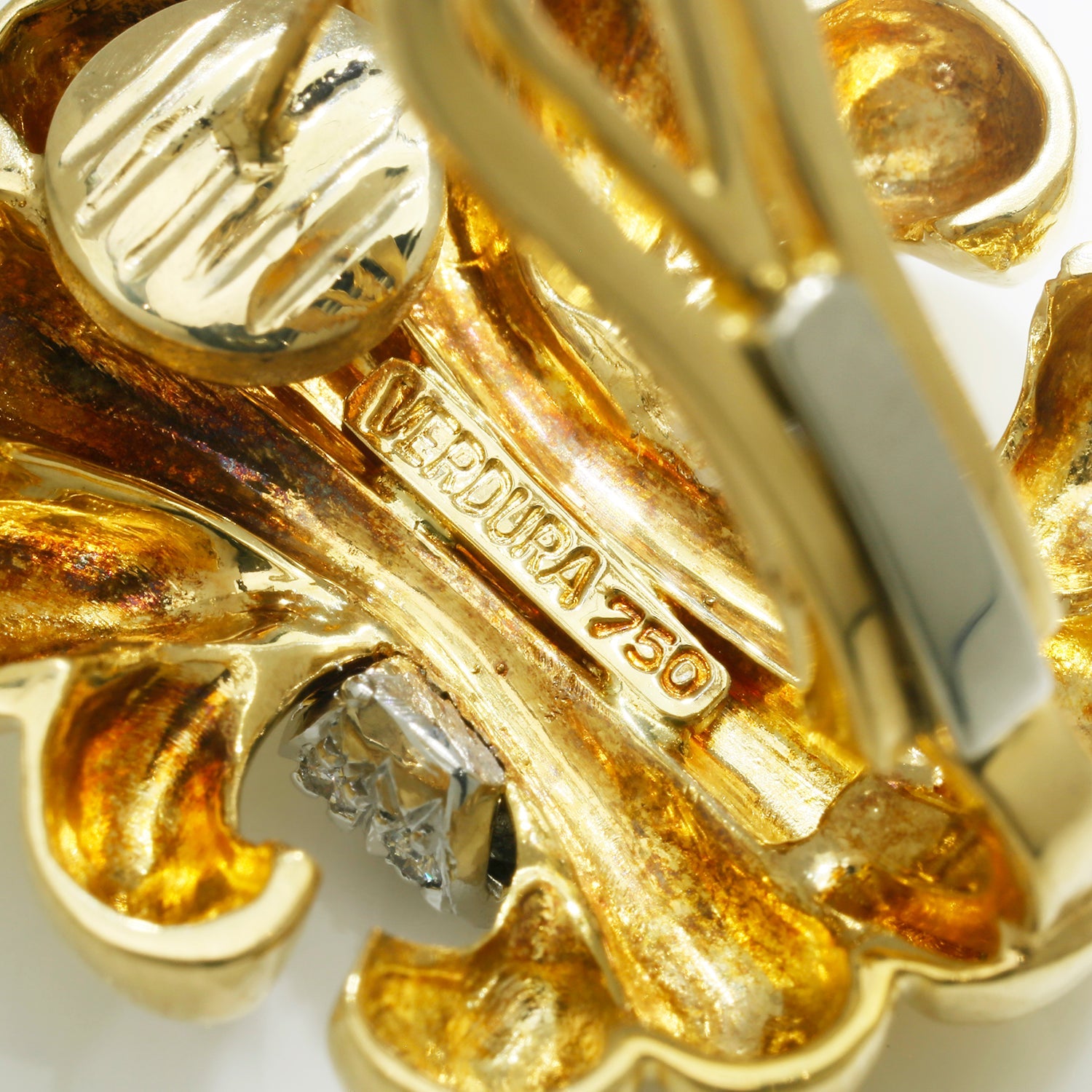 Verdura is a fine jewelry house founded in New York in 1939 and first gained worldwide recognition for designing jewelry for Coco Chanel. The Italian design house is known for bold designs, natural motifs, and fine craftsmanship. These Fleur-de-Lis style earrings are a lovely example of this designer's style. They are 18kt yellow gold with diamonds encrusted in platinum. They weigh 36.5 grams and are encrusted with the highest quality diamonds weighing nearly 1 1/2 carats. The 'VERDURA' stamp is clearly inscribed on their interiors and is pictured. They measure 1 1/16" in length and width. These are pre-owned and in excellent condition.