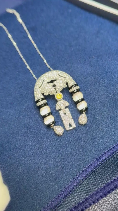 This one-of-a-kind pendant is solid 18kt white gold encrusted with natural diamonds, black onyx, and frosted crystal with a brilliant yellow sapphire in the center. The yellow sapphire weighs about 0.30 carats and is bezel-set. This Art Deco style pendant is paired with an 18" 14kt white gold chain and dangles from it beautifully. It is a striking piece and expertly crafted. The pendant measures 1 1/2" long, 1 1/8" wide, and weighs 21.1 grams. It is pre-owned and in excellent overall condition.