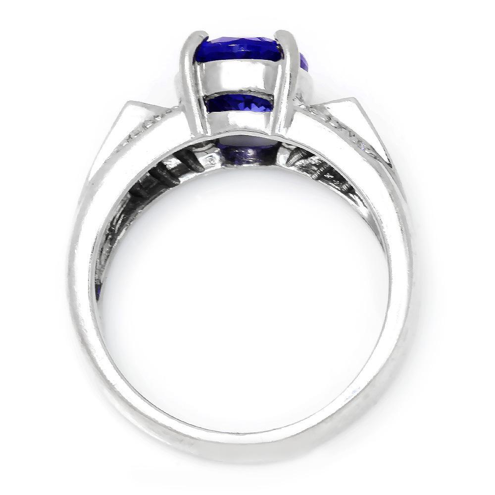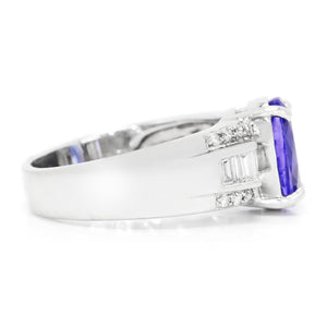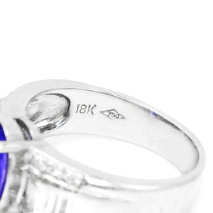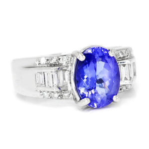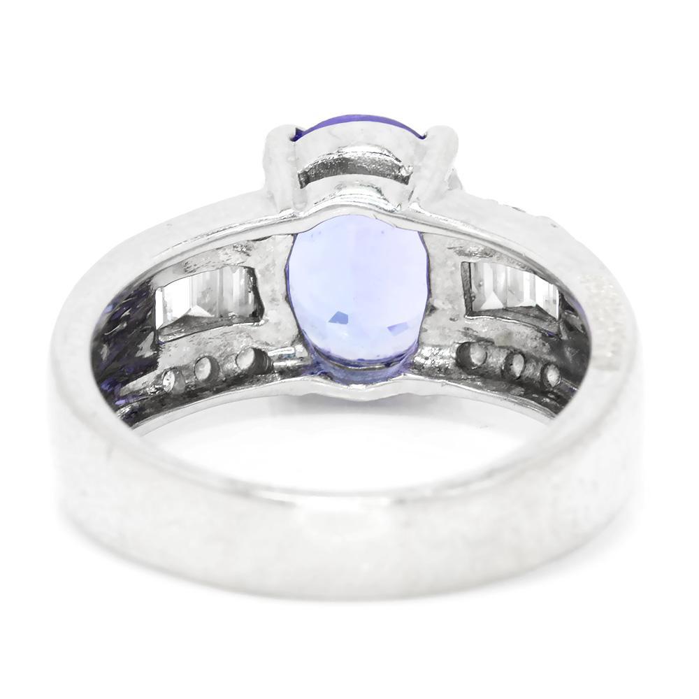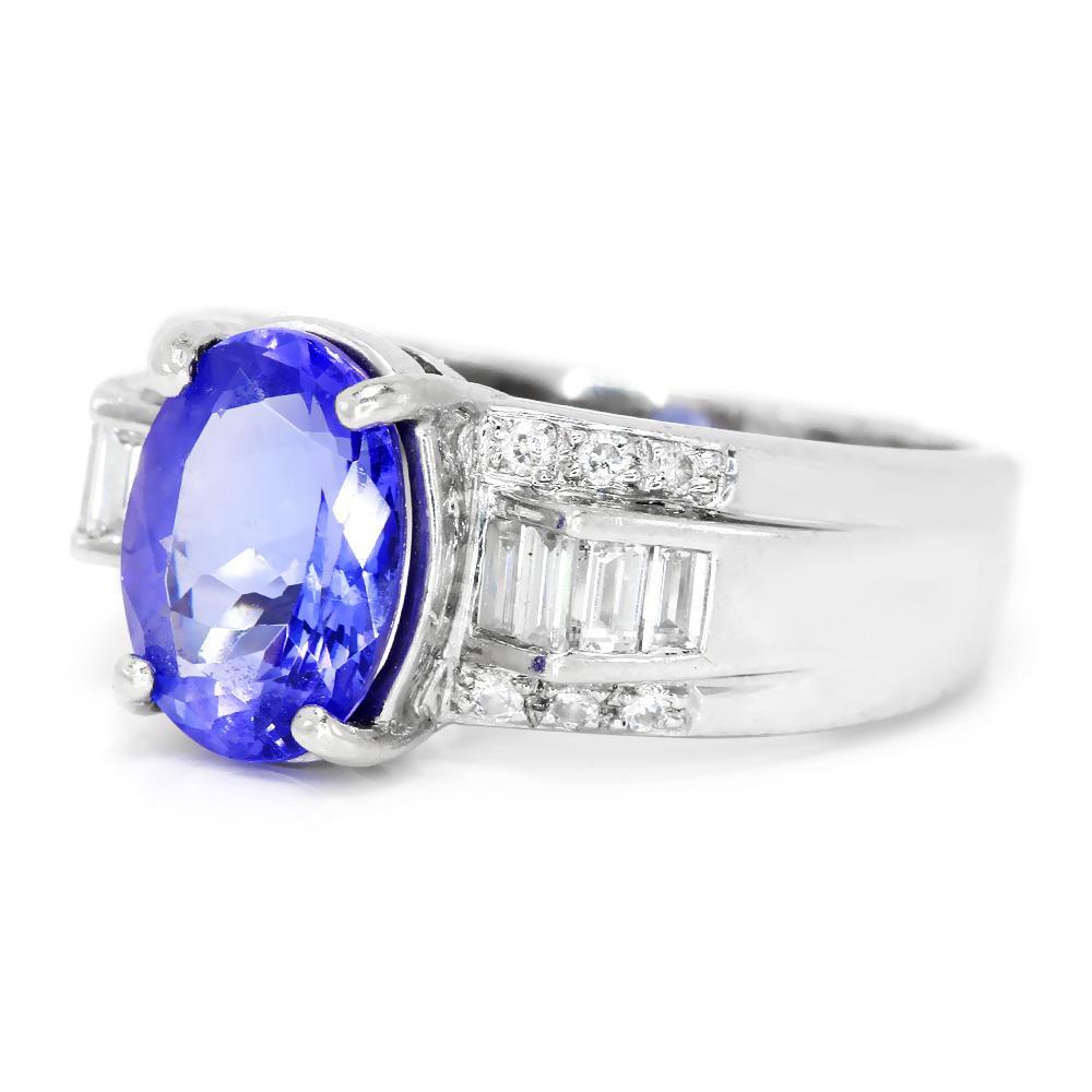 This setting appears as if it was made for this tanzanite gemstone as it fits and looks perfect in it. The setting is made of solid 18kt white gold and at the center rests an oval cut natural tanzanite in 4-prong setting exhibiting a vivid bluish violet hue and weighs about 2.25 carats. It is flanked by an interesting combination of diamonds to its East and West. Baguette cut diamonds rise like mountains in channel settings on each side of the Tanzanian gemstone and then round diamonds are nestled on each side of the baguettes bringing the total diamond weight to about .38 carats. The ring weighs 8.1 grams and is currently a size 7.5 and can be resized. This ring is pre-owned and in spectacular condition.