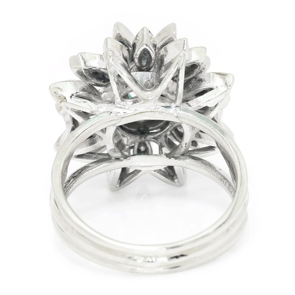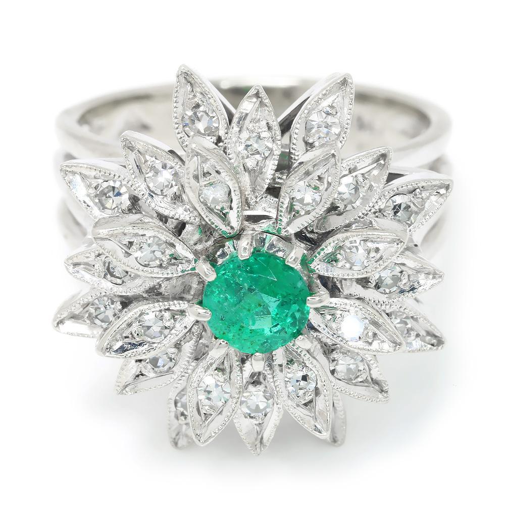 This irresistible vintage flower ring boasts a beautiful green emerald at its center surrounded by 3 tiers of diamond encrusted petals. The round cut emerald exhibits an intense green hue and weighs about .45 carats resting in a sturdy 8-prong setting. There are 24 marquise shaped petals with 1 single cut diamond bead set into each one. The petals are arranged in such a way that each one is clearly visible. Milgrain beaded edges are detailed around the edge of the petals which adds a certain textural quality. The solid 14kt white gold ring weighs 9.0 grams and is currently a size 6.75 and can be resized. It is in excellent condition.