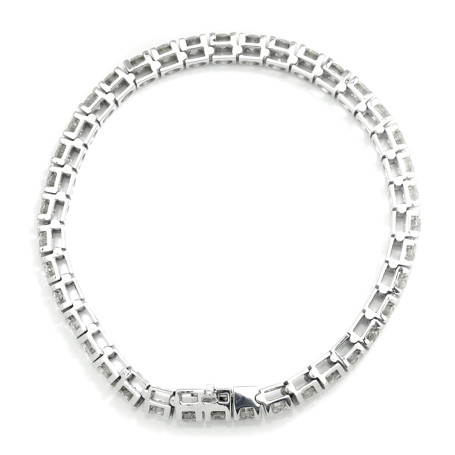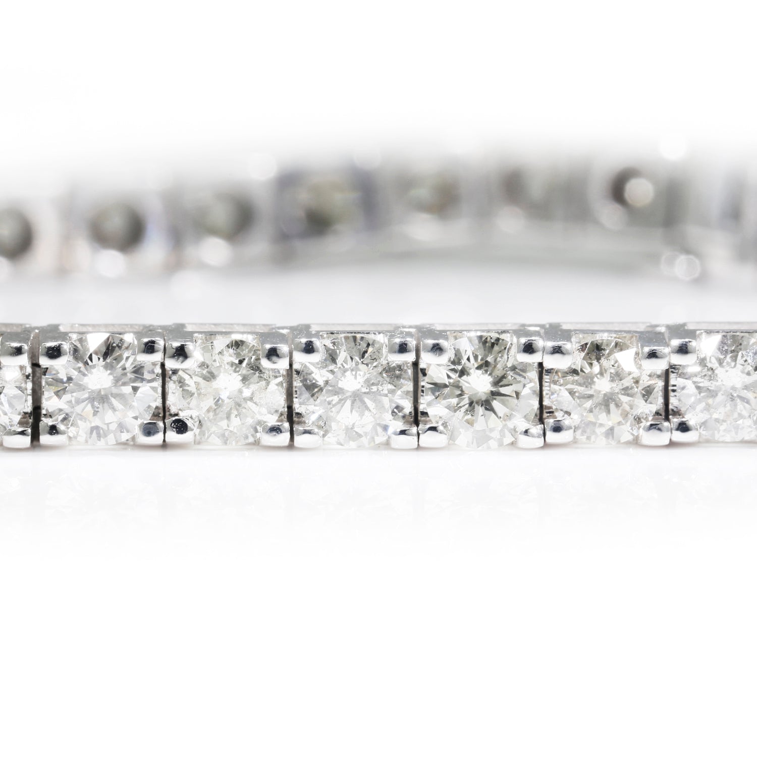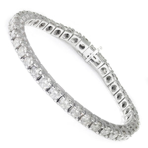 A beautiful line of round brilliant cut natural diamonds streams across the surface of this tennis bracelet made of solid 14kt White gold. Set in 4-prong settings, these nestled diamonds are beautifully matched in color and clarity and weigh 10.00 carats in total weight. The bracelet measures 7 inches long and uses a secure box clasp with a safety catch for closure. It is brand new!