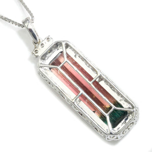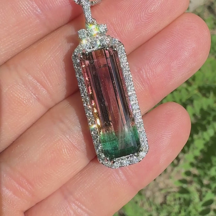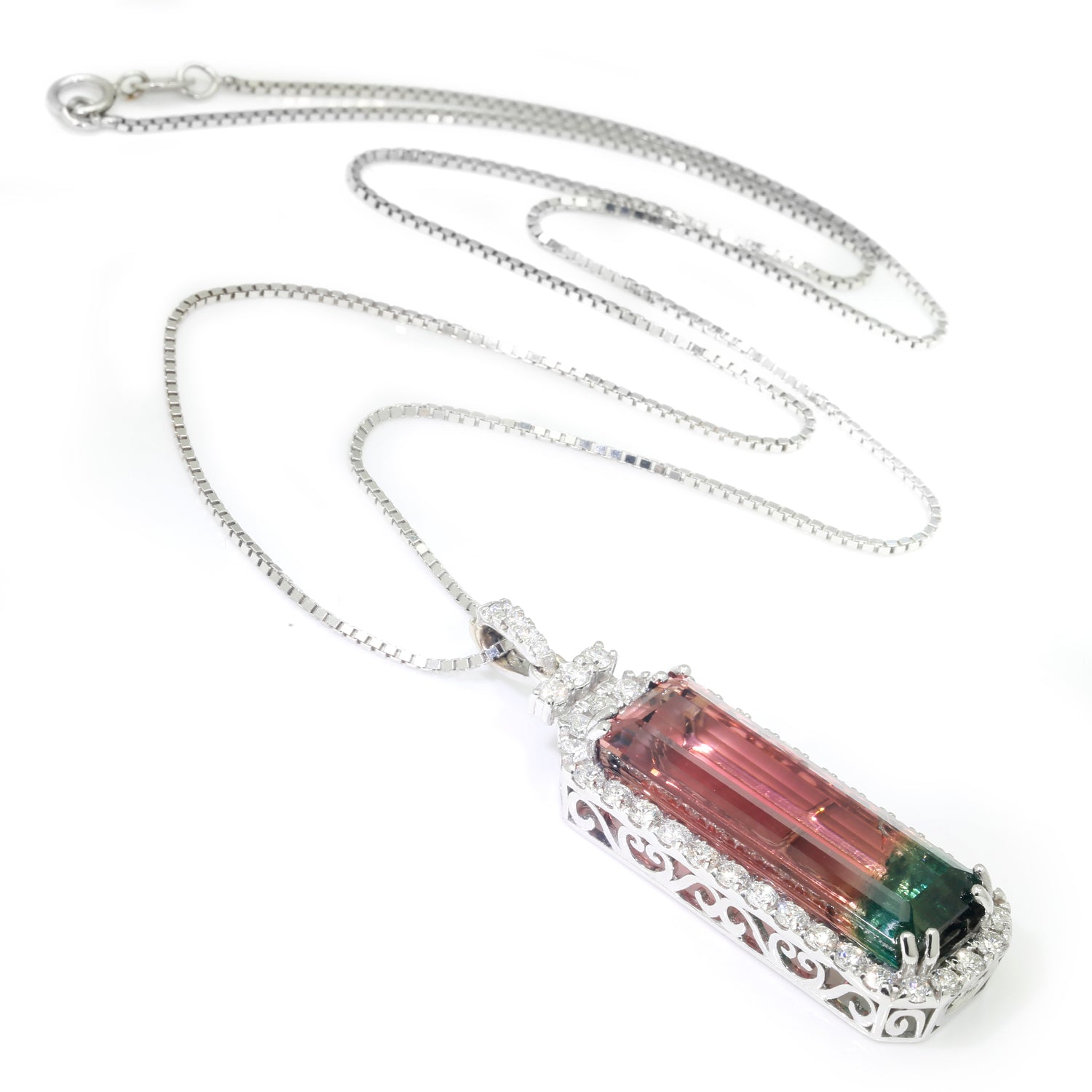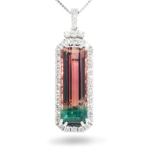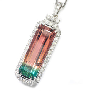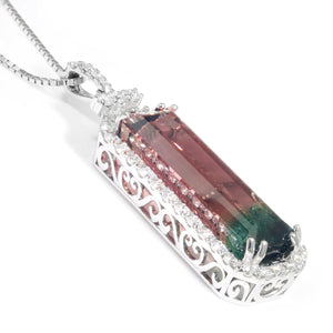 This exquisite bi-color tourmaline is perfectly fitted for this diamond-encrusted pendant setting. The long and narrow natural tourmaline exhibits a lovely reddish-pink hue, which ends in a rich forest green at its base. The gem weighs 16.37 carats. It is faceted to exhibit its varying shades of its natural color spectrum, as well as its naturally occurring striations and inclusions. It is surrounded by natural, brilliant-cut diamonds weighing over 1.00 carats. The 14kt white gold pendant measures 1 5/8" in length and 1/2" in width. An elegant white gold box chain will be included with the pendant. This is brand new.