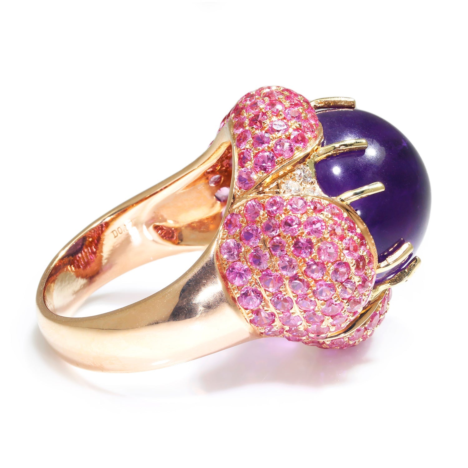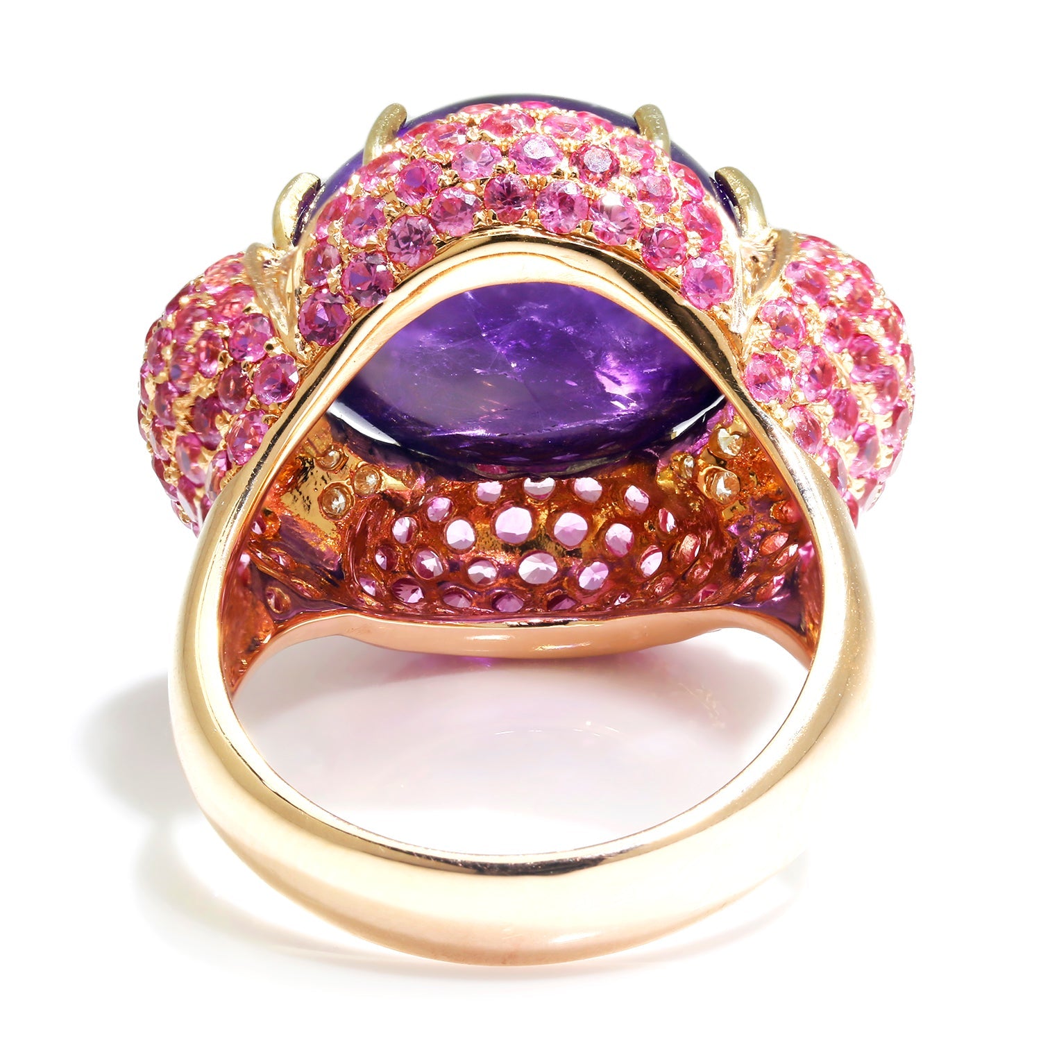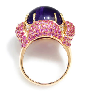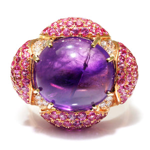 This bold statement ring boasts an 11.62-carat natural amethyst surrounded by pink sapphires and diamonds in rose gold. The intense purple amethyst is a cabochon cut displaying varying shades of purple. It has an internal slice inclusion running through the gemstone, which is entirely natural and does not compromise its structural integrity. Over 3 1/2 carats of natural pink sapphires and just over 0.15 carats of natural diamonds accent this ring. It is crafted of solid 18kt rose gold weighing 11.7 grams. This was purchased from a unique estate in New York with extensive gemstone jewelry and is still in excellent overall condition. It is a size 7.25, and we offer complimentary resizing.