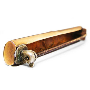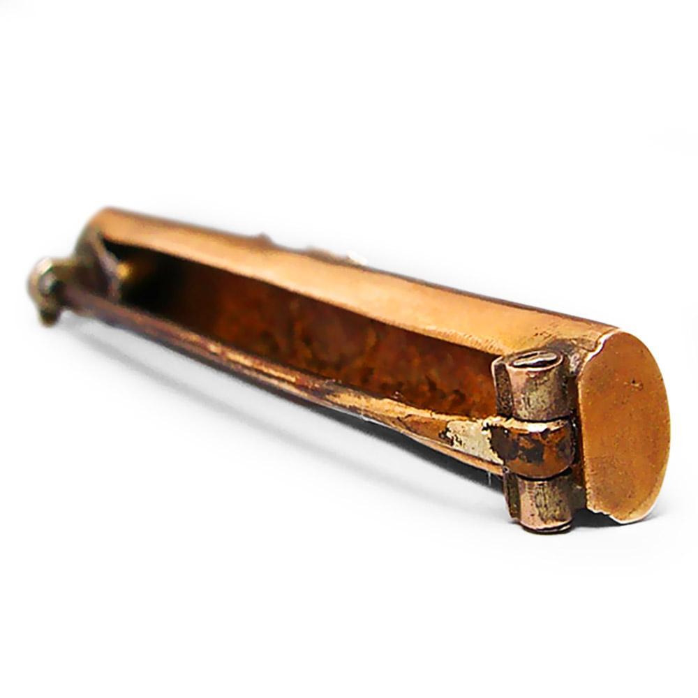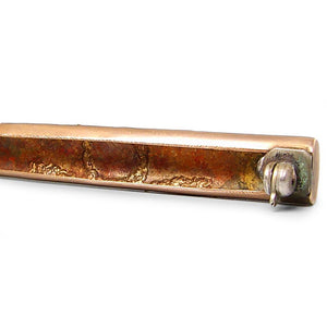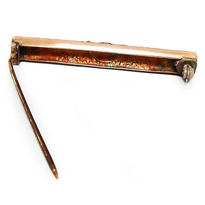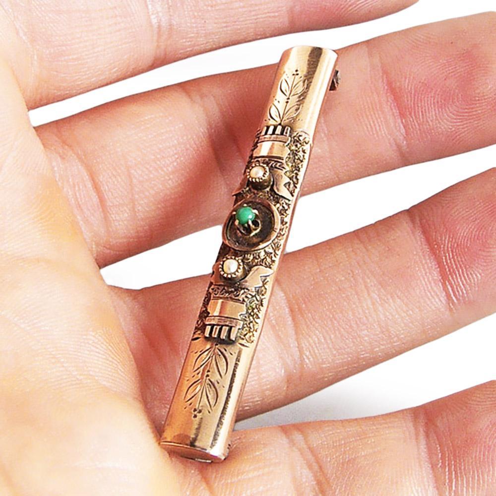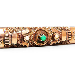 Featured is an intricately detailed antique bar pin crafted in the early 1900s boasting a green jade gemstone at its center flanked by 1.50mm seed pearls to its East and West sides. The brooch is cast of solid 10kt (417) rose gold weighing 3.7 grams. It measures about 2" long and 7.45mm in width. It is in great condition with signs of tarnish and wear consistent with its age. It's a one-of-a-kind bar pin that would stand out in any collection..