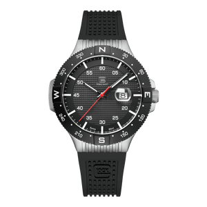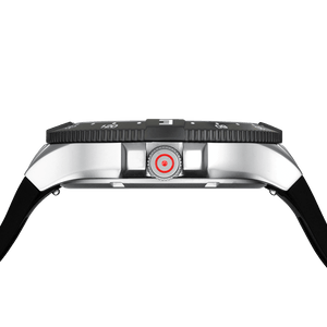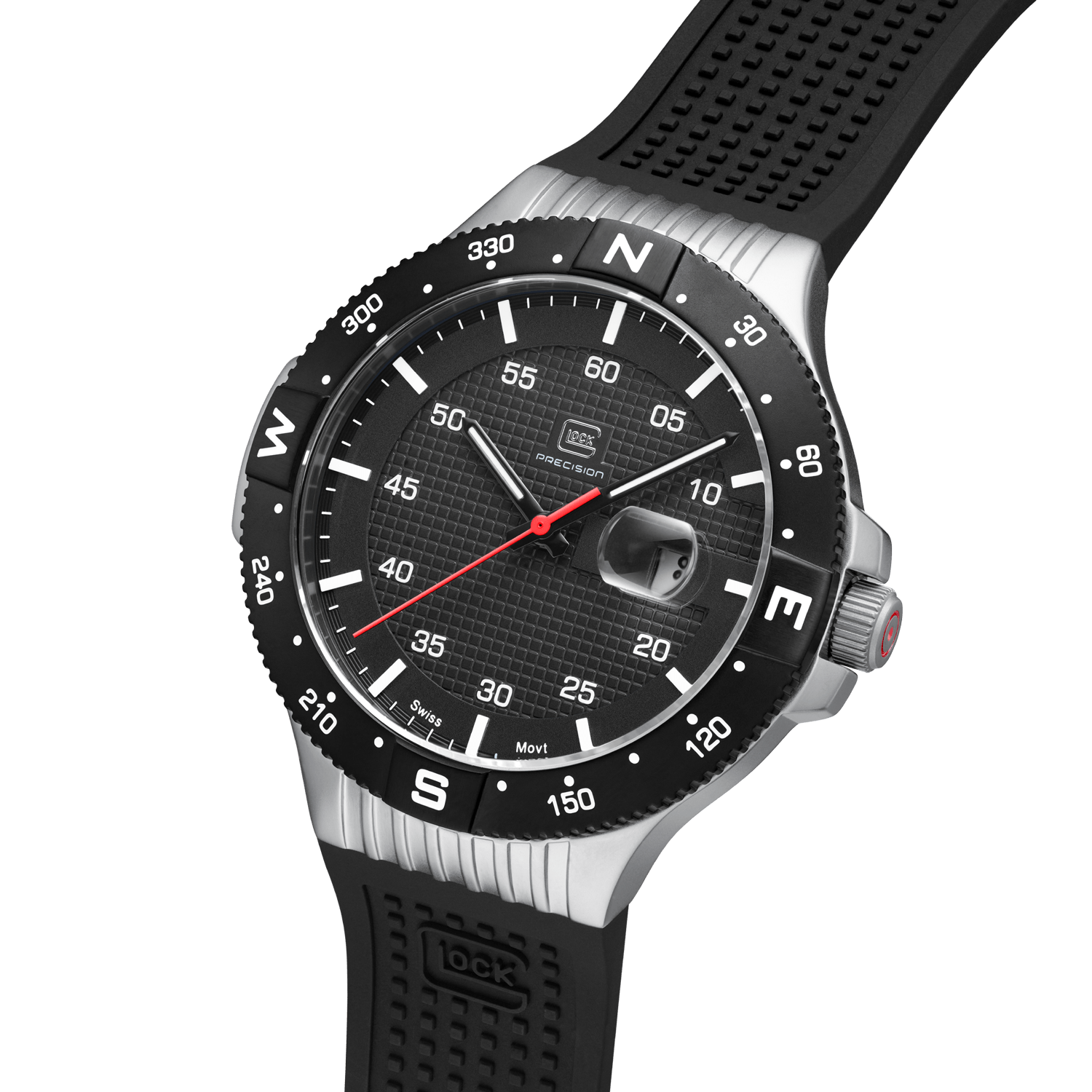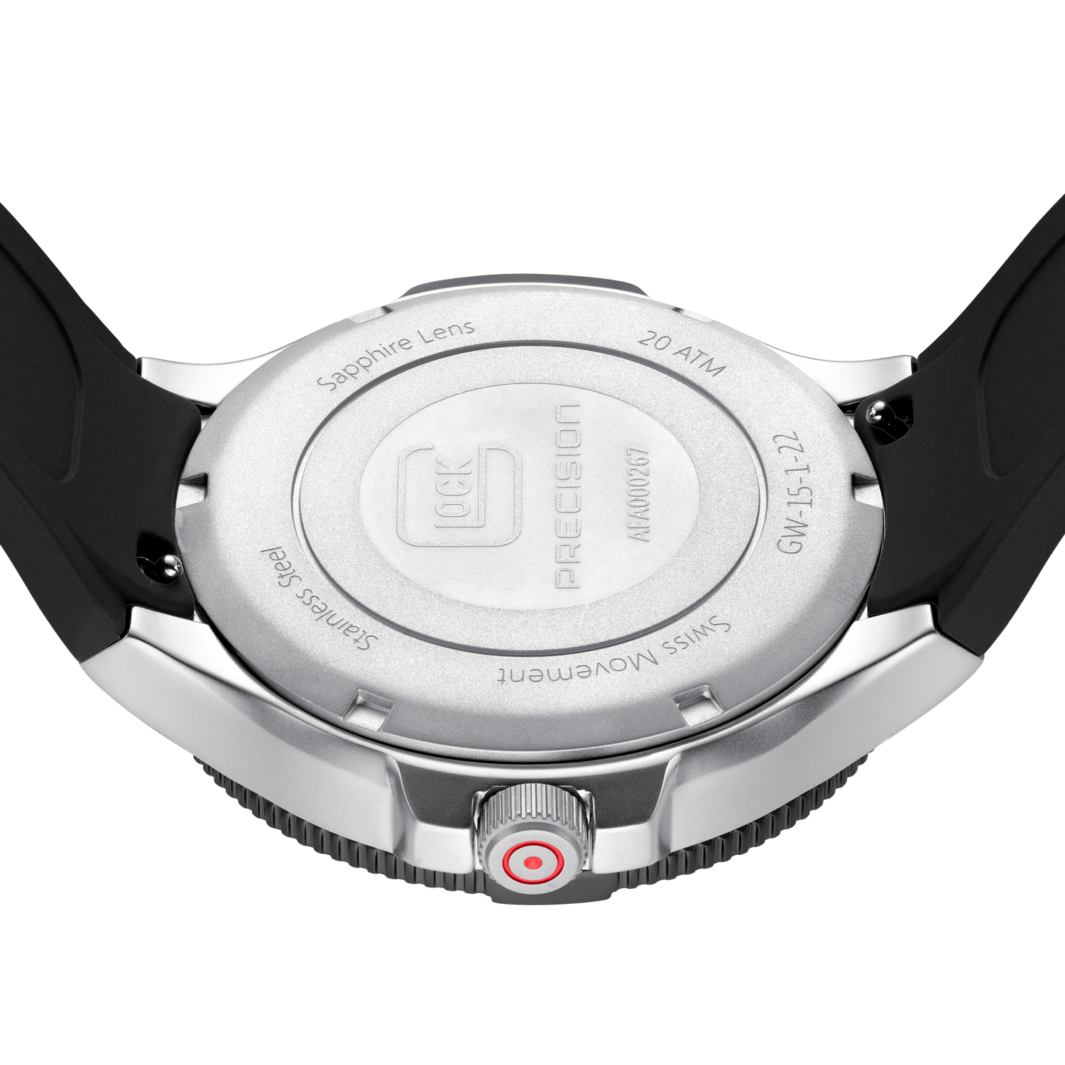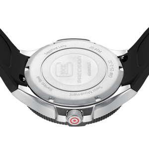 Bridging traditional craftsmanship with contemporary touches, the GW-15-1-22 stands as a visual masterpiece. Housed in a sandblasted stainless steel case, its deep black metal dial gleams, illuminated by Swiss luminous hands and a striking red second hand. A GLOCK RTF-structured black silicone strap gracefully encircles the wrist, while its precision is ensured by a Swiss movement. Boasting a 20 ATM water resistance, this watch embodies durability, resilience, and enduring elegance.
