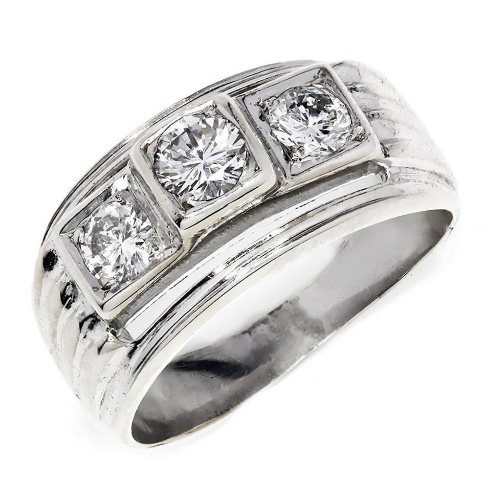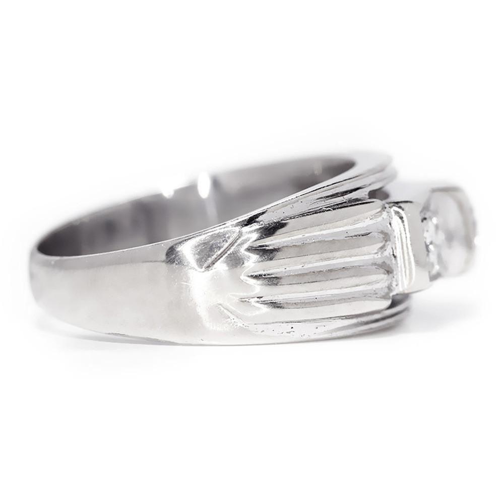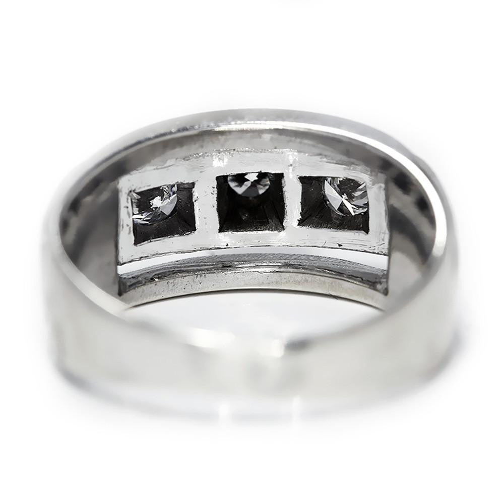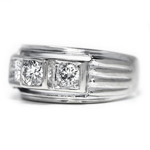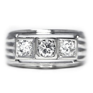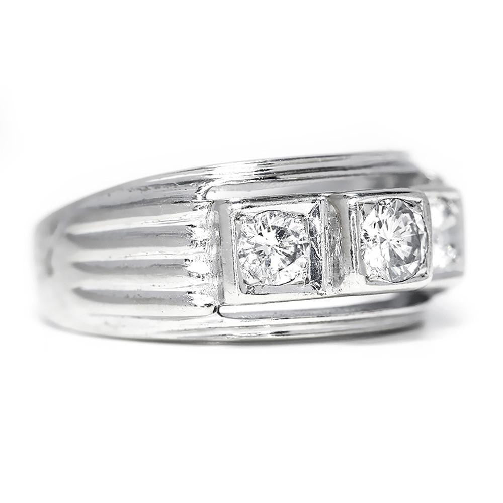 This vintage engagement ring features 3 round brilliant cut natural diamonds across the rings face followed by a ribbed design on their East and West sides giving the ring both depth and a textural quality. The diamonds weigh approximately 1/2 carat total in weight and are near colorless and eye clean. It's currently a size 5.5 and we offer free resizing. This usually takes an extra day to perform for you. The band is wide at 8.45mm yet the width is a compliment to the design as it frames and showcases the 3 diamonds in a structured exhibition style. It was crafted in the 1960s and is in good condition with normal signs of wear consistent with its age.