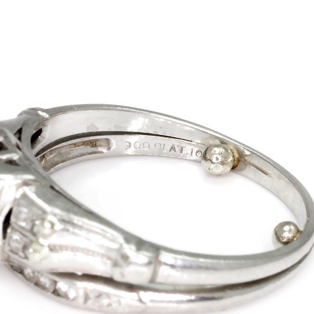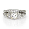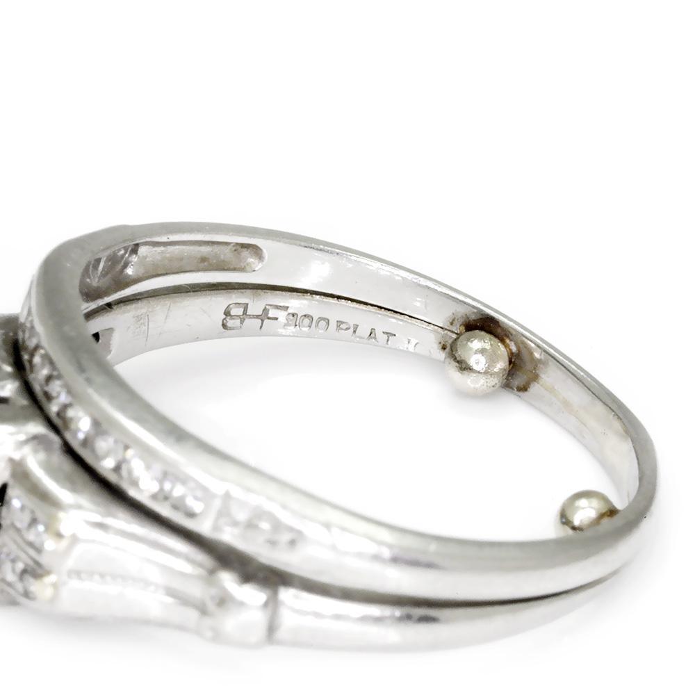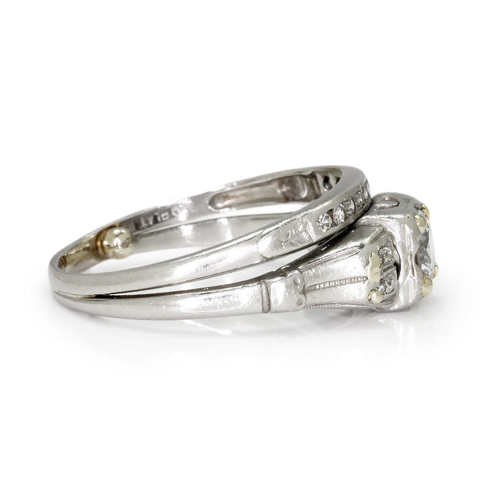 This gorgeous Art Deco diamond engagement ring is accompanied by a lovely straight diamond band where both rings are made of platinum and are soldered together. The center diamond in the engagement ring weighs approximately .40 carats and is H in color (near colorless) and VS2 in clarity (completely eye-clean). It is flanked by accent diamonds to its East and West sides in a cathedral style setting. The band is encrusted with 10 single cut natural diamonds in a channel setting. The rings are about a size 4.5 right now with the sizing balls. We would be happy to remove the sizing balls to resize the set upon request. We would also be separate the rings upon request at no extra charge. The set is in Excellent condition considering that it was crafted in the 1920s.