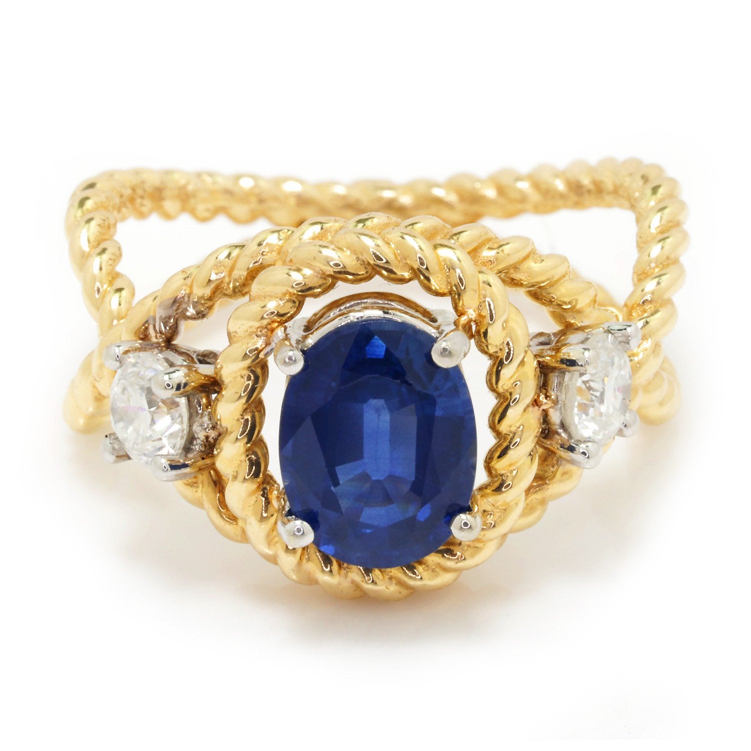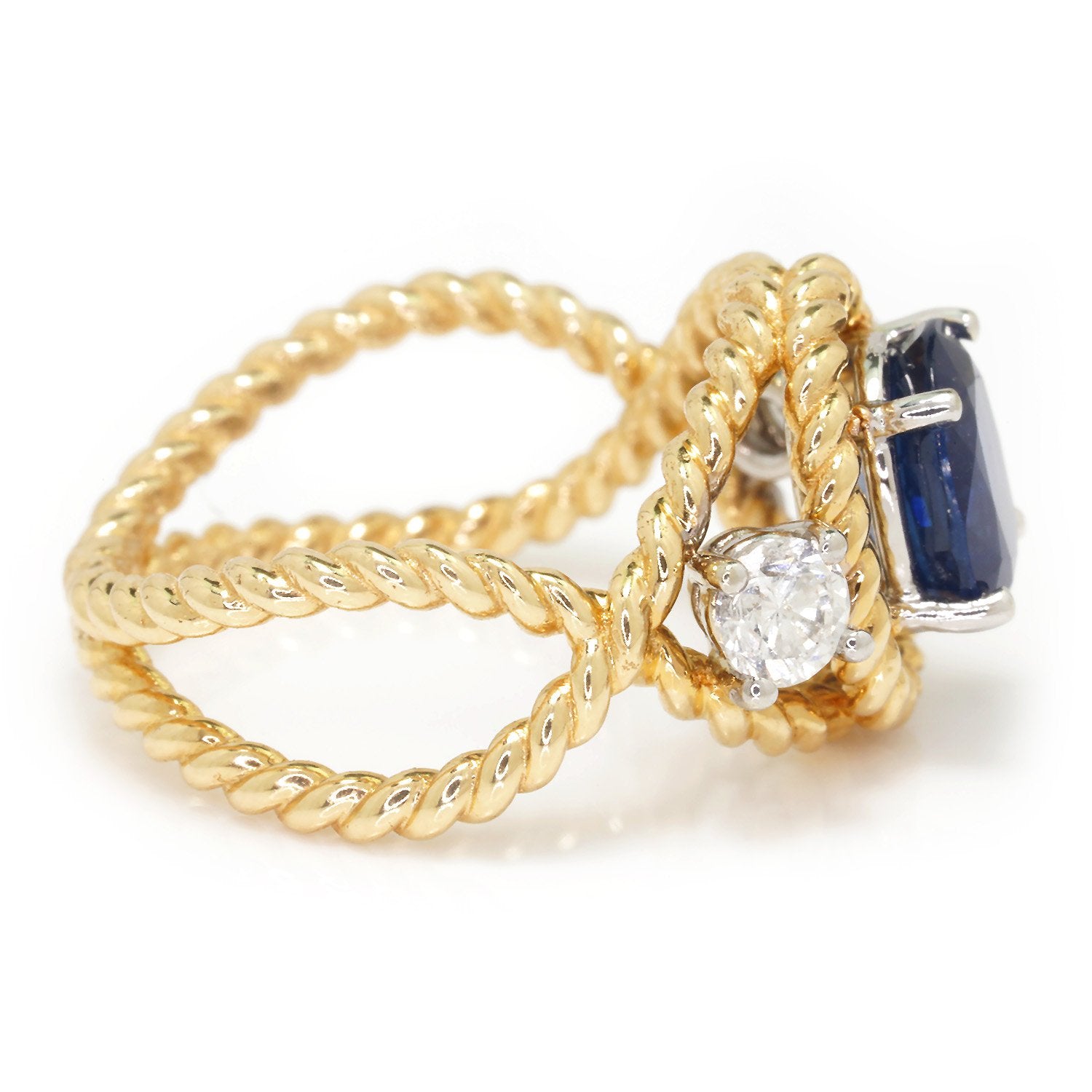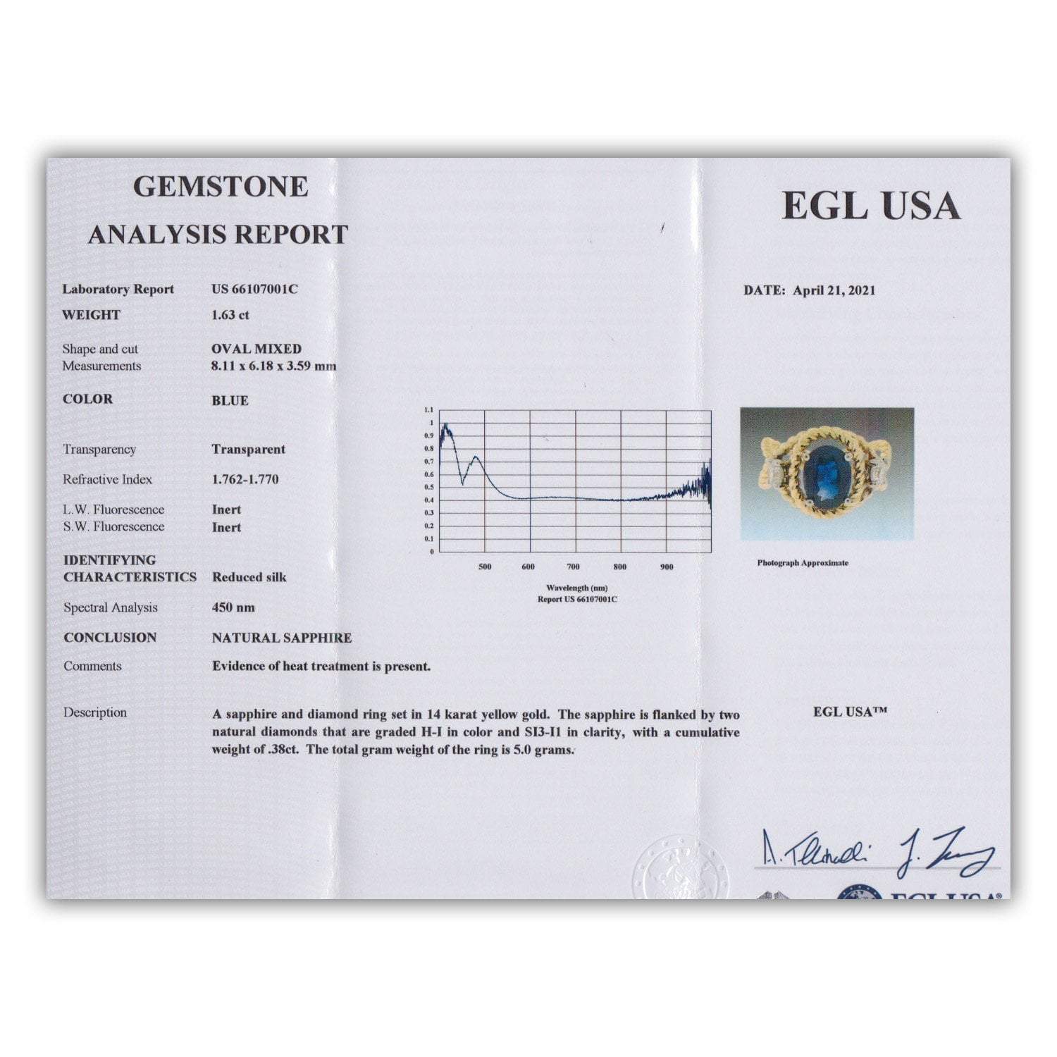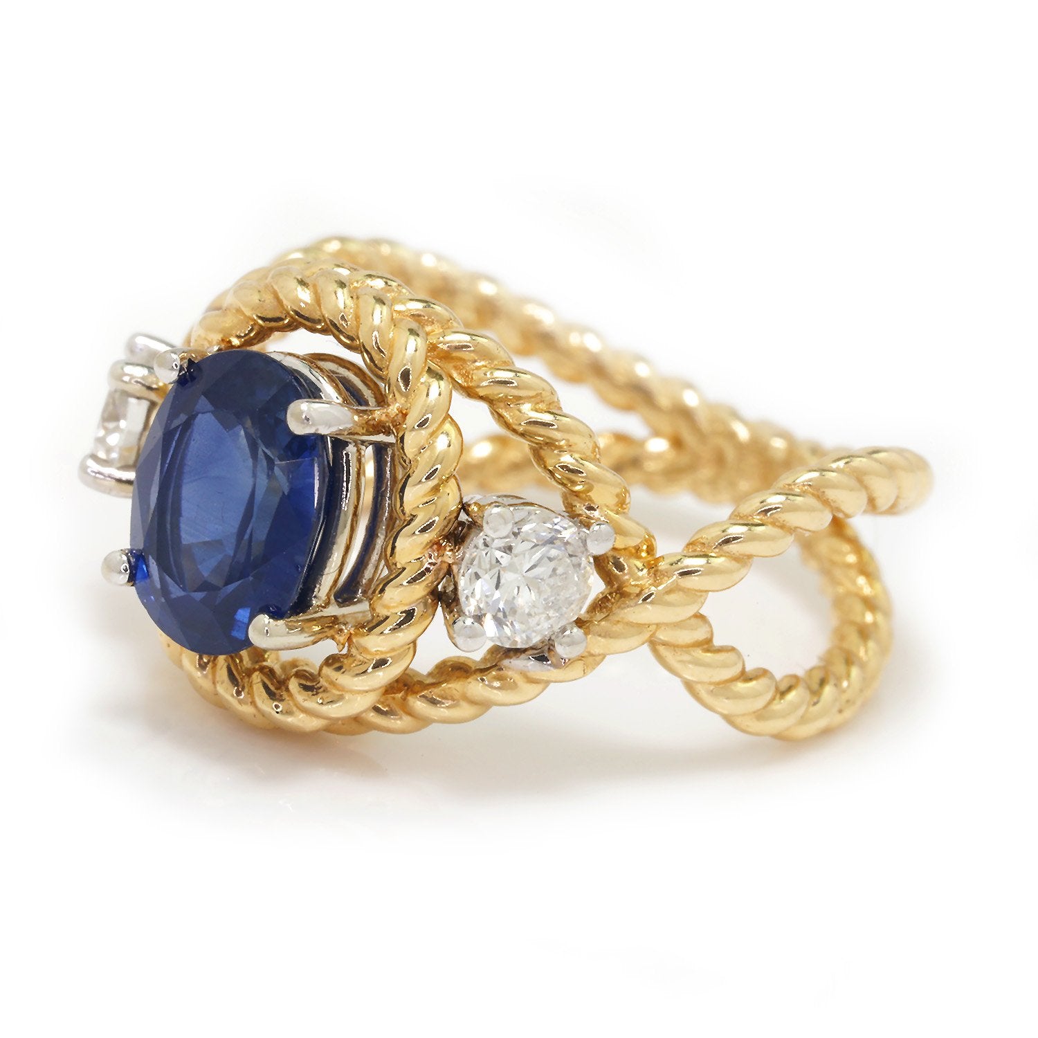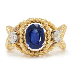 An intricate and lovely gold rope swirls around a striking oval cut natural sapphire and accent round diamonds. The vintage ring has been certified by EGL USA to contain a natural blue sapphire weighing 1.63 carats with evidence of heat treatment and appraised by UGS for $4,925. The accent natural diamonds weigh 0.38 carats total and are set in sturdy white gold settings along with the sapphire. The solid 14kt yellow gold rope is made for a 5.75 ring size and is not resizable. The beautiful blue September birthstone looks absolutely radiant next to the rich gold and brilliant diamonds. It's pre-owned and in Excellent condition.