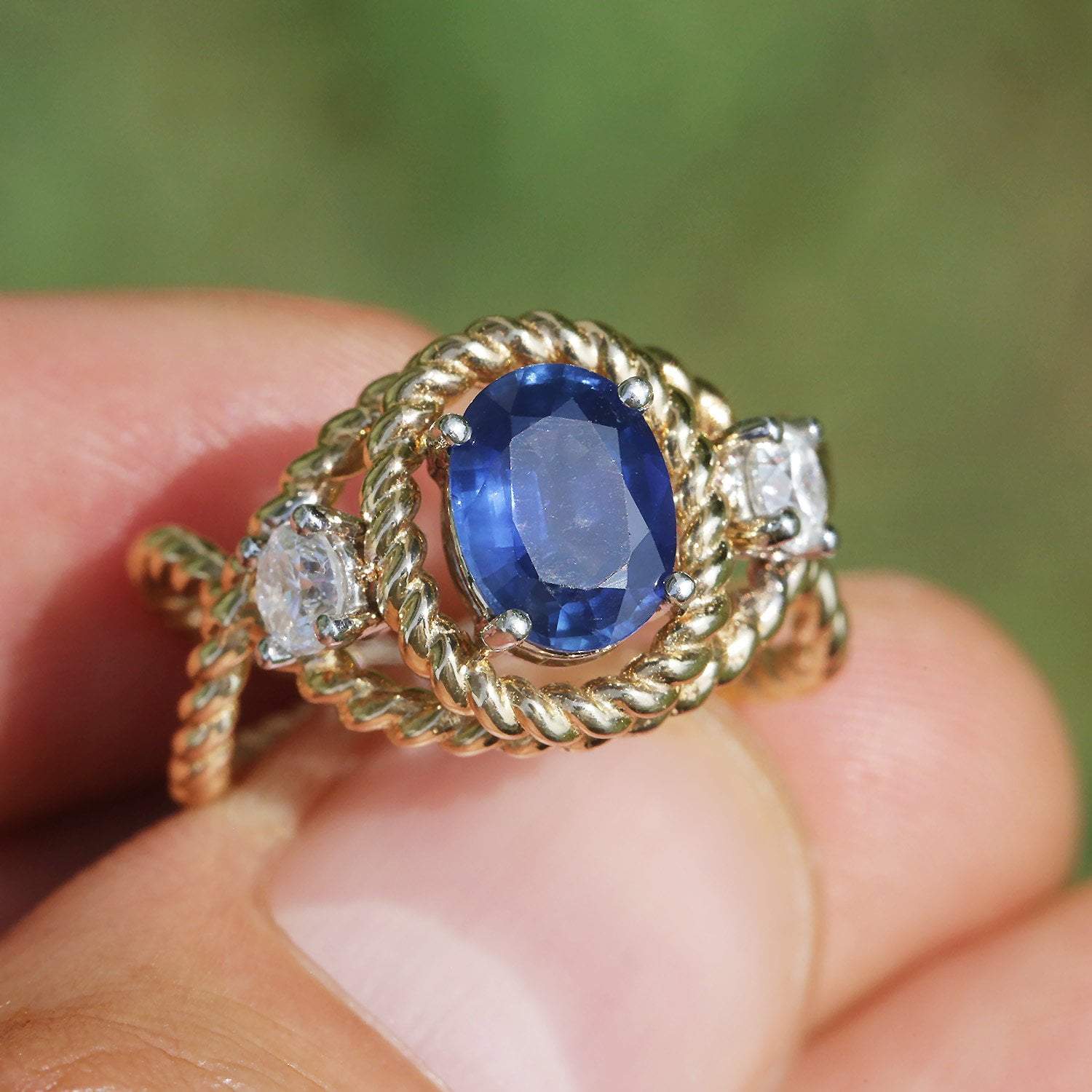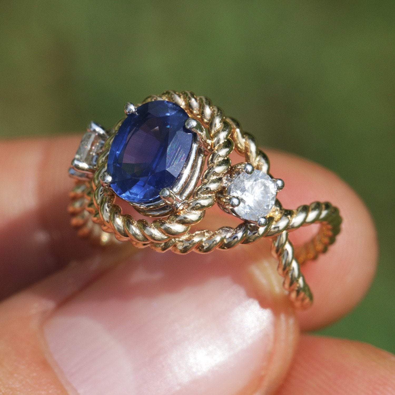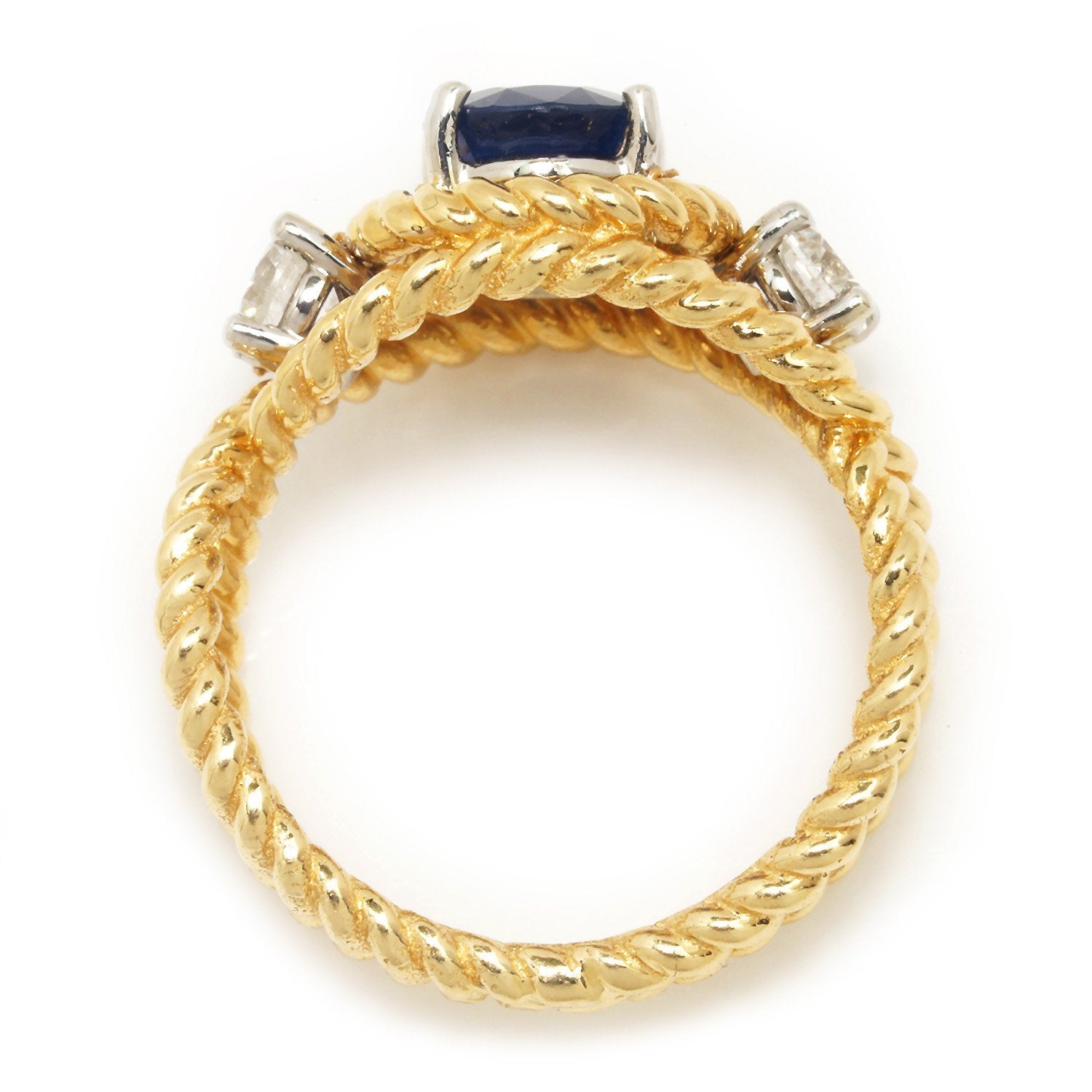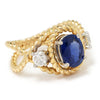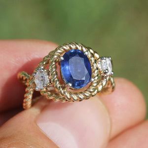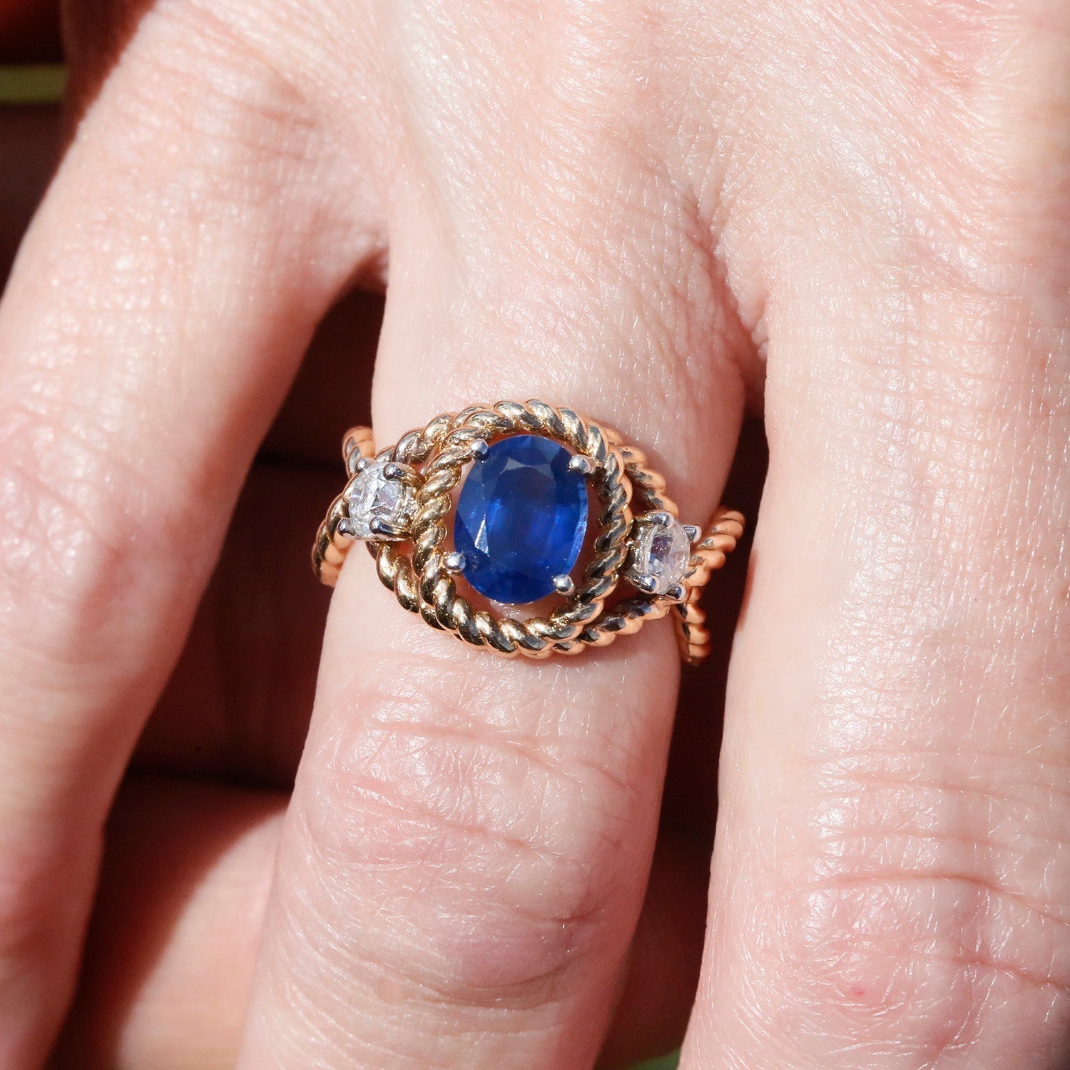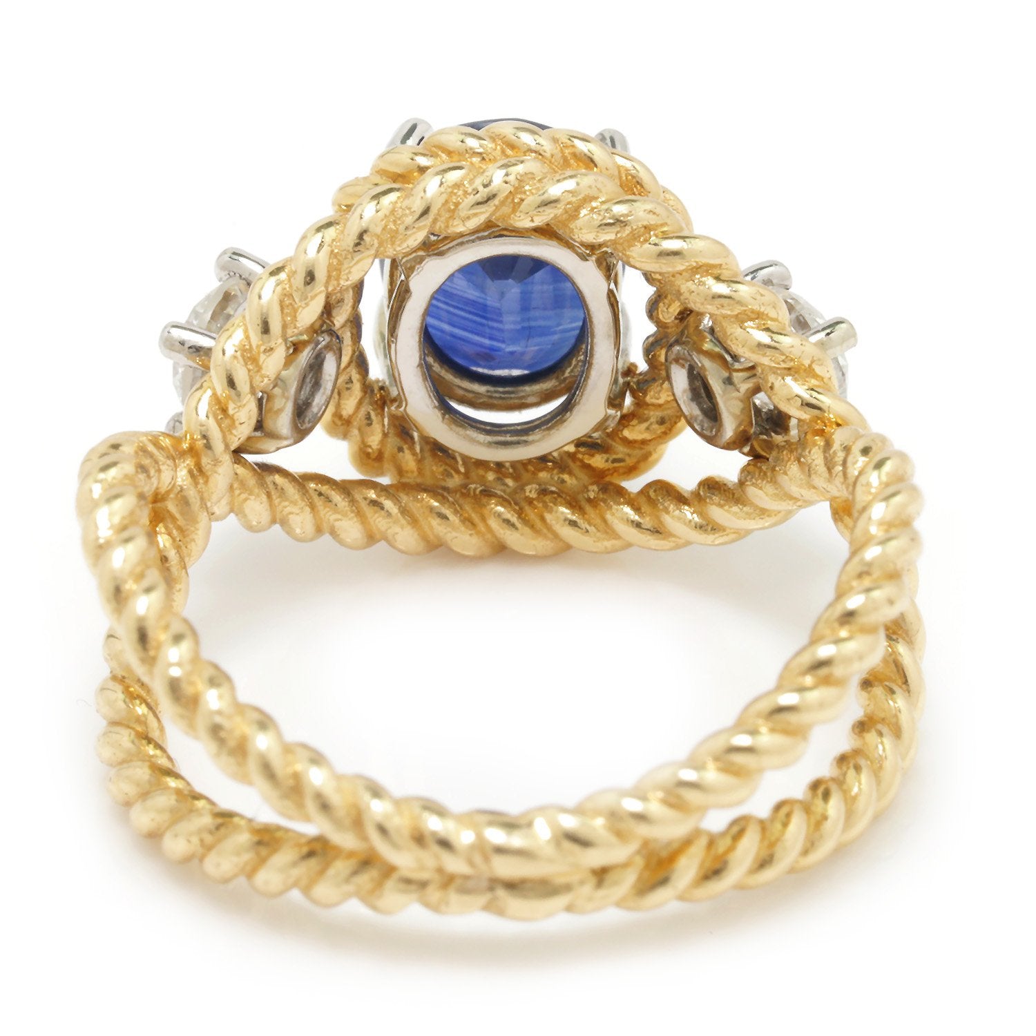 An intricate and lovely gold rope swirls around a striking oval cut natural sapphire and accent round diamonds. The vintage ring has been certified by EGL USA to contain a natural blue sapphire weighing 1.63 carats with evidence of heat treatment and appraised by UGS for $4,925. The accent natural diamonds weigh 0.38 carats total and are set in sturdy white gold settings along with the sapphire. The solid 14kt yellow gold rope is made for a 5.75 ring size and is not resizable. The beautiful blue September birthstone looks absolutely radiant next to the rich gold and brilliant diamonds. It's pre-owned and in Excellent condition.