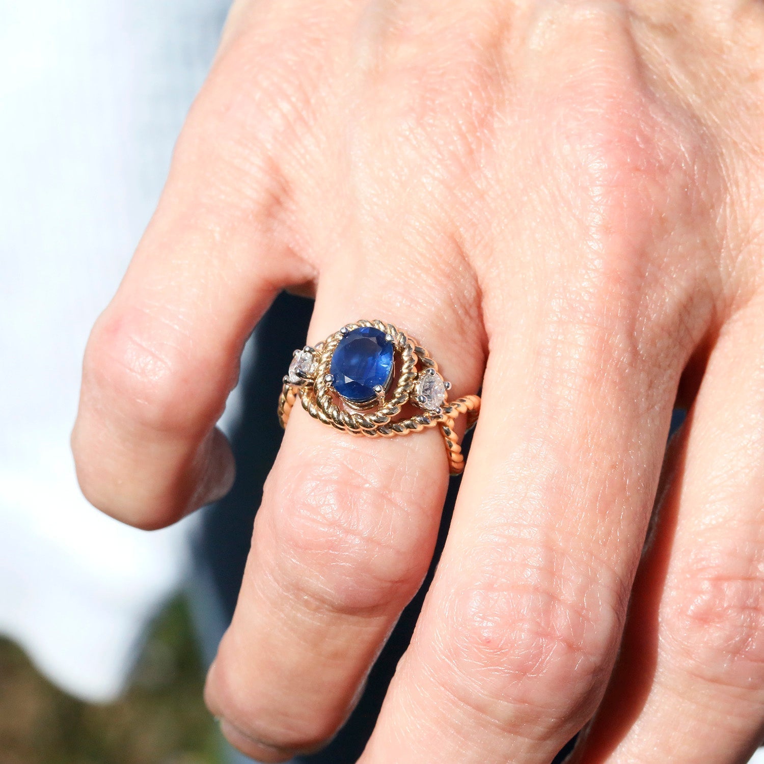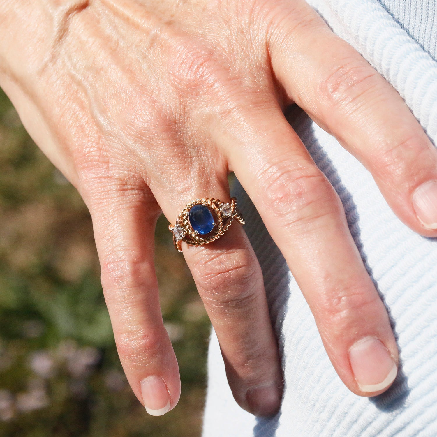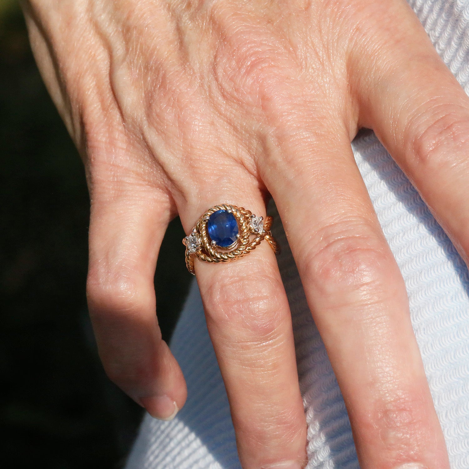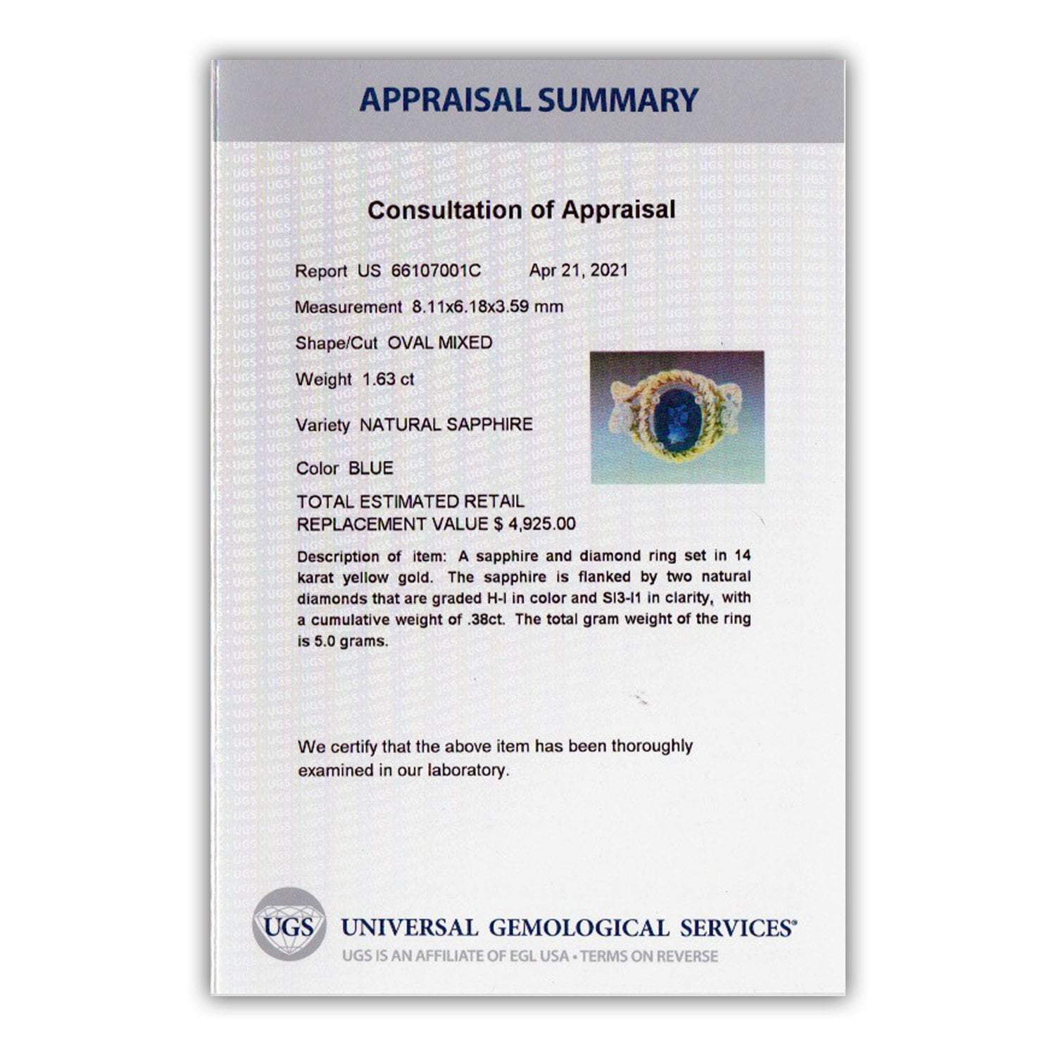 An intricate and lovely gold rope swirls around a striking oval cut natural sapphire and accent round diamonds. The vintage ring has been certified by EGL USA to contain a natural blue sapphire weighing 1.63 carats with evidence of heat treatment and appraised by UGS for $4,925. The accent natural diamonds weigh 0.38 carats total and are set in sturdy white gold settings along with the sapphire. The solid 14kt yellow gold rope is made for a 5.75 ring size and is not resizable. The beautiful blue September birthstone looks absolutely radiant next to the rich gold and brilliant diamonds. It's pre-owned and in Excellent condition.