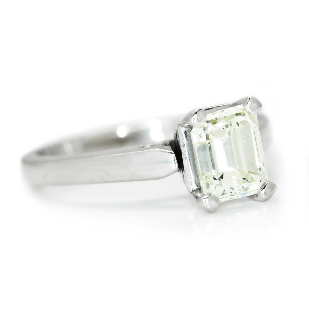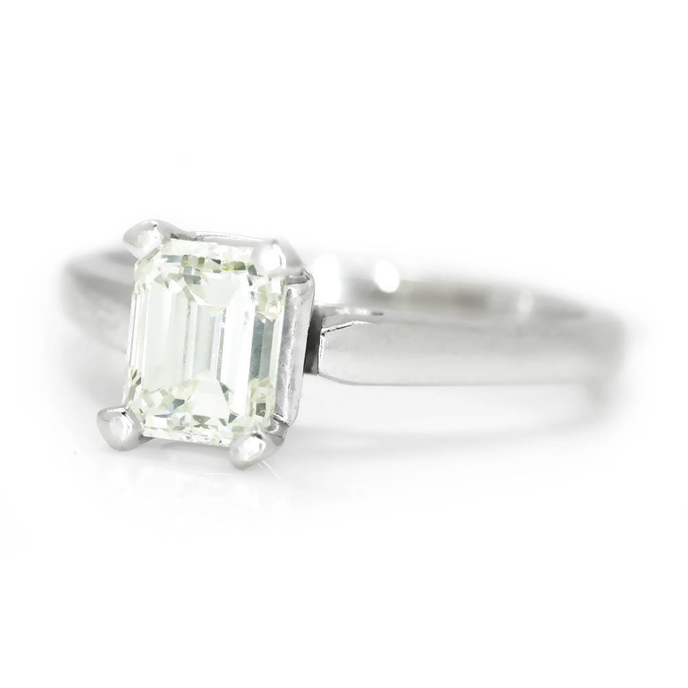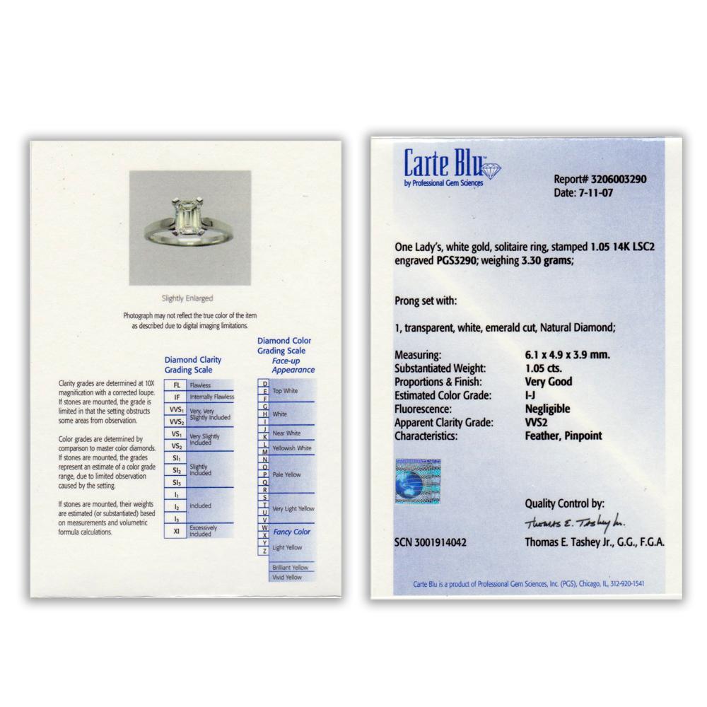 This timeless diamond engagement ring will last a lifetime and carry on to the next generation. The ring has been graded by Professional Gem Services out of Chicago and a Carte Blu report is included which is for a mounted ring. The solid 14kt white gold solitaire setting features a striking emerald cut natural diamond graded I-J in color, VVS2 in clarity with a Very Good cut grade. The setting celebrates the centerpiece beautifully. It weighs 3.0 grams and is currently a size 4.5 and we offer free resizing and Express shipping. It is in Like New condition and the original diamond ring report is included.