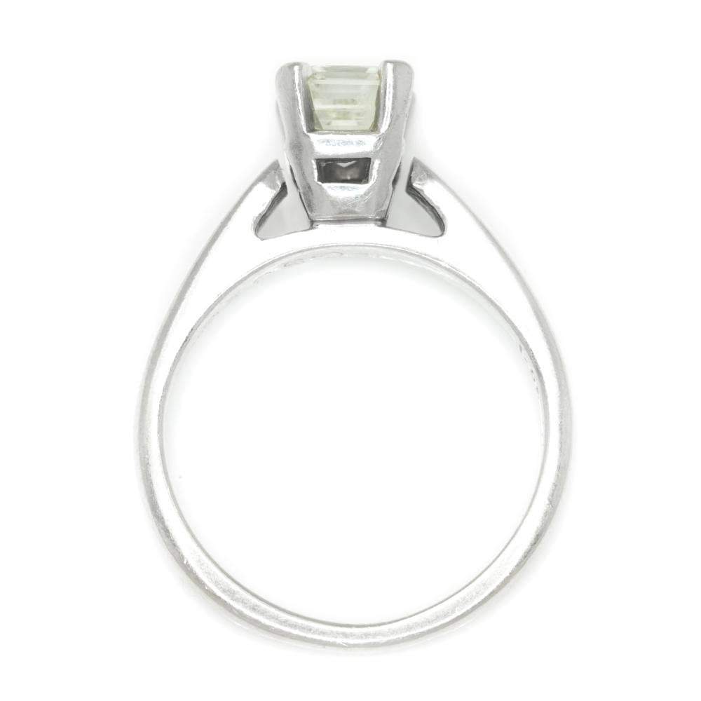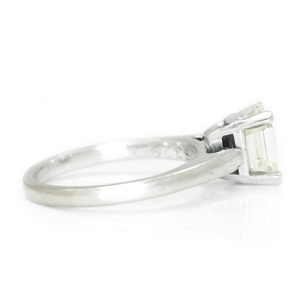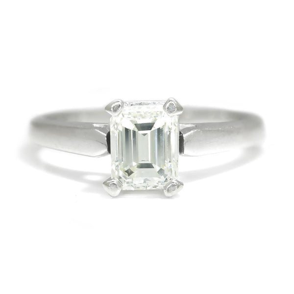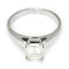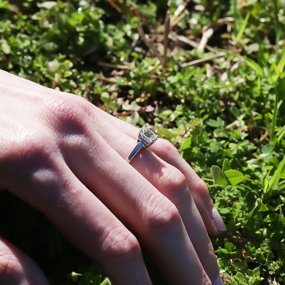 This timeless diamond engagement ring will last a lifetime and carry on to the next generation. The ring has been graded by Professional Gem Services out of Chicago and a Carte Blu report is included which is for a mounted ring. The solid 14kt white gold solitaire setting features a striking emerald cut natural diamond graded I-J in color, VVS2 in clarity with a Very Good cut grade. The setting celebrates the centerpiece beautifully. It weighs 3.0 grams and is currently a size 4.5 and we offer free resizing and Express shipping. It is in Like New condition and the original diamond ring report is included.