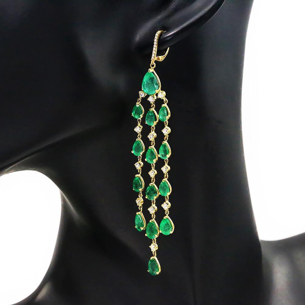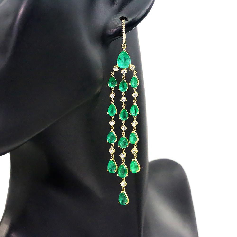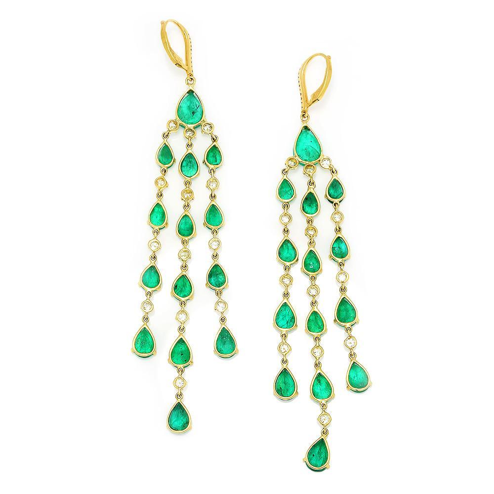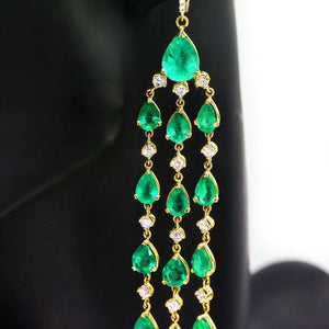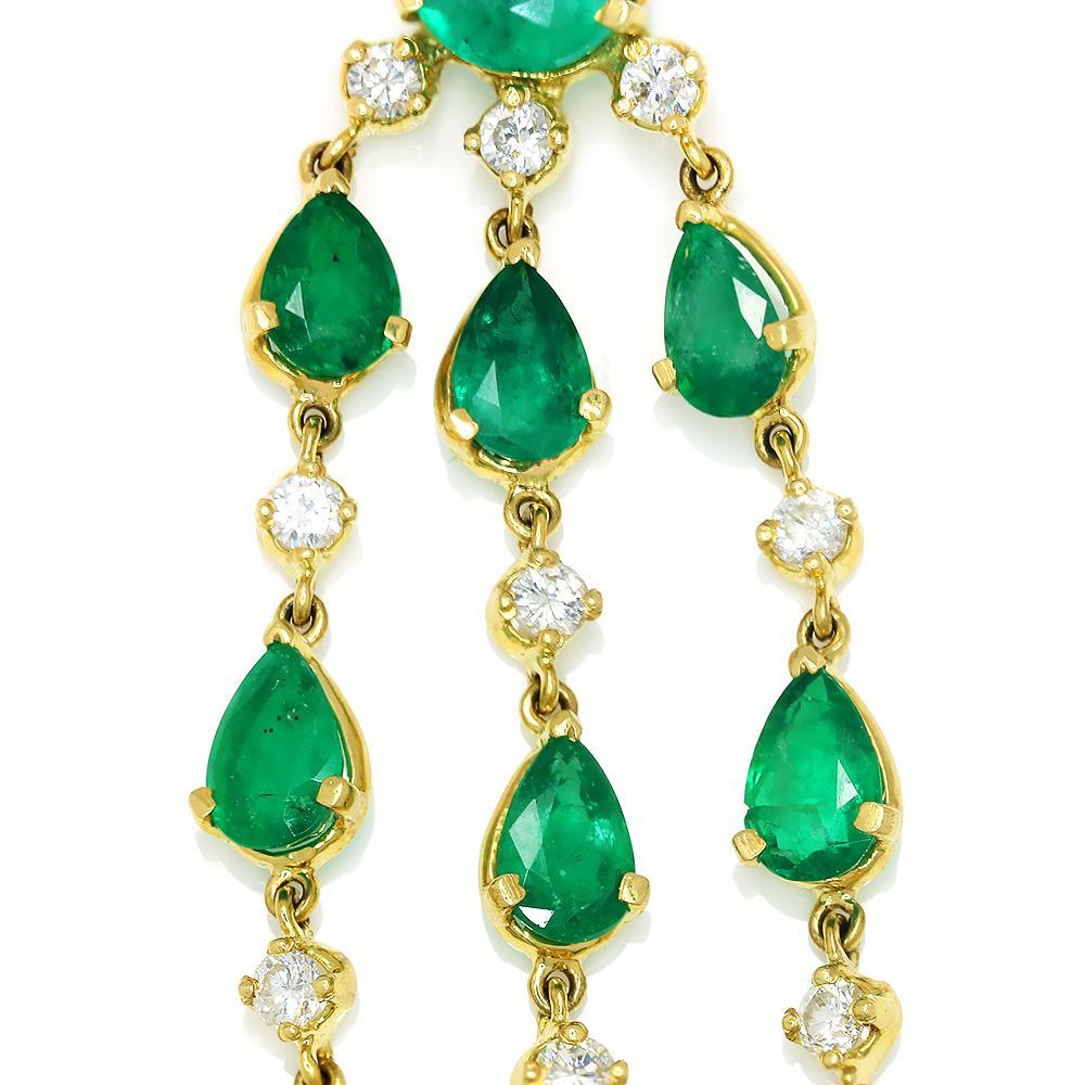 These chandelier-style emerald and diamond earrings are expertly crafted and very well-matched. They are cast of solid 18kt yellow gold and the center strand measures 3 3/4" from the bottom to the top of the earring closure. There are 28 pear-cut emeralds (14 in each earring) in the earrings. The rich green hues are striking against the gold and diamonds. The emeralds weigh approximately 15.00 carats total and the diamonds weigh about 1.50 carats total. These vintage earrings weigh just over 13 grams together and are in excellent condition.