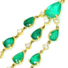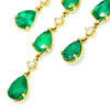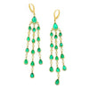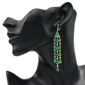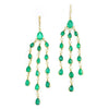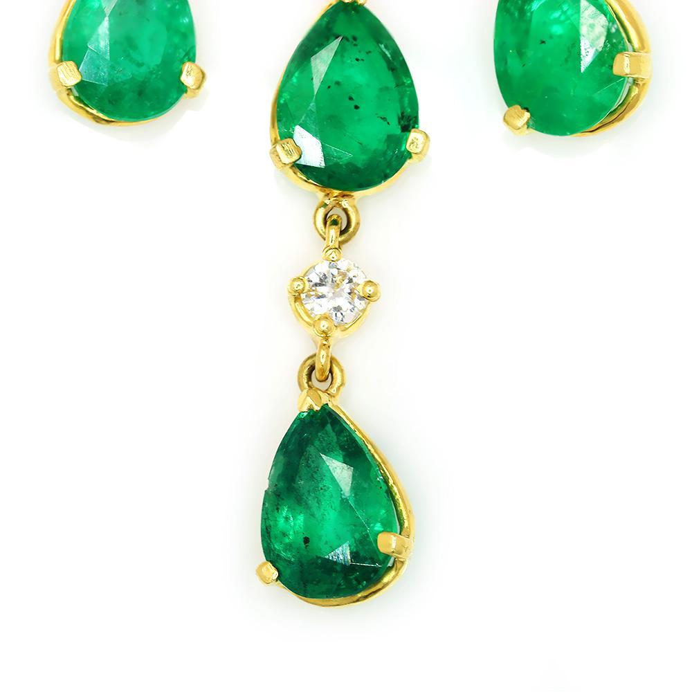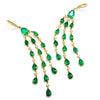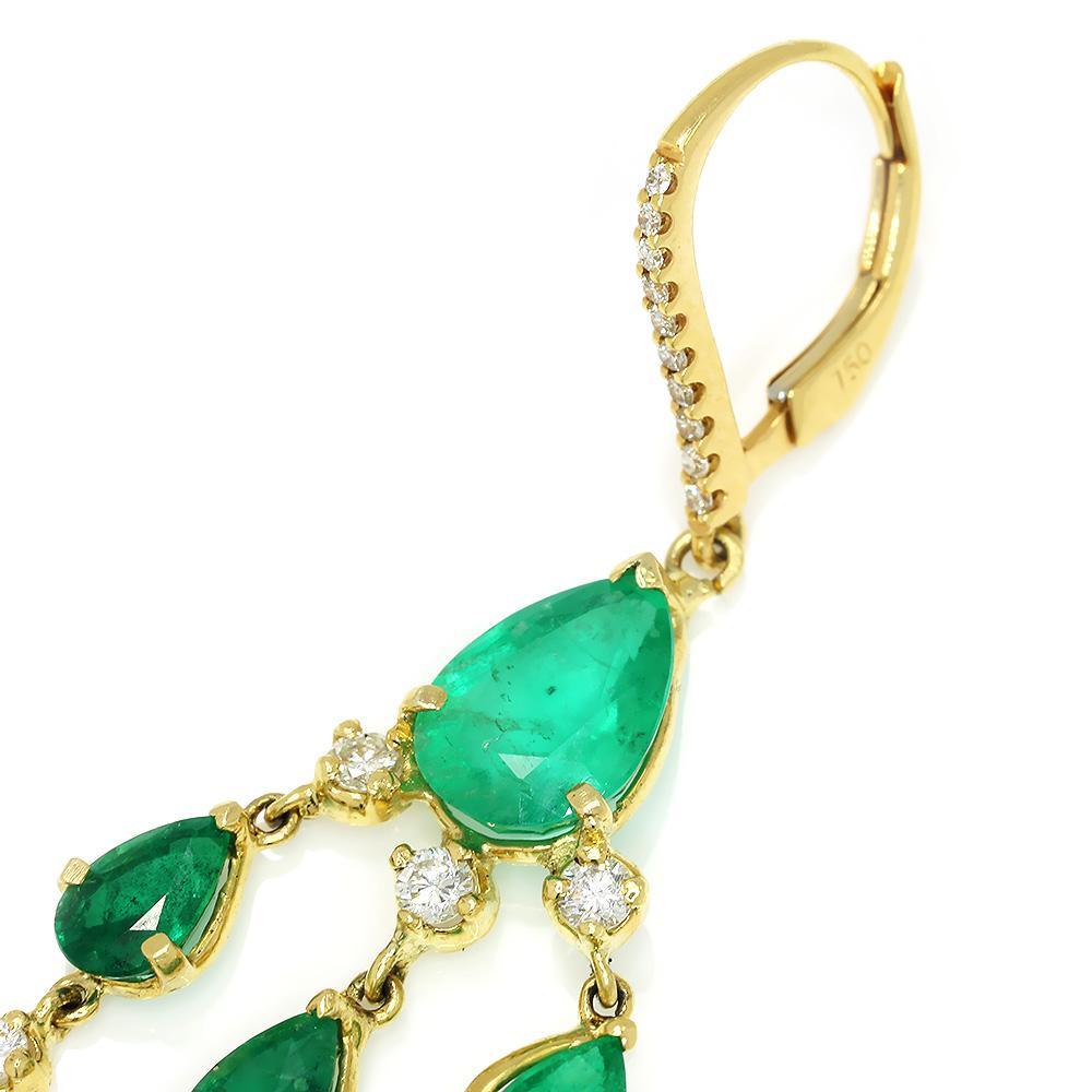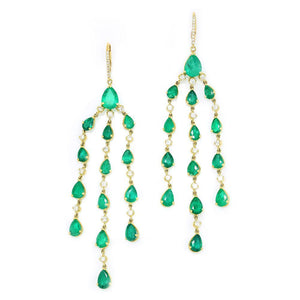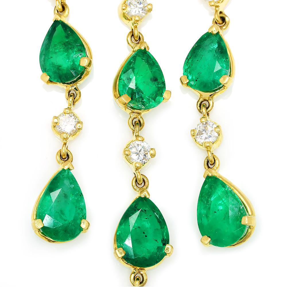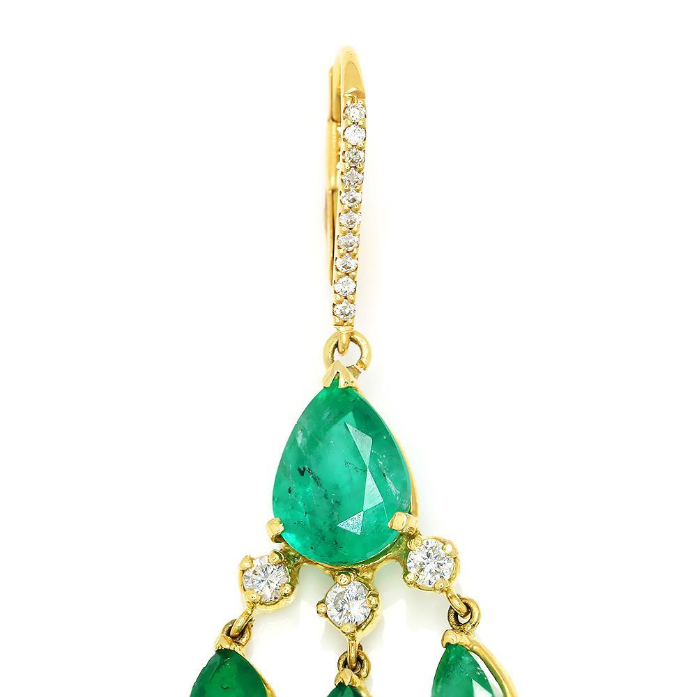 These chandelier-style emerald and diamond earrings are expertly crafted and very well-matched. They are cast of solid 18kt yellow gold and the center strand measures 3 3/4" from the bottom to the top of the earring closure. There are 28 pear-cut emeralds (14 in each earring) in the earrings. The rich green hues are striking against the gold and diamonds. The emeralds weigh approximately 15.00 carats total and the diamonds weigh about 1.50 carats total. These vintage earrings weigh just over 13 grams together and are in excellent condition.