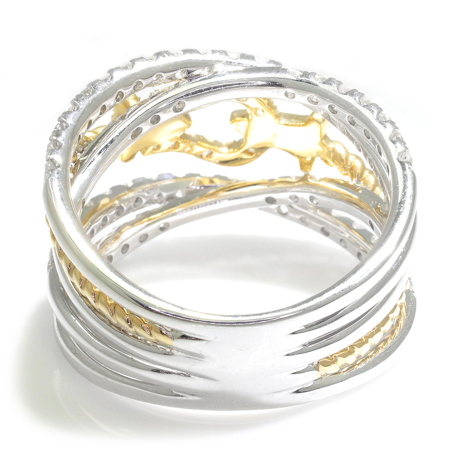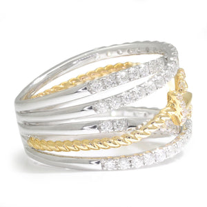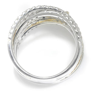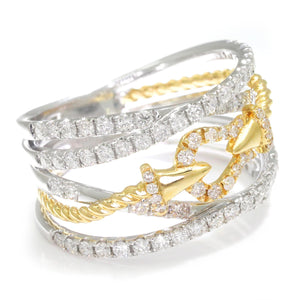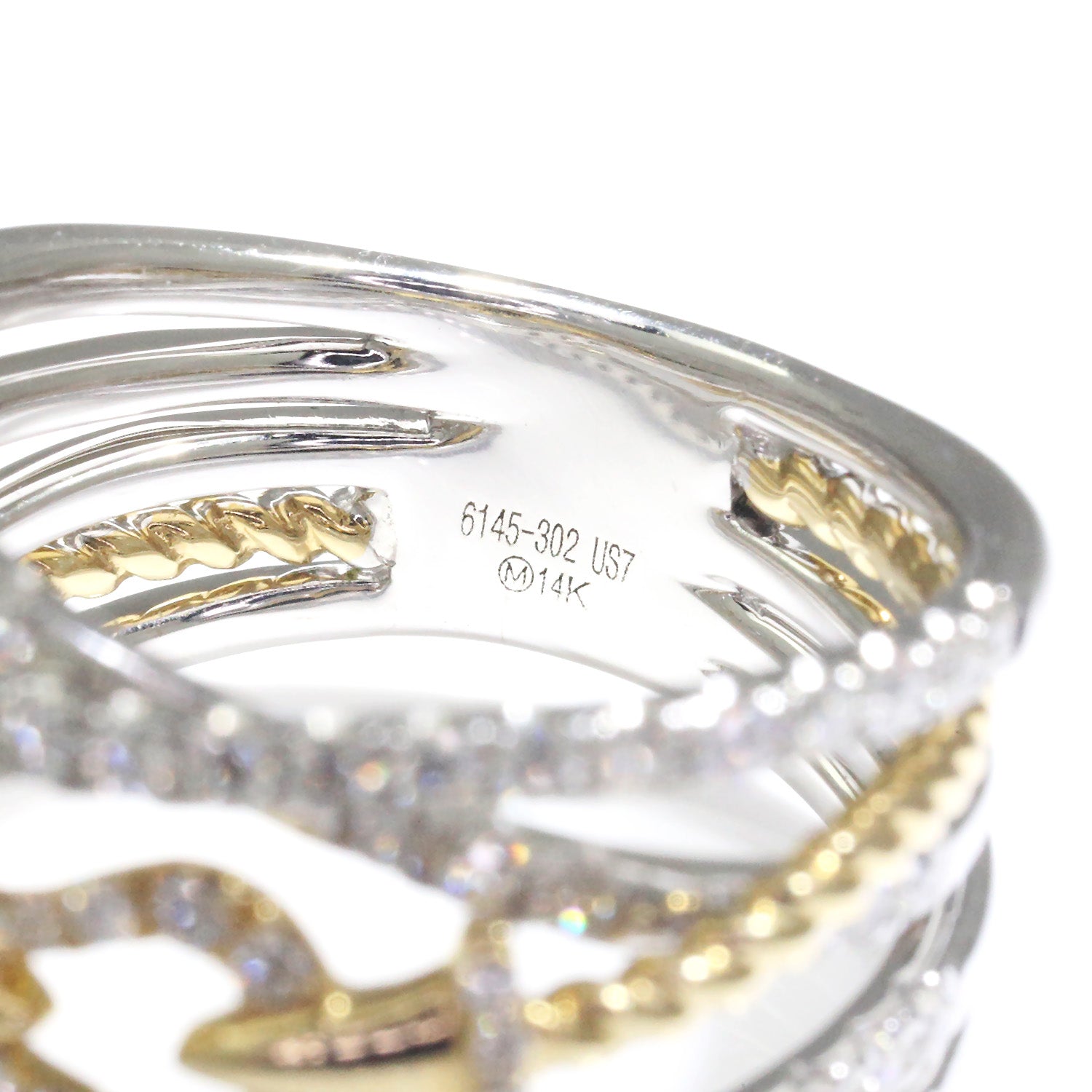 This criss-cross band is commonly referred to as a 'cigar band' due to its width which measures almost 1/2" wide. It's made of mostly solid 14kt white gold with round brilliant cut natural diamonds incrusted on the strands of gold that criss and cross. One yellow gold rope strand weaves across the top and connects in a belt buckle design which creates an interesting and attractive feature. It has 0.93-carats of diamonds and is a size 7 and can be resized. The band is Brand New!