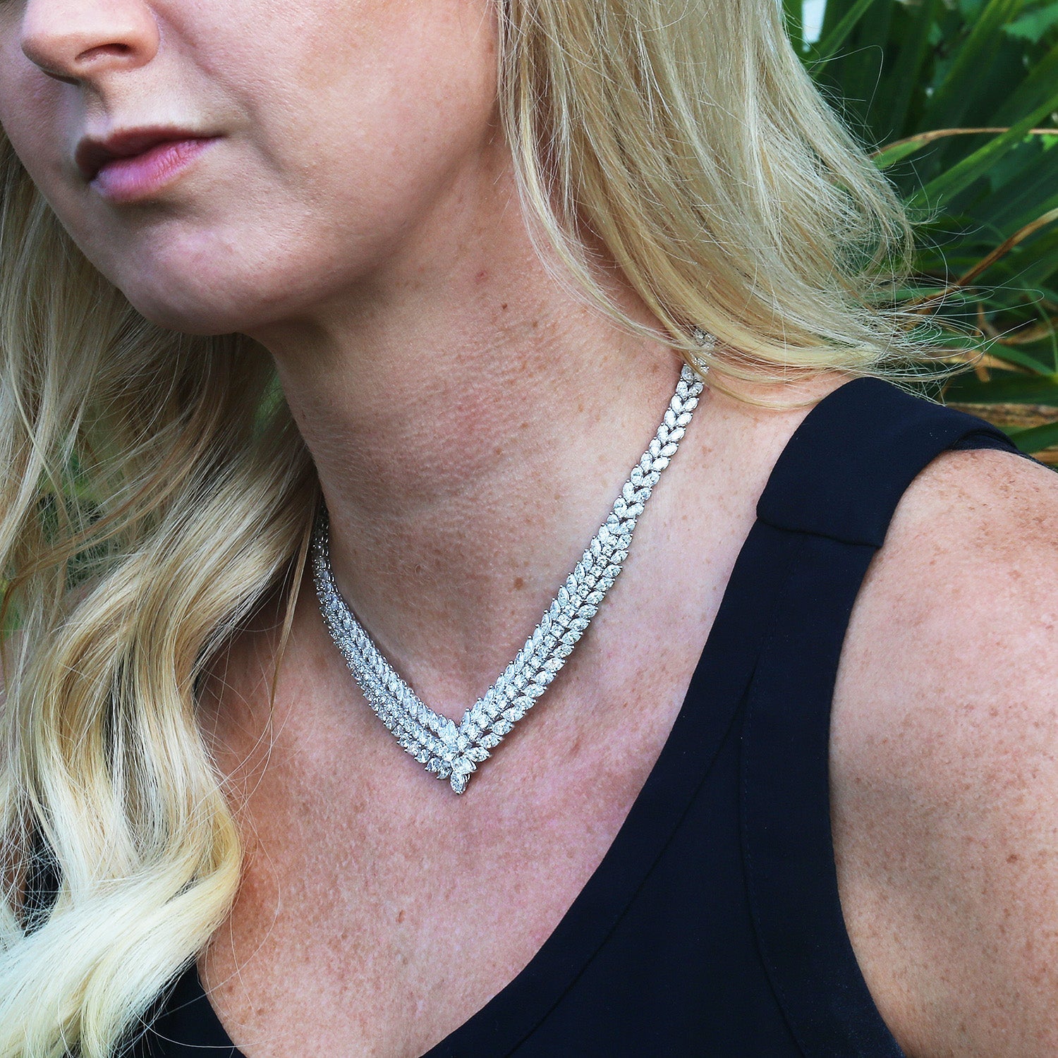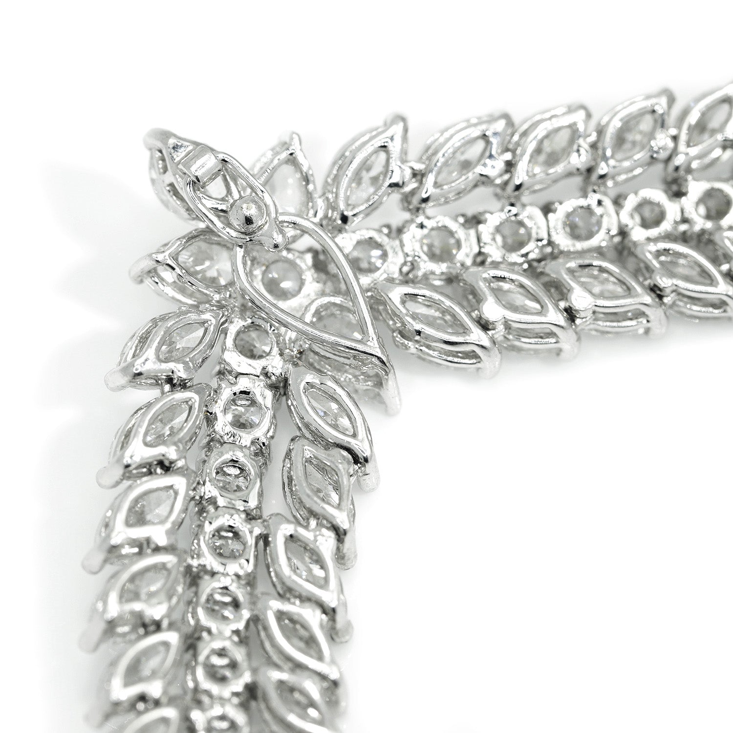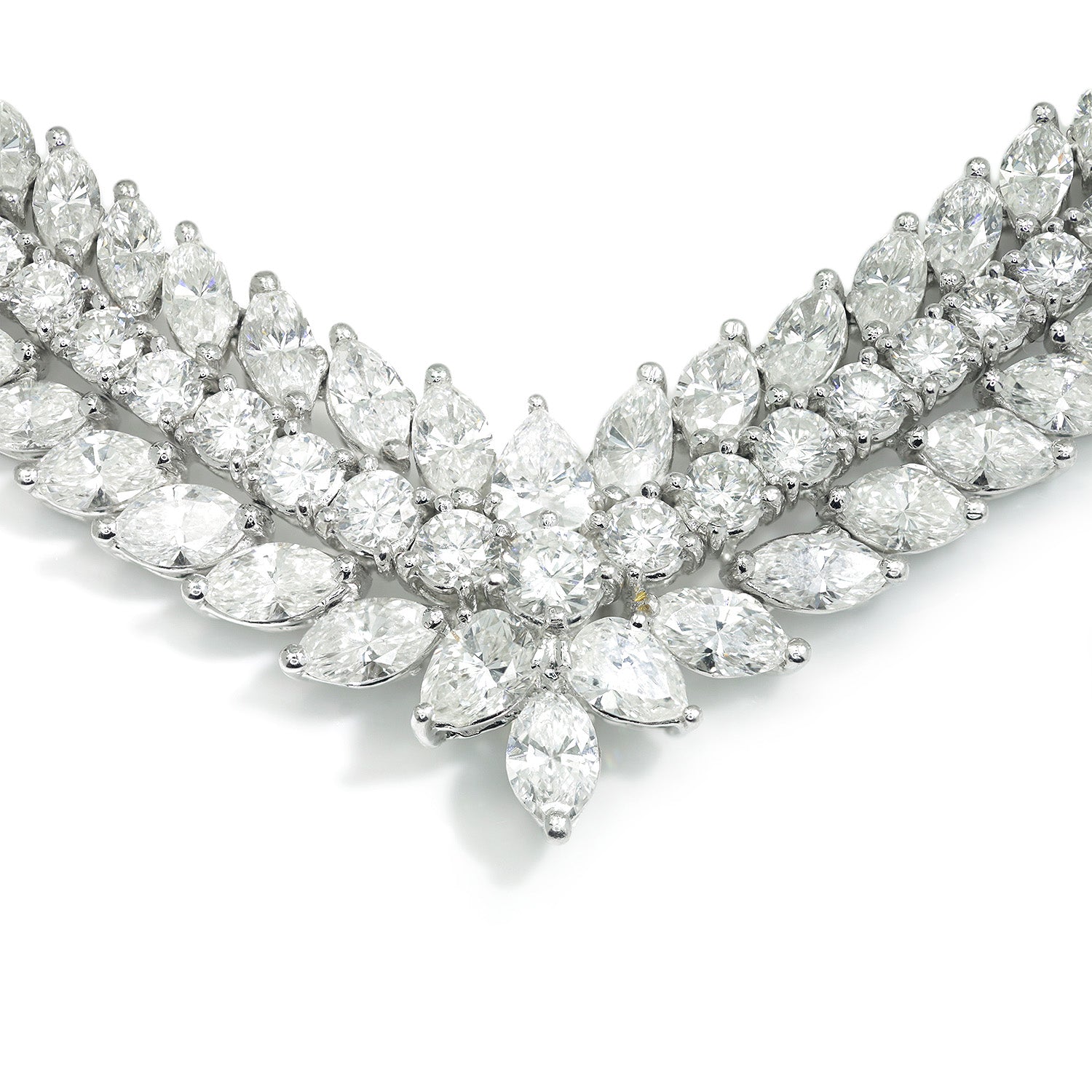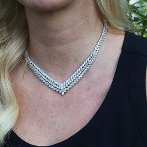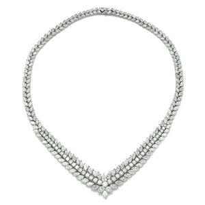 This exquisite V-shaped statement necklace is crafted in 900 platinum and features 34.13 total carat weight of natural white/colorless diamonds. The prong setting style accentuates the brilliance of the diamonds, which are cut to perfection. The 17-inch necklace length makes it perfect for any elegant occasion. It weighs just over 61 grams and wears very well as you can see in the photos. There is a hinge at the base of the center of the necklace to allow a pendant enhancer to dangle from it. This rare piece is masterfully crafted and in Like New condition.