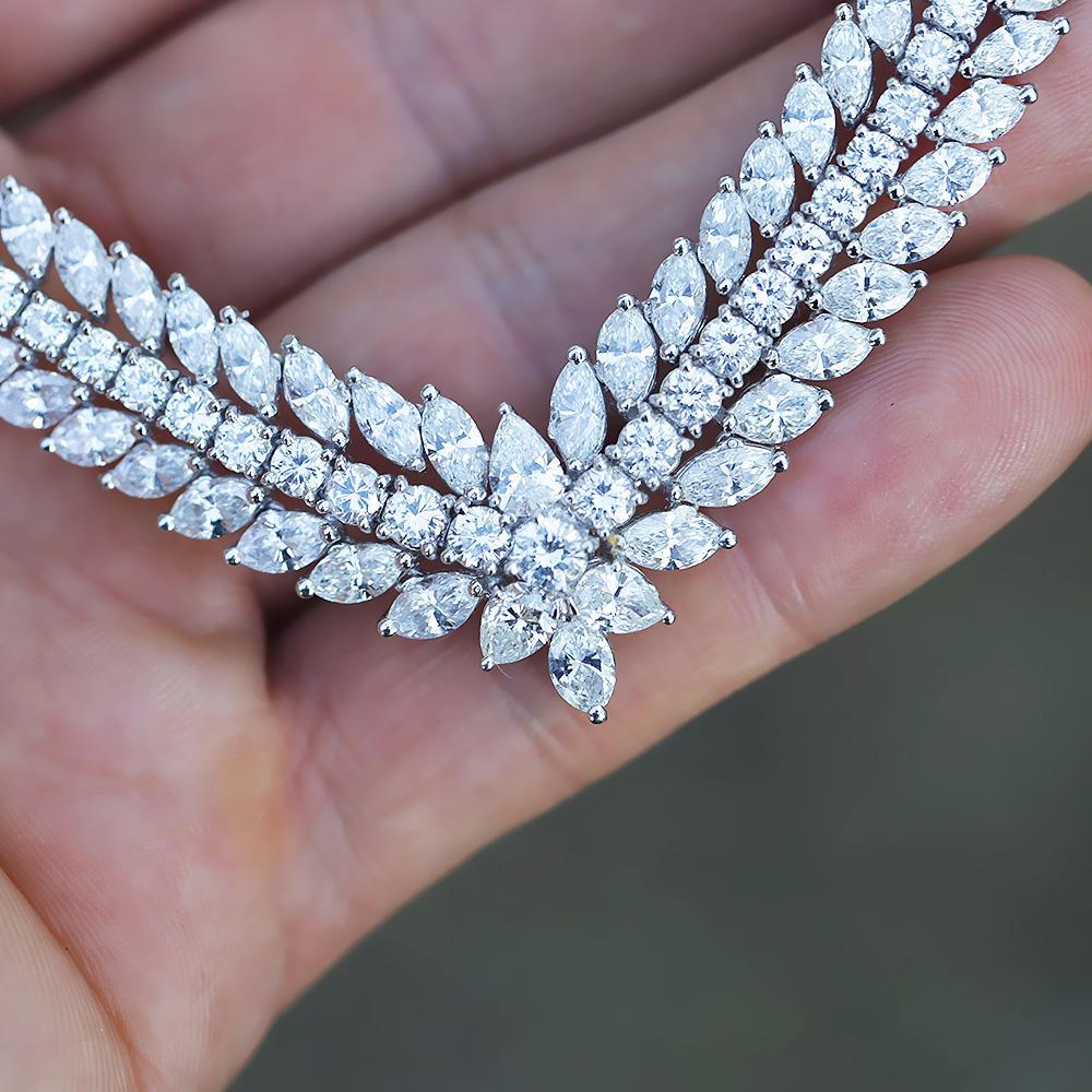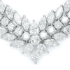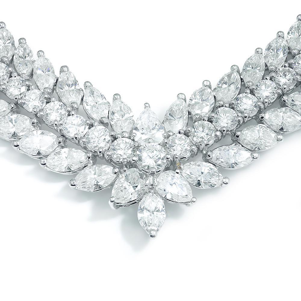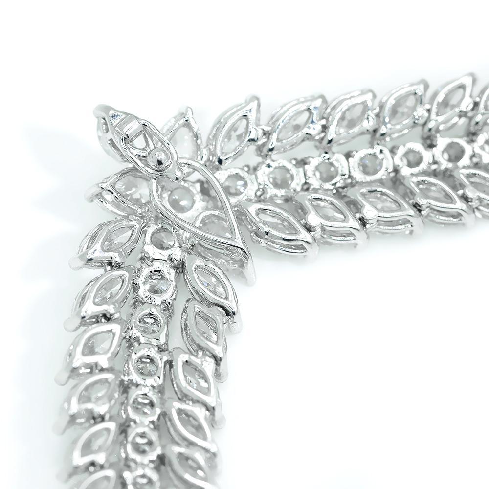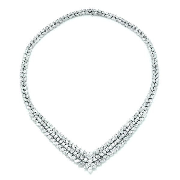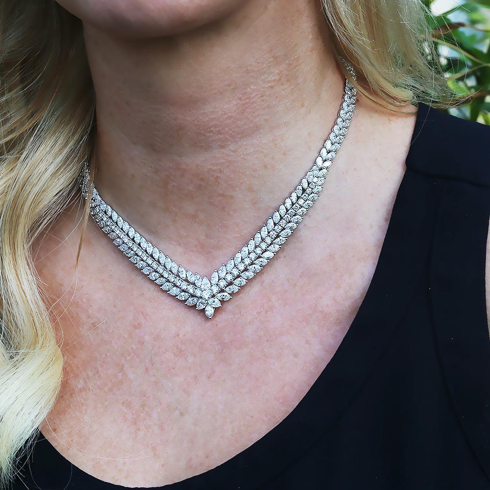 This exquisite V-shaped statement necklace is crafted in 900 platinum and features 34.13 total carat weight of natural white/colorless diamonds. The prong setting style accentuates the brilliance of the diamonds, which are cut to perfection. The 17-inch necklace length makes it perfect for any elegant occasion. It weighs just over 61 grams and wears very well as you can see in the photos. There is a hinge at the base of the center of the necklace to allow a pendant enhancer to dangle from it. This rare piece is masterfully crafted and in Like New condition.