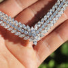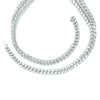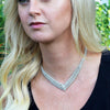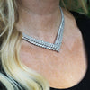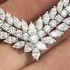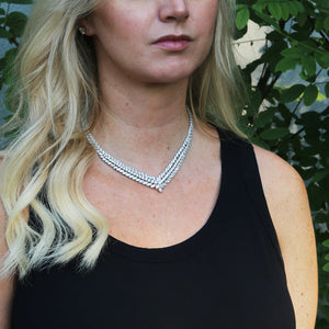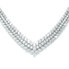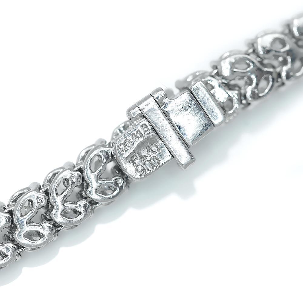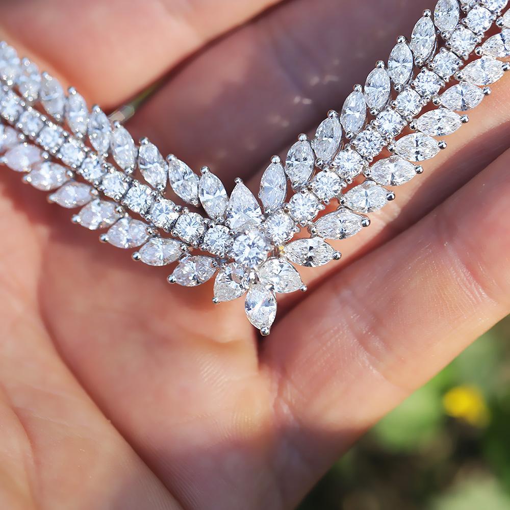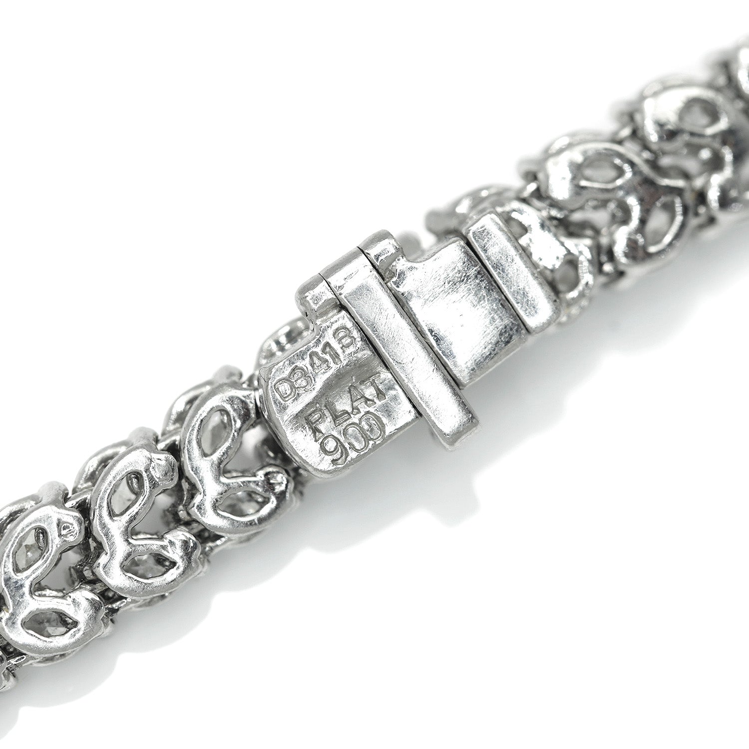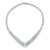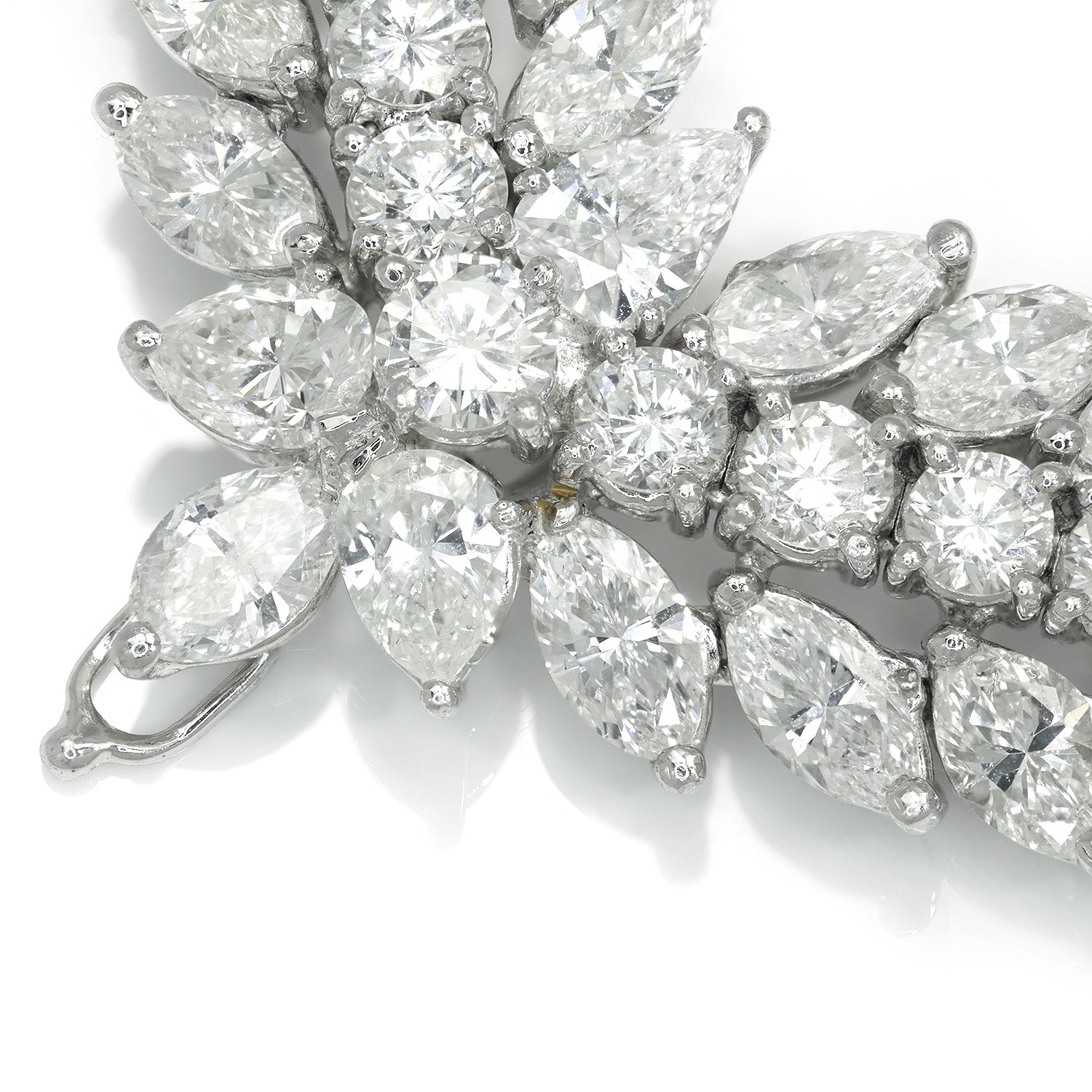 This exquisite V-shaped statement necklace is crafted in 900 platinum and features 34.13 total carat weight of natural white/colorless diamonds. The prong setting style accentuates the brilliance of the diamonds, which are cut to perfection. The 17-inch necklace length makes it perfect for any elegant occasion. It weighs just over 61 grams and wears very well as you can see in the photos. There is a hinge at the base of the center of the necklace to allow a pendant enhancer to dangle from it. This rare piece is masterfully crafted and in Like New condition.