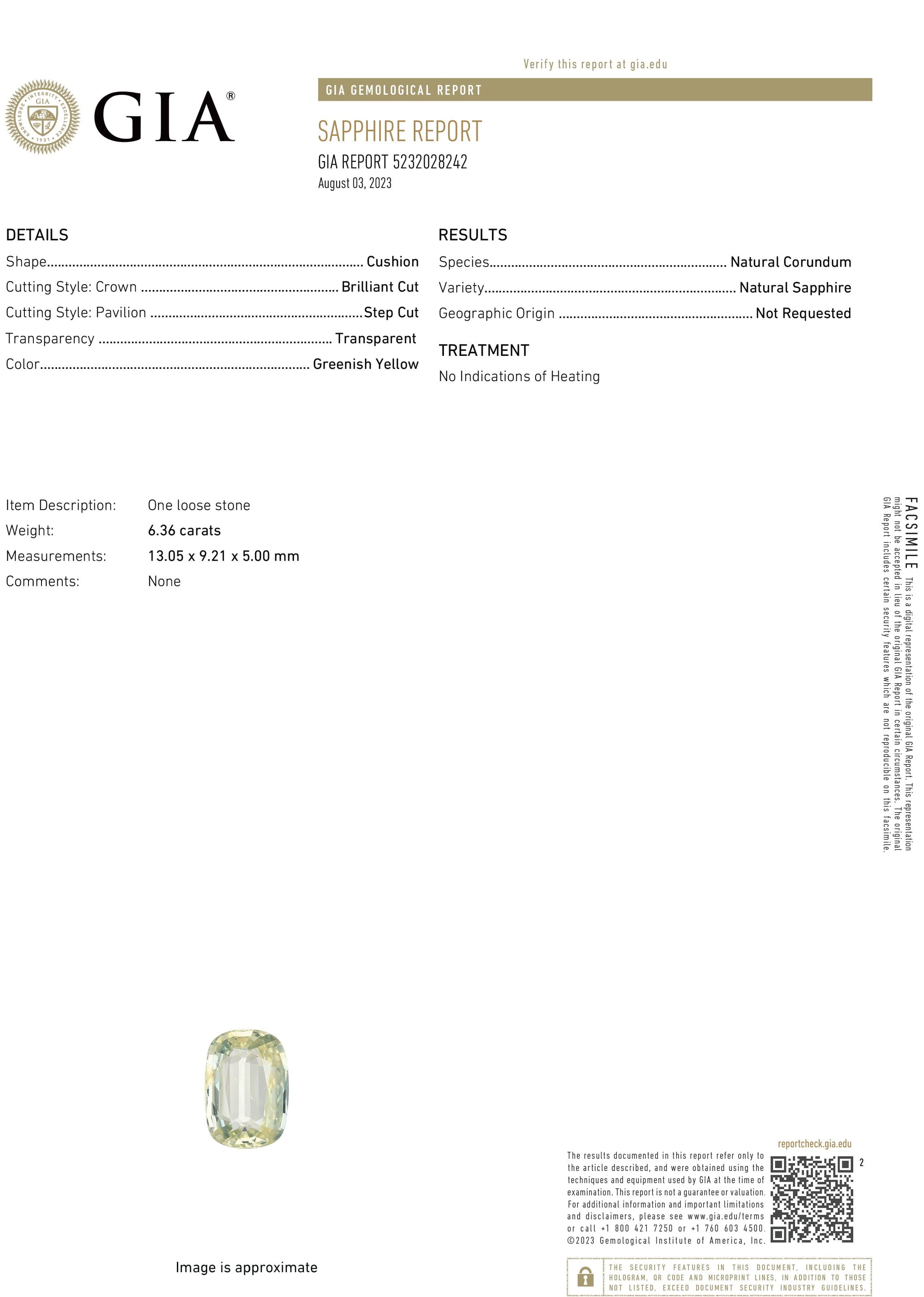 Featured is a 3-stone diamond ring setting adorned with an intoxicating GIA-certified natural sapphire at its center. The September birthstone is cushion-cut and has a Greenish Yellow color with no indications of heat treatment. This means it was this color when it was excavated from the Earth, with no human treatment. It weighs 6.36 carats and is perfect in this 18-karat white gold ring. It is a size 6.5, and is brand new!