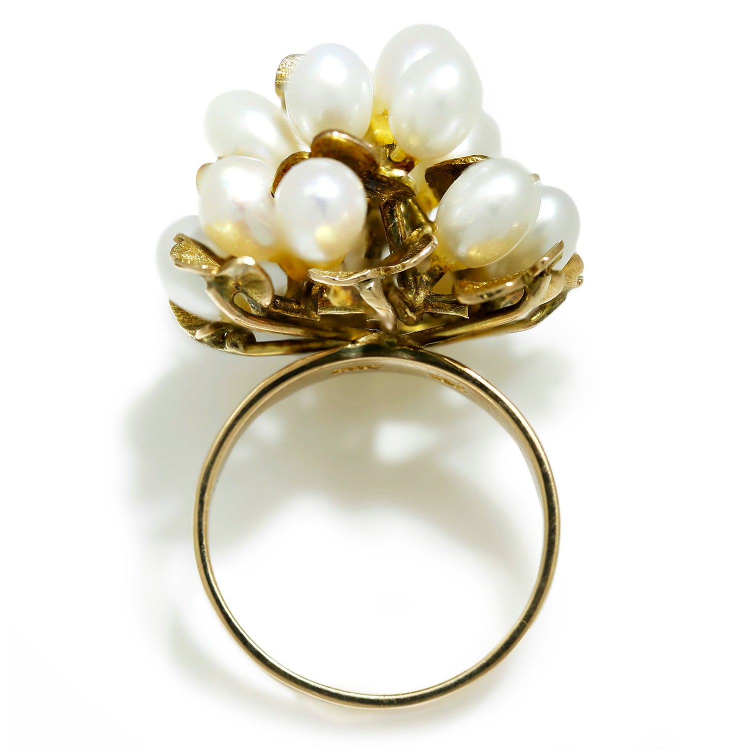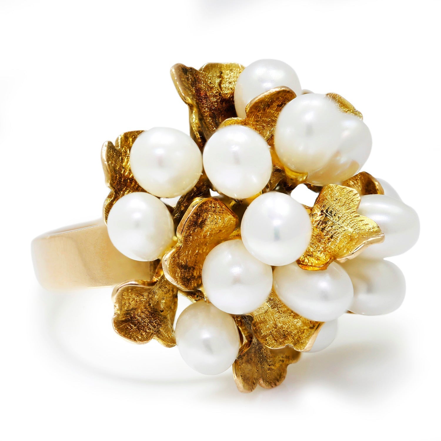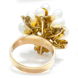 Perfectly matched oval cultured pearls emerge from textured solid gold flower petals in this unique cocktail ring inspired by nature. The ring is made of solid 14-karat yellow gold and exhibits 14 pearls at varying depths and angles blooming from the petals like fruit. It rises about 17mm above your finger and is currently a size 5.5 and we offer complimentary resizing. It is pre-owned and in very good condition.