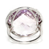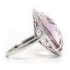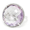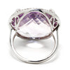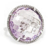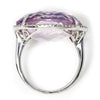 The amethyst gemstone can exhibit many shades of its exotic purple hue where some can be hauntingly intense and dark and others can be subtle and evocative. This 18 carat round checkerboard cut amethyst falls in the latter category and is astonishingly accented by 56 single cut bead set natural diamonds around it. The diamonds are graded G-H in color and SI1 in clarity and weigh .28 carats total. The February birthstone is, although light in color, is bold is size and certainly commands a presence. The ring is made of solid 14kt white gold and weighs 7.9 grams. It is currently a size 4 and can be resized. It rises 9.70mm above your fingers the bottom of the gemstone does rest on your finger. The ring faces measures 22.30mm North to South and 22.65mm East to West. It’s in excellent condition.