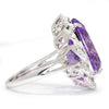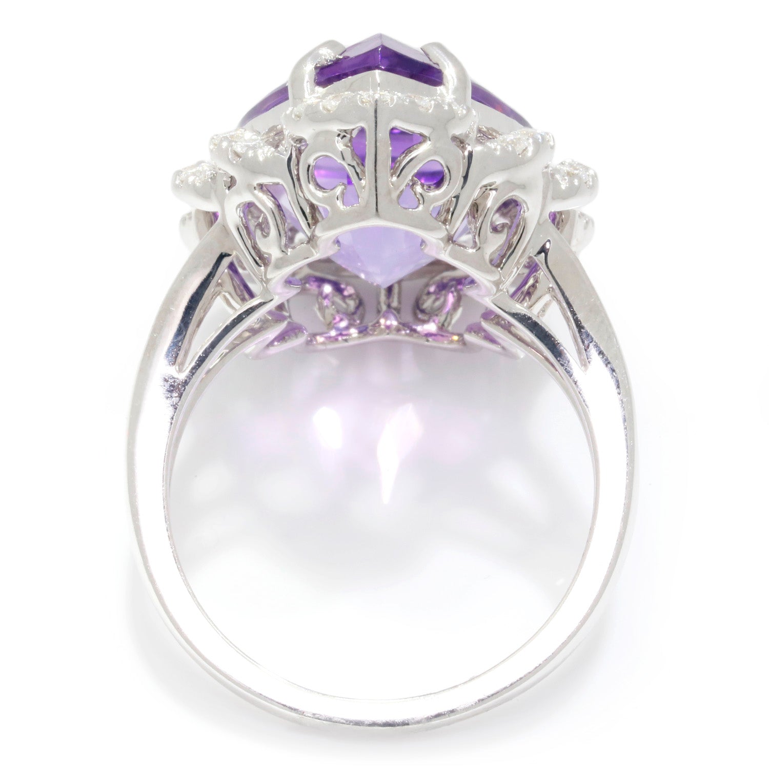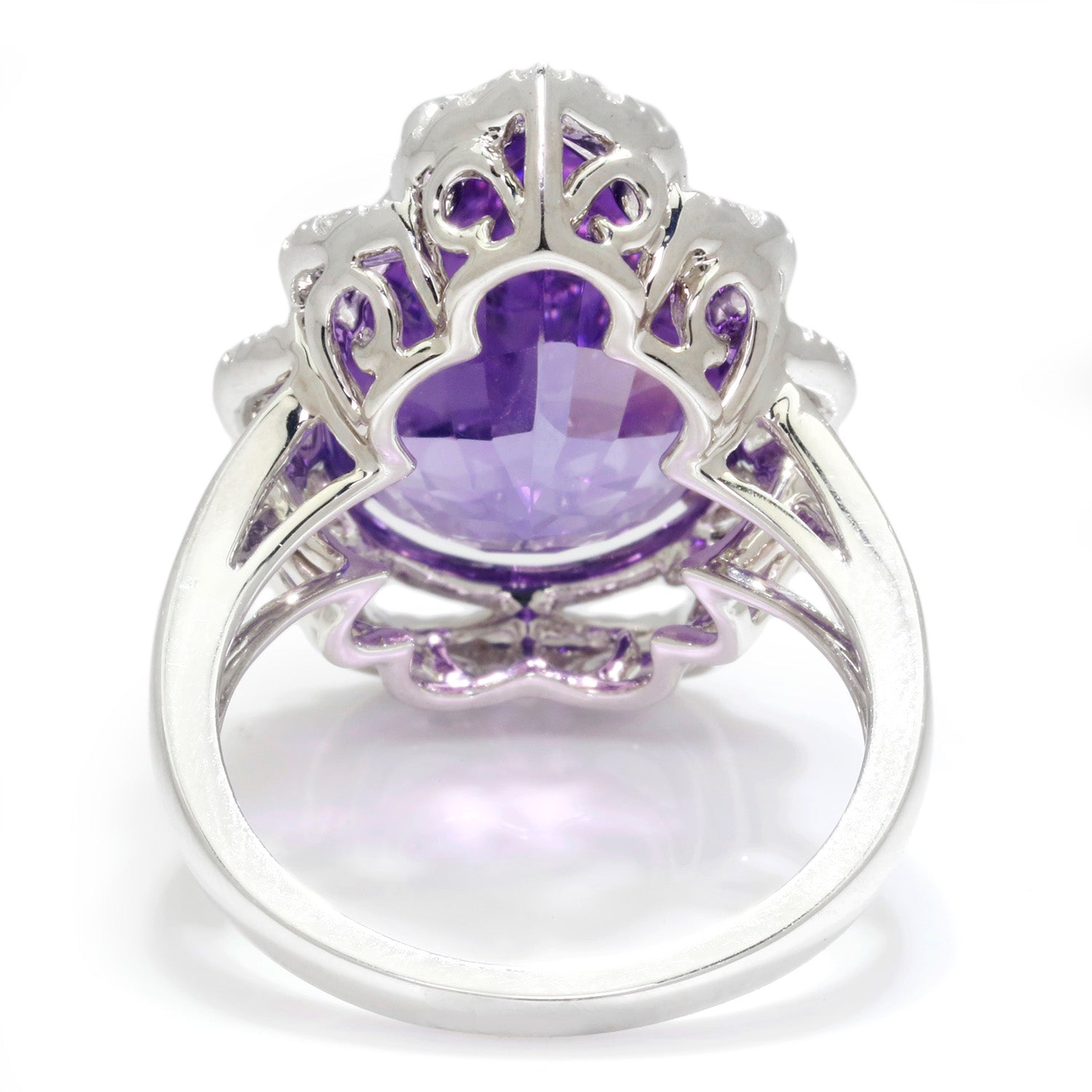 The amethyst has long been thought to symbolize peace, balance and inner strength. This bold and exquisite example of this gem weighs 9.16-carats, is teardrop in shape and sleeps in a bed of diamonds. The pear mixed cut is a treasure chest of facets that exhibit varying shades of light to dark violet hues which are enhanced by the sparkle and fire of the accent diamonds. The solid 18kt white gold ring setting is a perfect celebration piece for this gem. It is a size 6.75 and is Brand New!