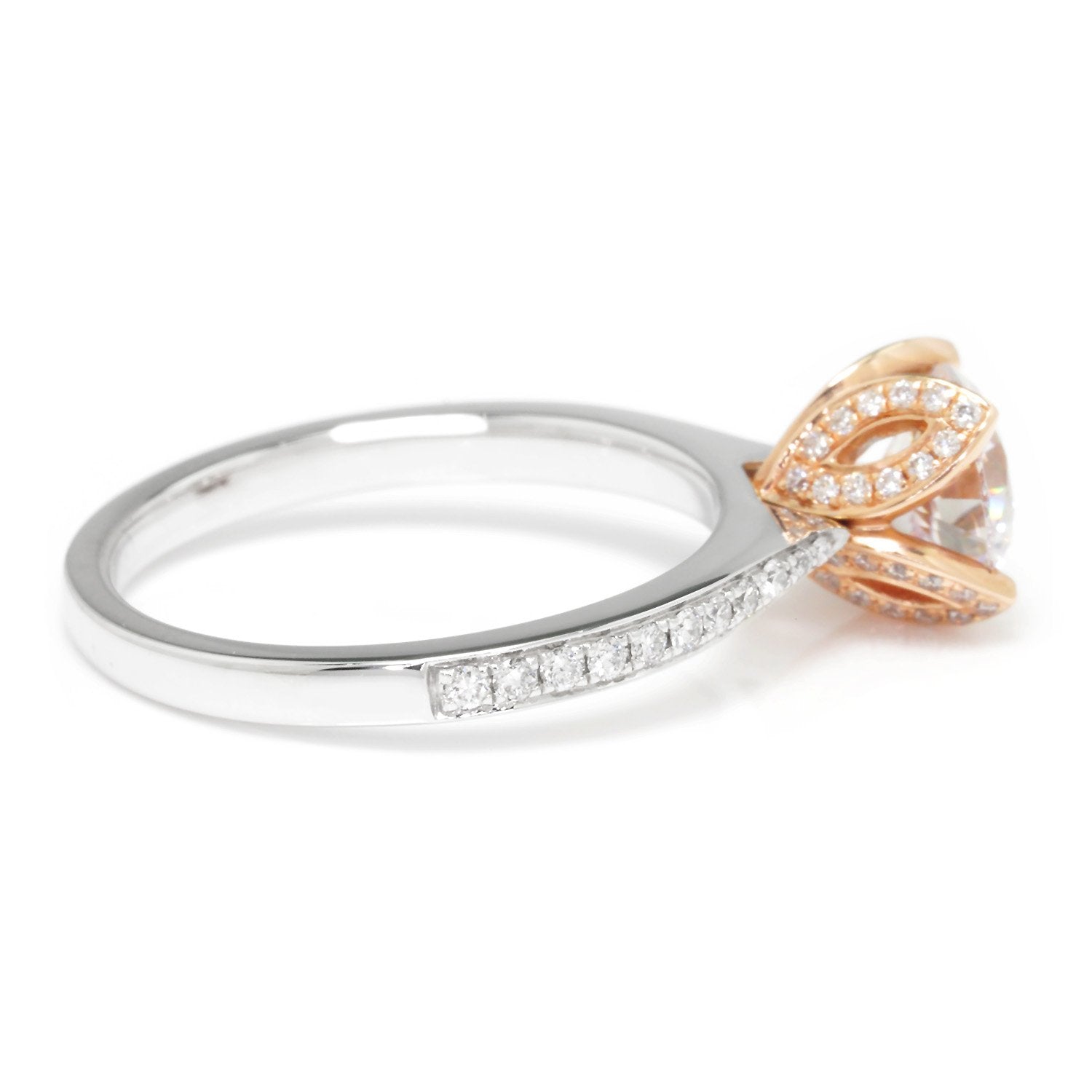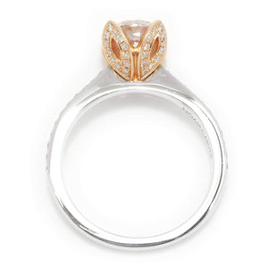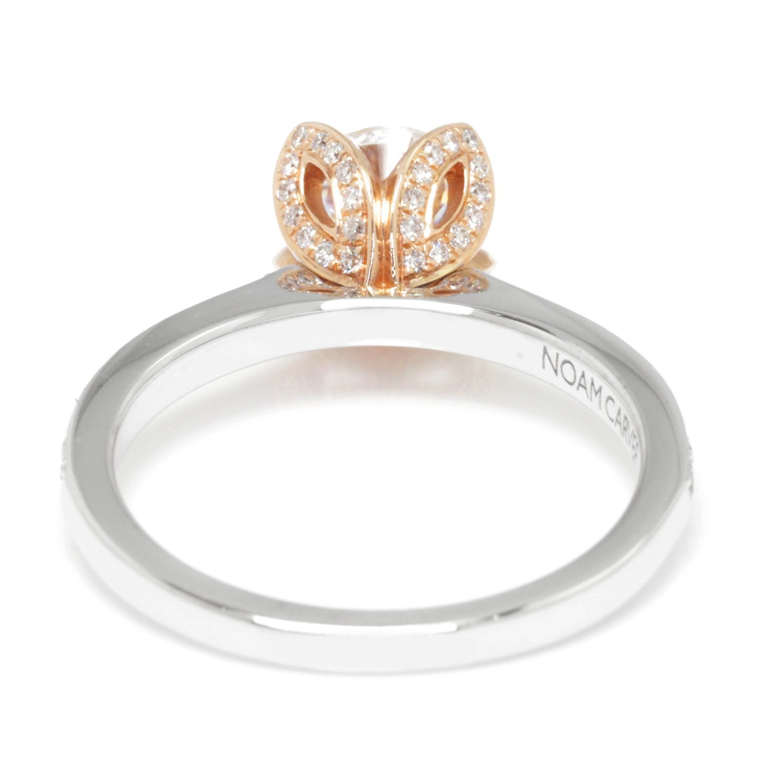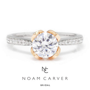 Noam Carver is an internationally renowned and award winning jewelry artist known for risk-taking innovative designs with a special focus on bridal creations. Noam's designs draw from the past while incorporating the latest technological advances to fuse present-day modern style which gives birth to the trendsetting designs he has become known for. A diamond-encrusted white gold shank holds up a rose gold flower petal mounting head which is covered in diamonds in this gorgeous engagement ring setting. The center is currently a 6.5MM cubic zirconia and can be replaced with a diamond or gemstone. The ring is a size 6.5 and we offer free resizing and Express shipping. Explore more details in the 'Specs' section.