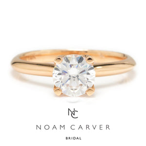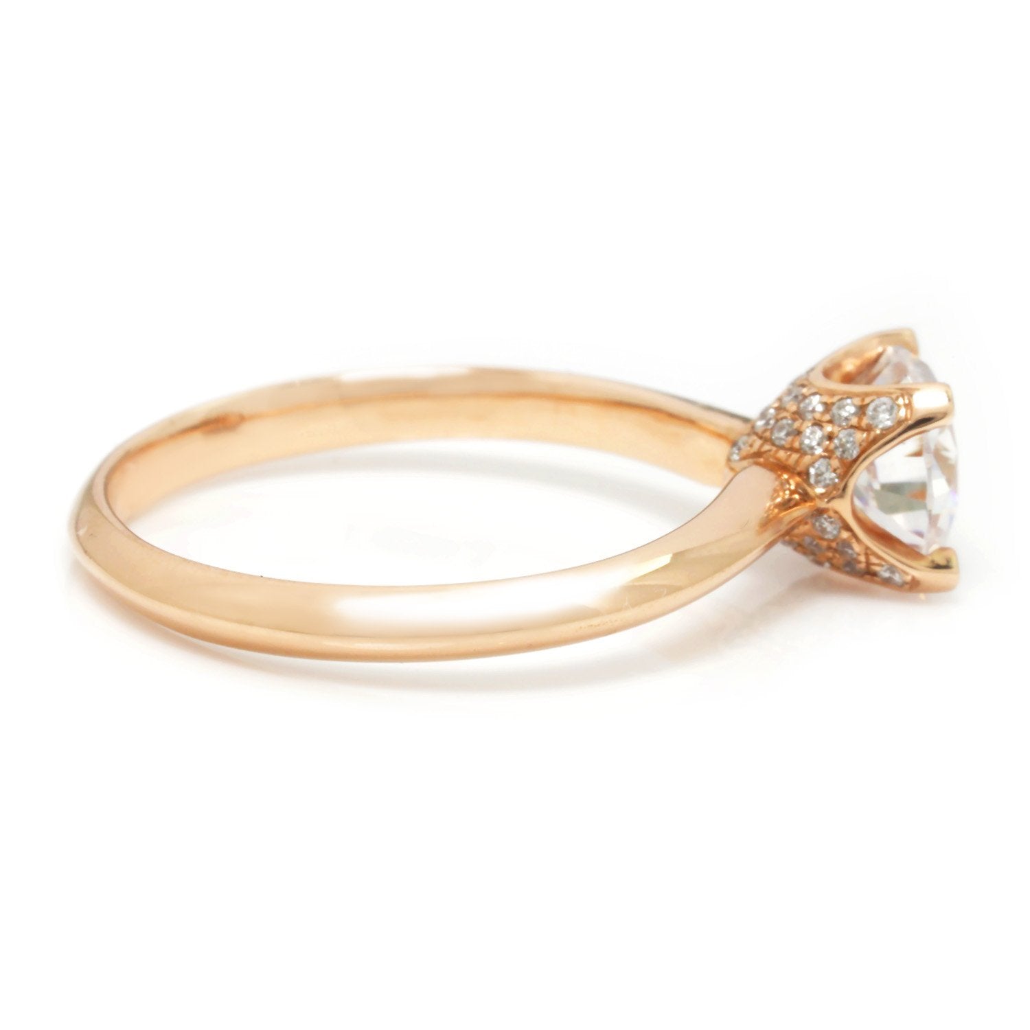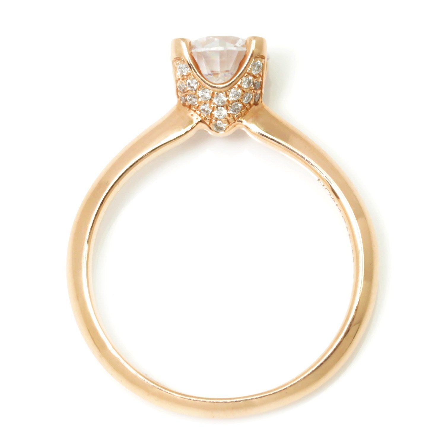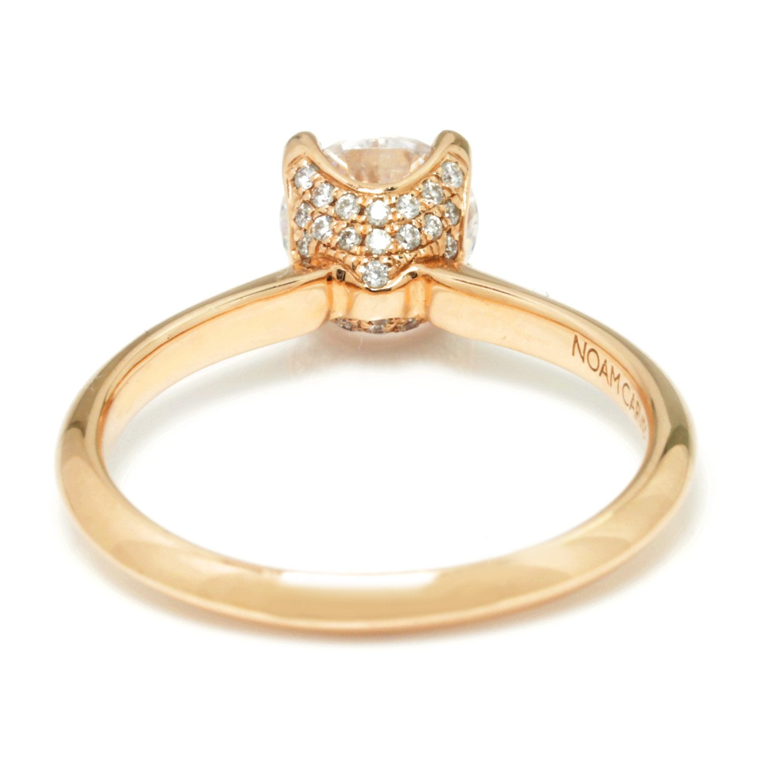 Noam Carver is an internationally renowned and award winning jewelry artist known for risk-taking innovative designs with a special focus on bridal creations. Noam's designs draw from the past while incorporating the latest technological advances to fuse present-day modern style which gives birth to the trendsetting designs he has become known for. This gorgeous solitaire rose gold setting features a bundle of pave diamonds encrusted into the mounting head for a hidden yet surprising amount of sparkle. The center is currently a 6.5MM cubic zirconia and can be replaced with a diamond or gemstone. The ring is a size 6.5 and we offer free resizing and Express shipping. Explore more details in the 'Specs' section.