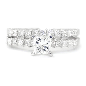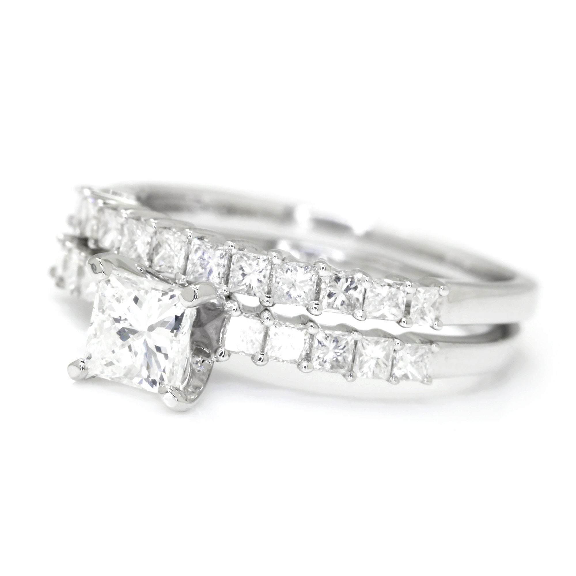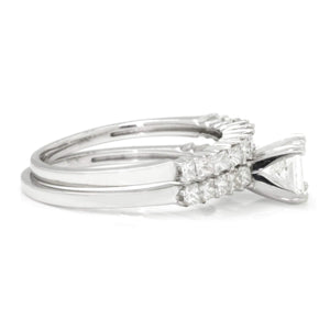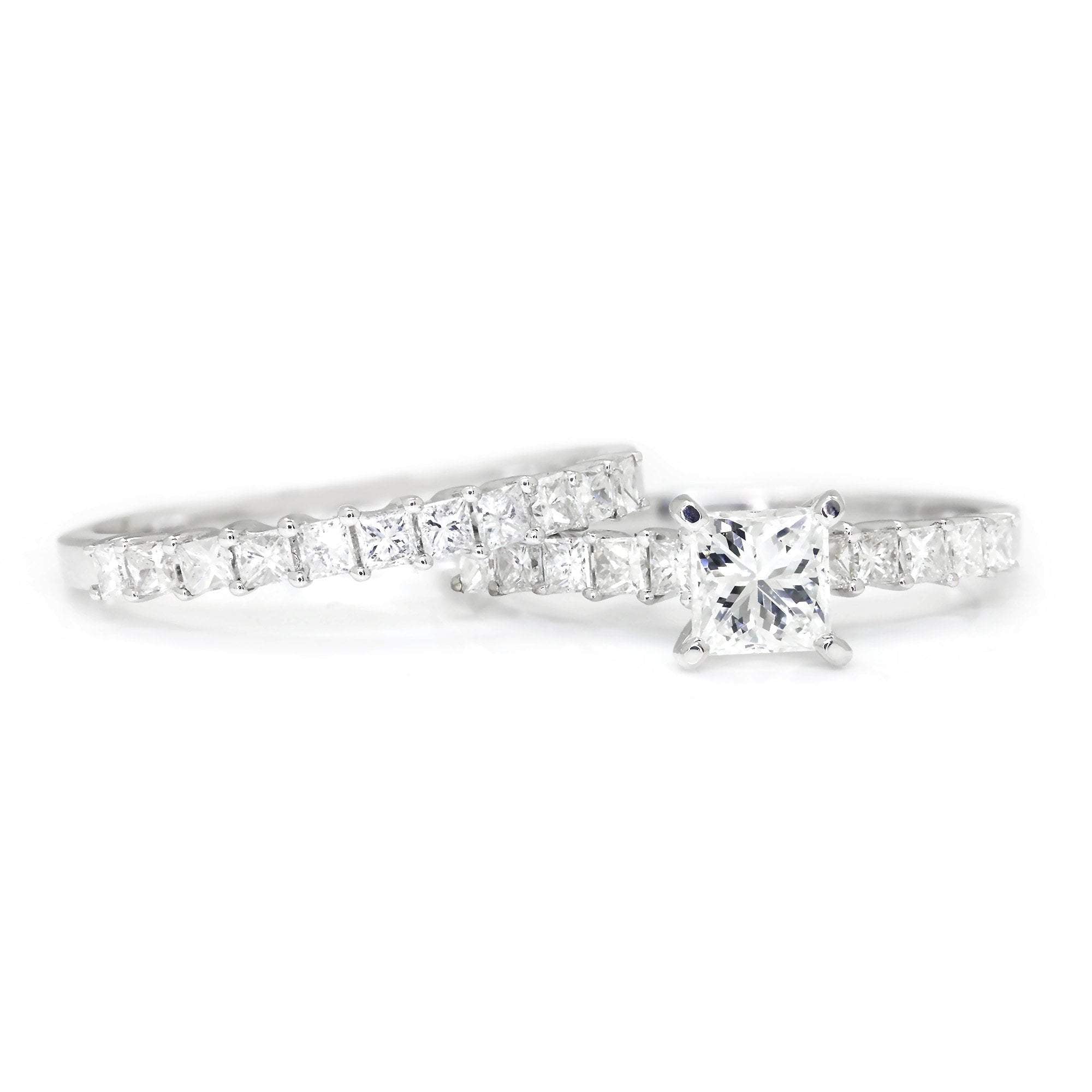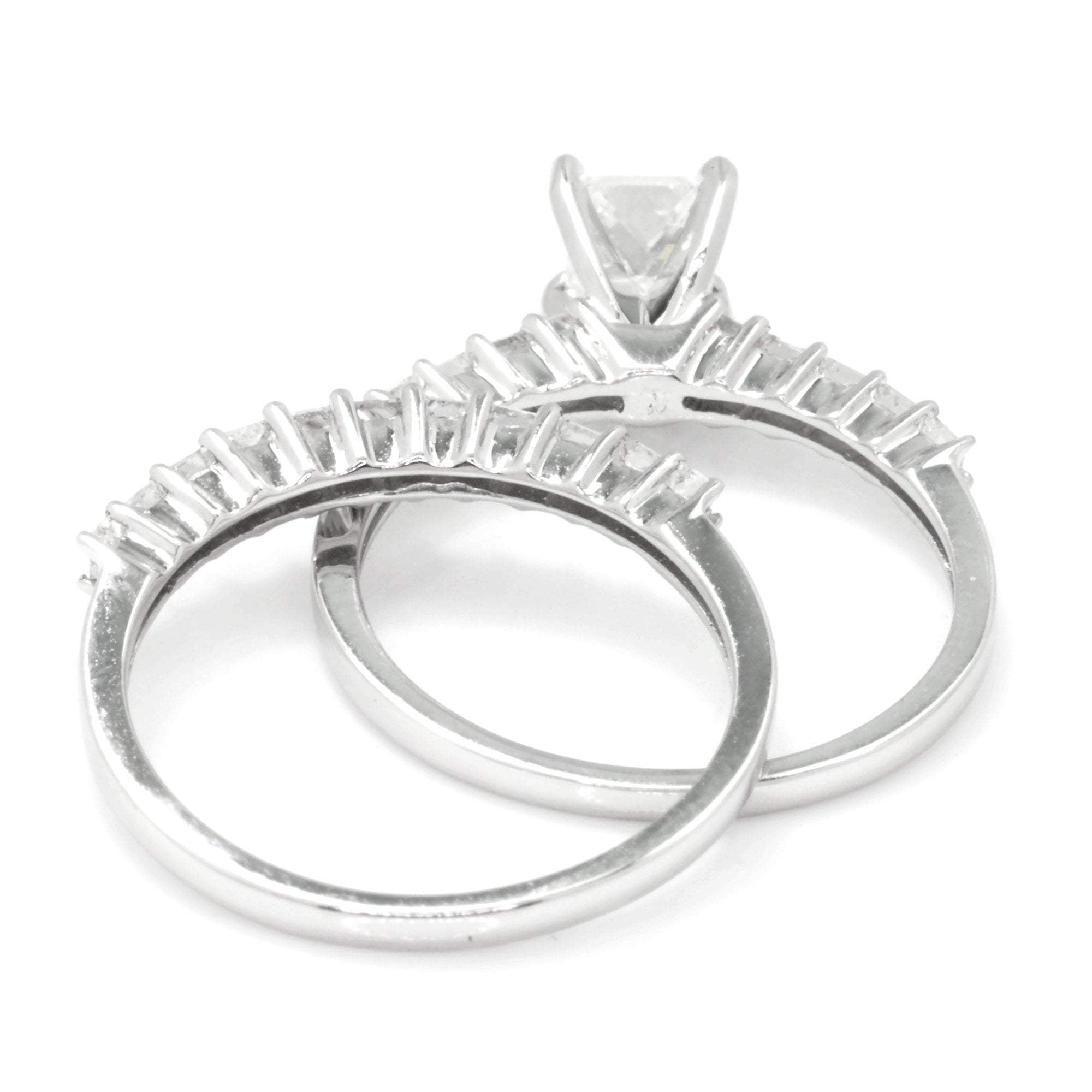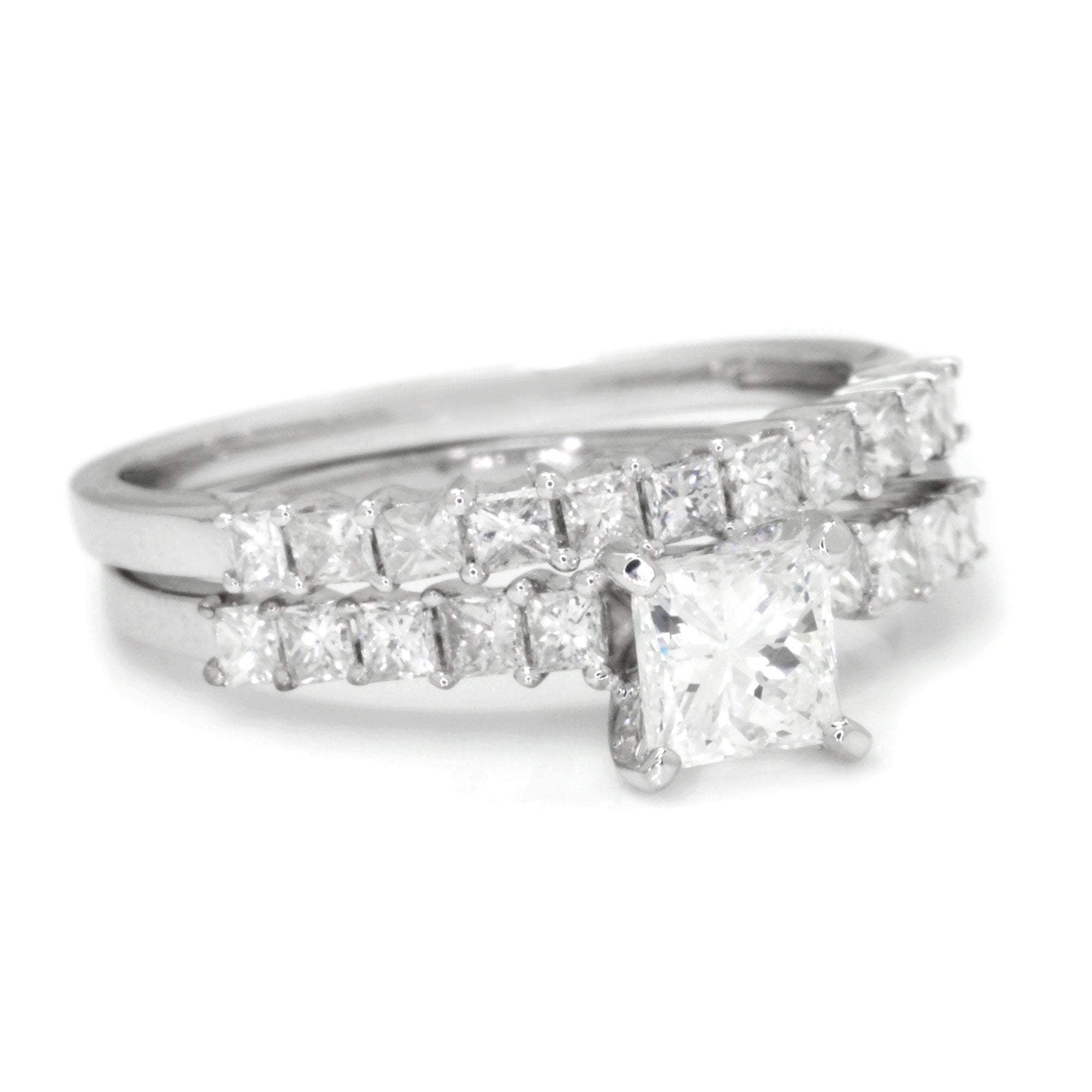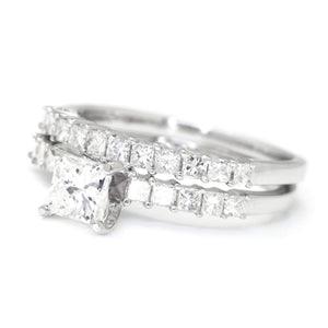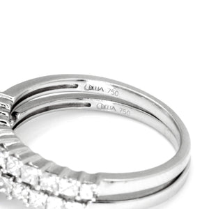 This diamond engagement ring set is for the princess cut diamond lover! The solid 18kt white gold ring set is made by New York jewelry design house Odelia who, for over two decades, has created unique and quality fine jewelry designs with a focus on bridal. The centerpiece of this classic set is a .51 carat natural princess cut diamond graded H in color and SI1 in clarity resting in durable 4-prong setting. It is accent by shared-prong set diamonds in both its own setting and the matching wedding band. The total accent diamond weight is .75 carats and they accent diamonds are all G-H and SI1. The set is a size 6 and we offer free resizing and Express shipping. This diamond bridal set is Brand New!