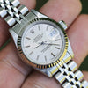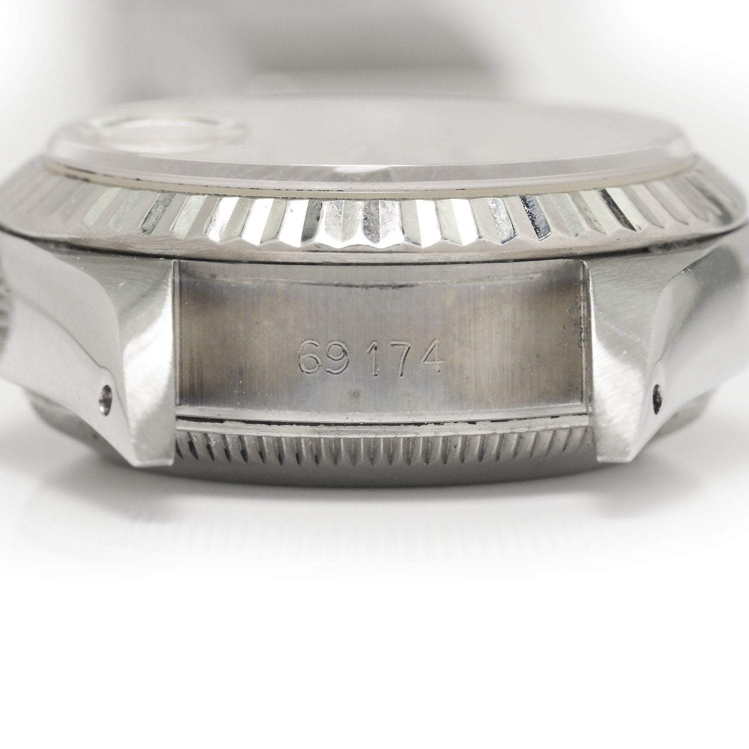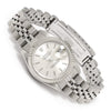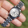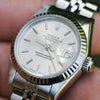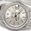 This lovely Rolex Datejust for women is a model 69174 with a 9 million serial number dating its production year to 1987. It features an 18kt white gold fluted bezel, a silver dial with silver indices, and a jubilee bracelet. The 26mm case has a screw-down crown and a sapphire crystal protecting the dial. The watch's bracelet measures 13mm and tapers down to 10mm to a deployment clasp. It is in Excellent condition with some stretch.