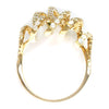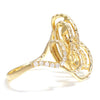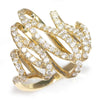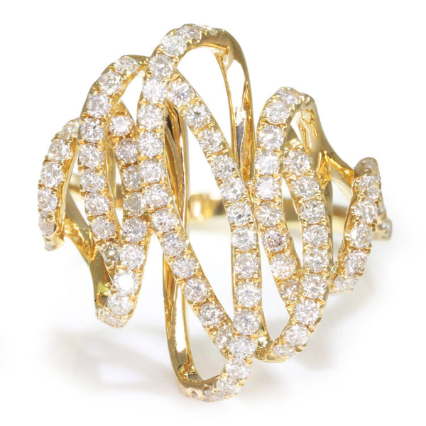 Natural round diamonds swirl and cross over each other in this unique cocktail ring made of solid 14kt yellow gold. There are 92 round brilliant cut natural diamonds graded G-H in color and VS2-SI1 in clarity weighing 1.25-carats total. The reflection of the high-polished gold with the fire and sparkle of the diamonds is a captivating spectacle and hard to ignore. It is a size 7.75 and we offer free resizing. It is Brand New!