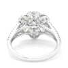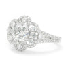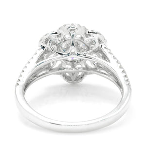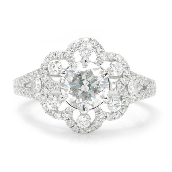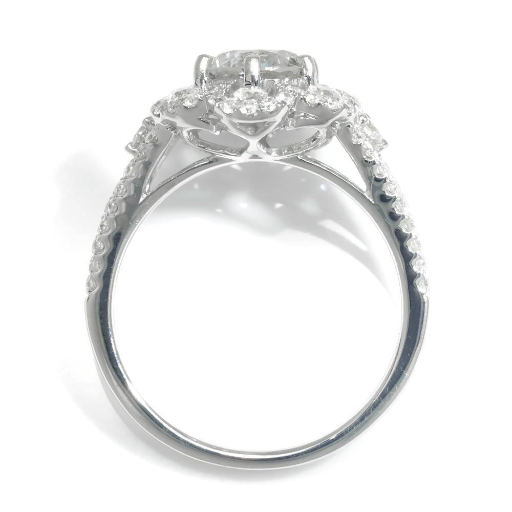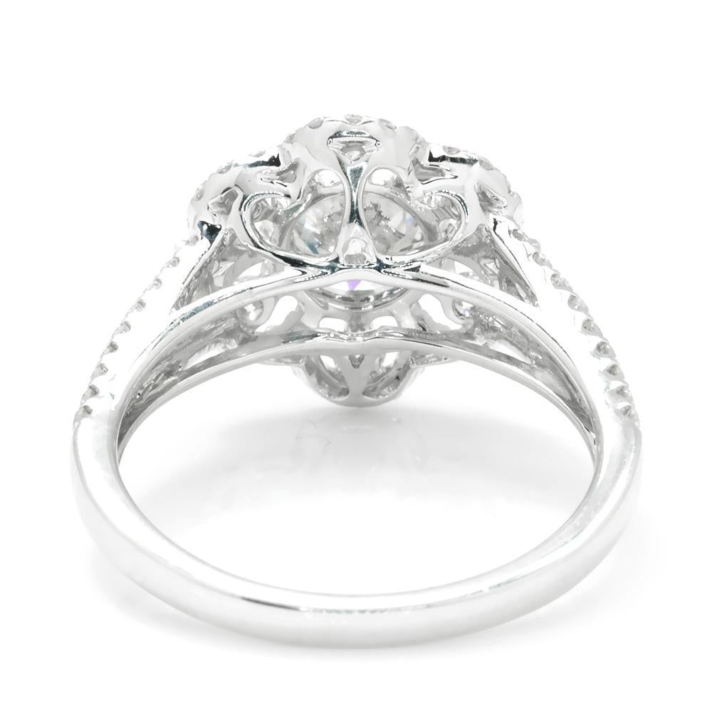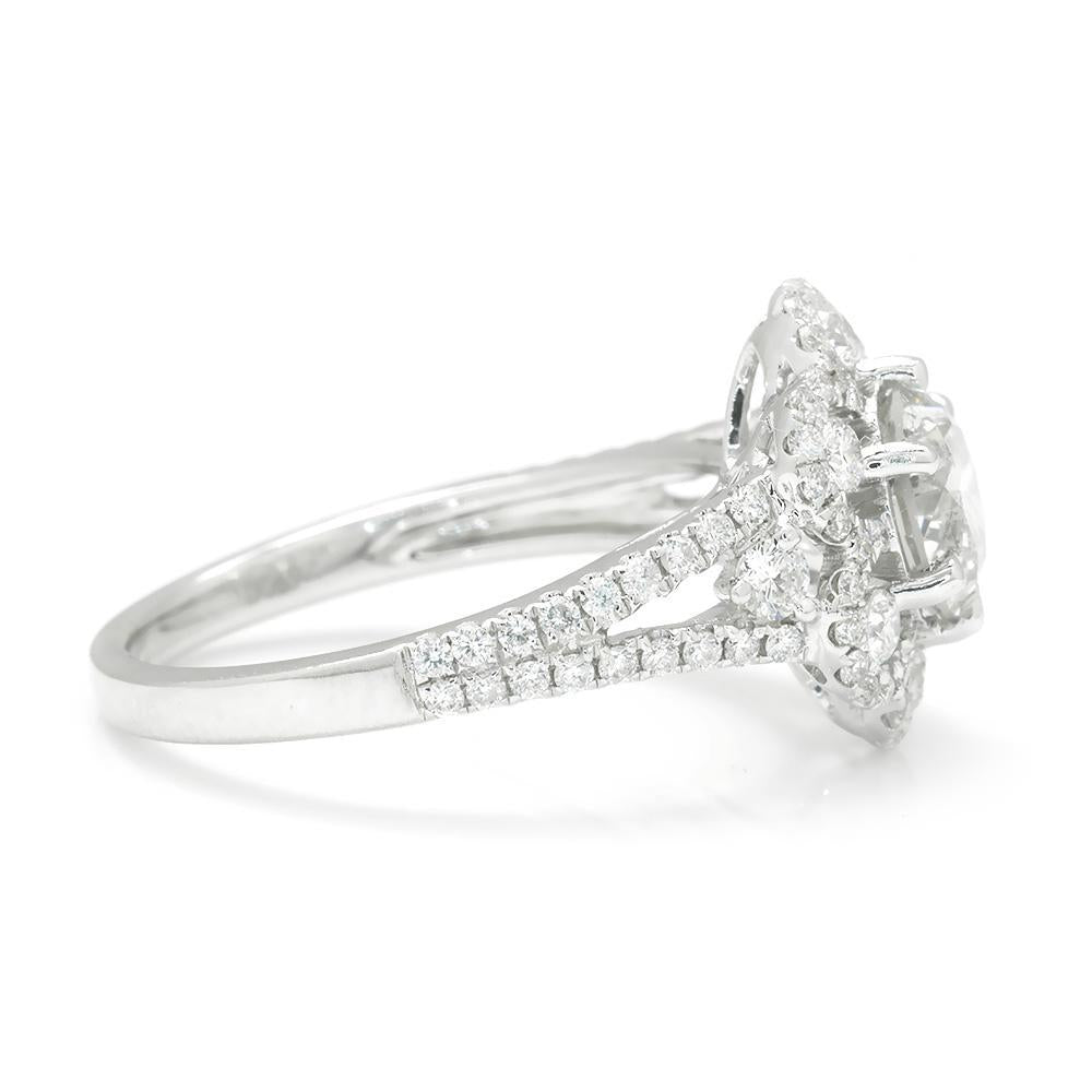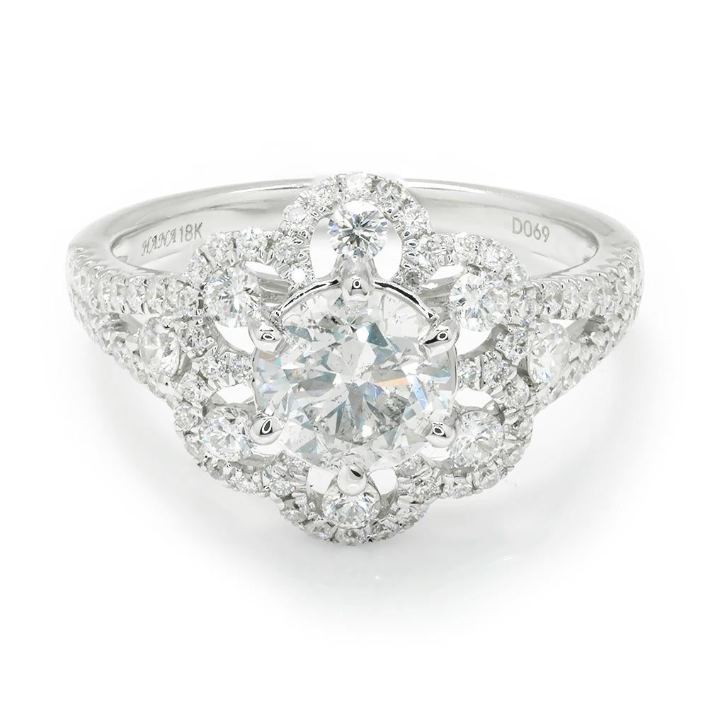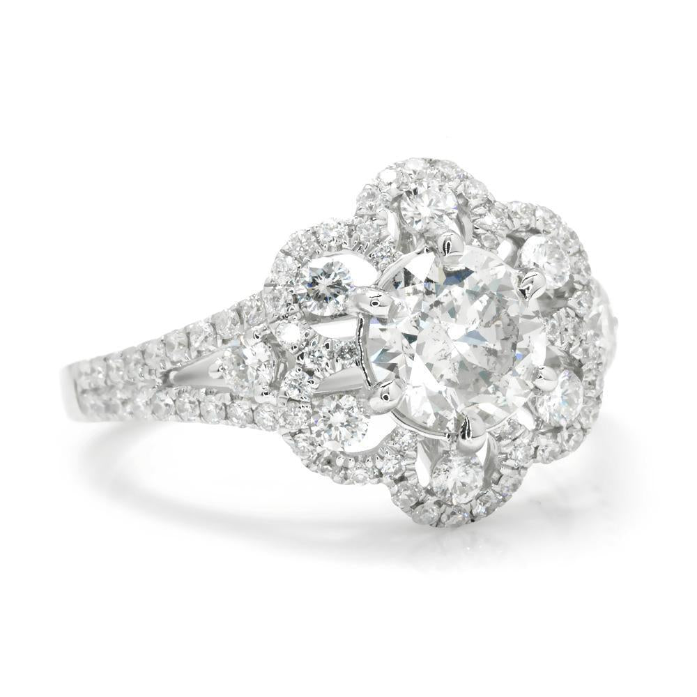A distinctive and beautifully cut round brilliant natural diamond is nestled in diamond encrusted flower motif engagement ring design. The solid 18kt white gold setting boasts a 1.16 carat round diamond at its center in a sturdy 6-prong setting. A floral halo of diamonds is wrapped around the centerpiece and held up by a cathedral style split shank setting with more accent diamonds. There are 86 accent diamonds weighing .69 carats and they are all beautifully matched and compliment the center diamond. The setting is a size 6.5 and can be resized. This engagement ring is Brand New!