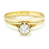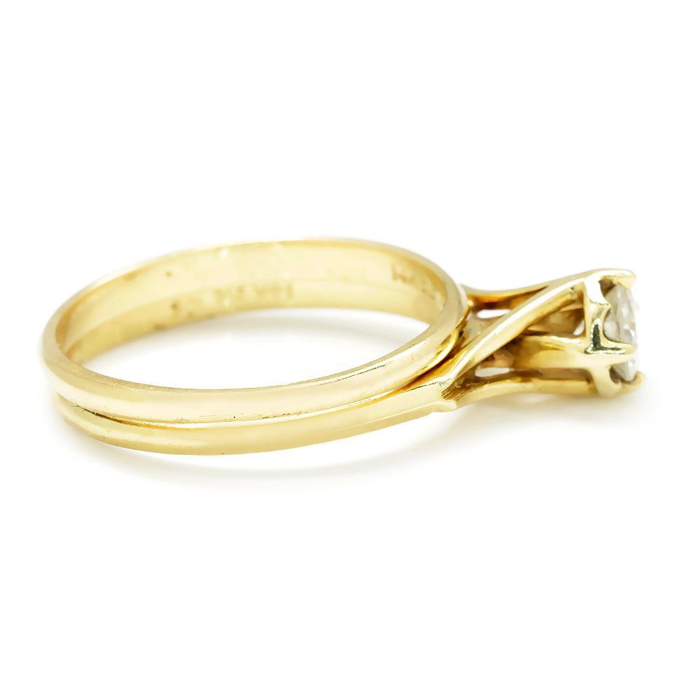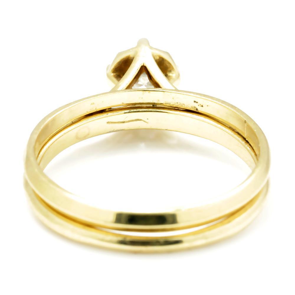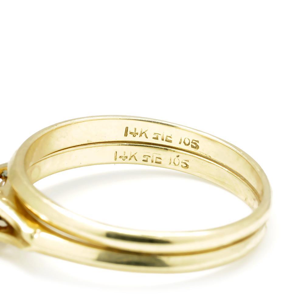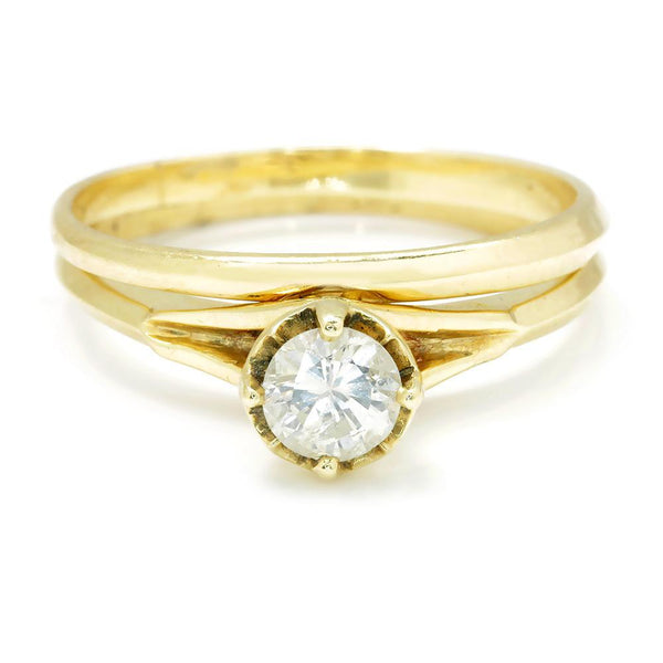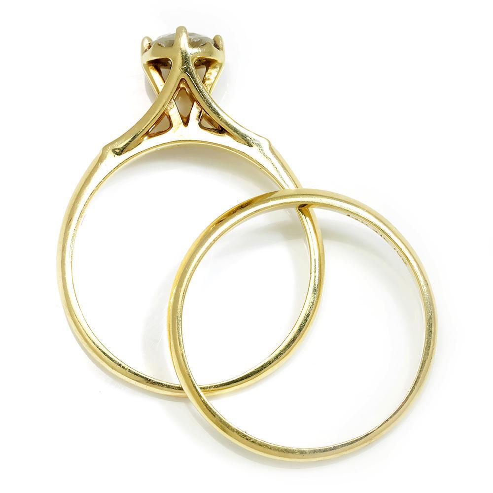 This lovely diamond solitaire ring set is made of solid 14kt yellow gold and matches perfectly. The centerpiece is a .45 carat round brilliant cut natural diamond resting in a sturdy 4-prong setting. The cathedral style solitaire setting raises the diamond way up at 8.30mm and celebrates it. The set is a size 7.25 and we offer free resizing and shipping. They are in Excellent condition with light wear consistent with their age. circa 1960s