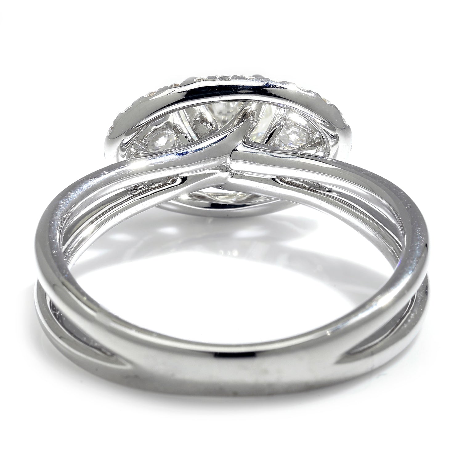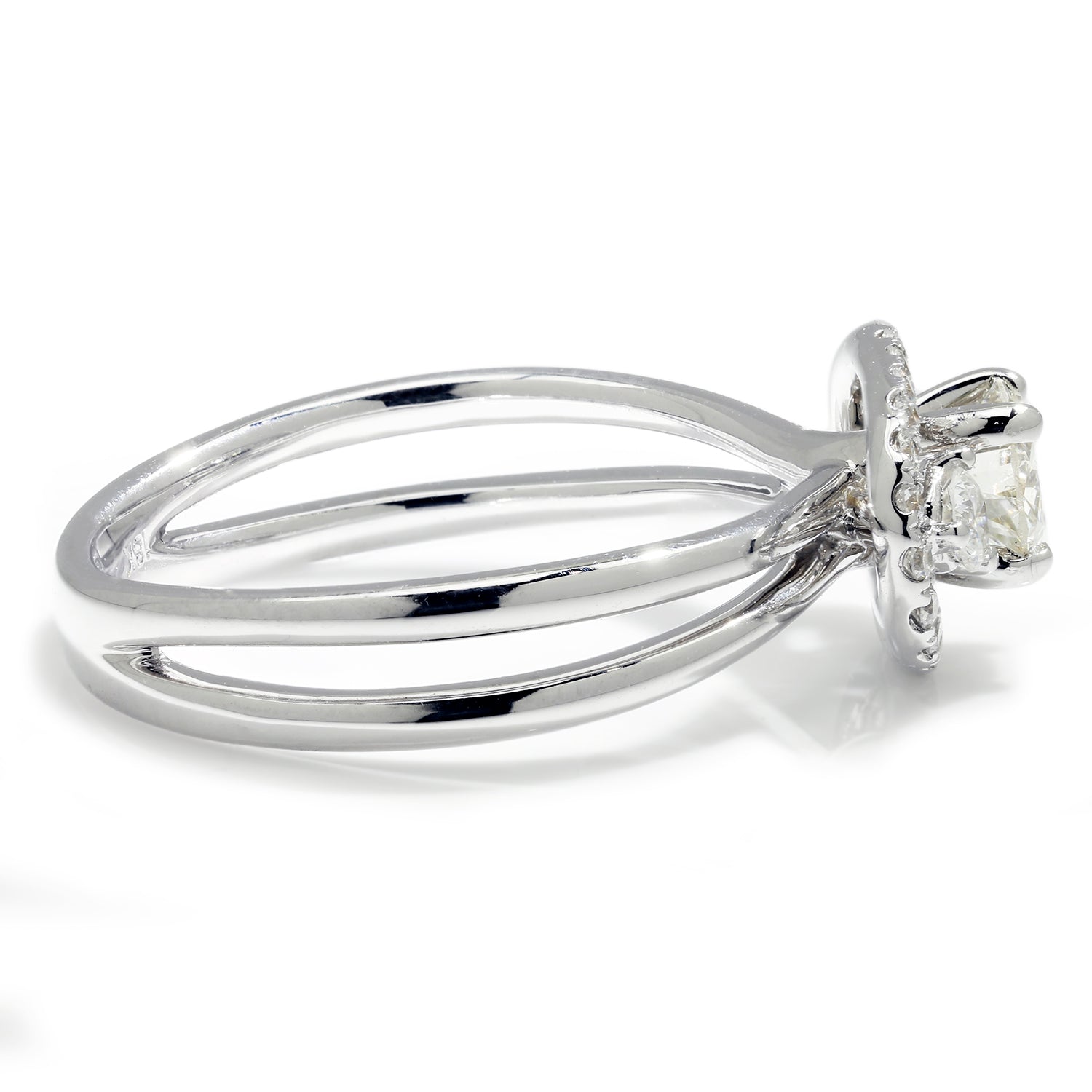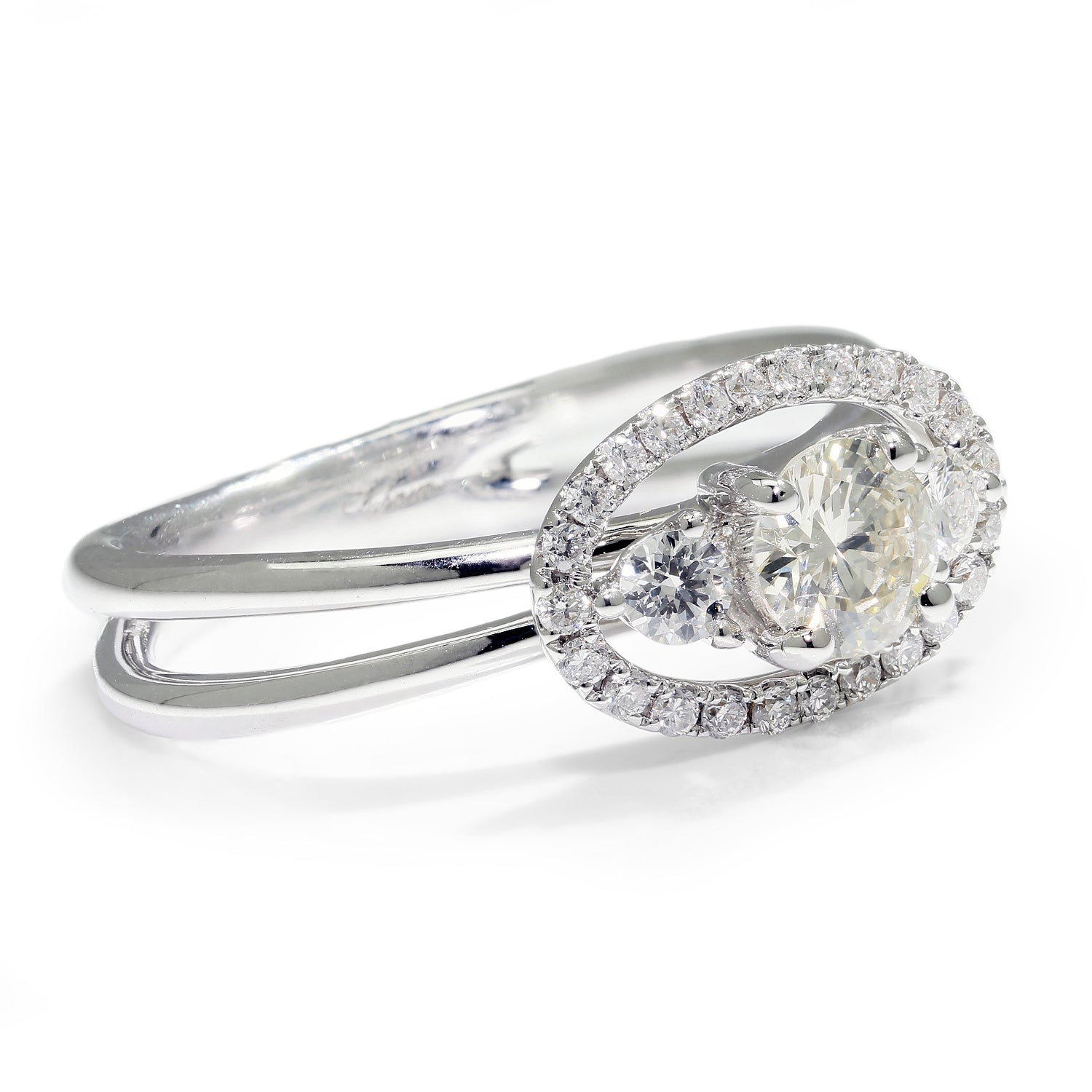 This uniquely designed split-shank ring by Supreme Jewelry features a cluster of three brilliant-cut natural diamonds at its center, surrounded by a halo of smaller round brilliants. It's 18kt white gold, and a 0.39-carat round diamond is nestled right in the center. The total diamond weight comes to 0.67 carats. It is a size 6, and we offer complimentary resizing. It is brand new!