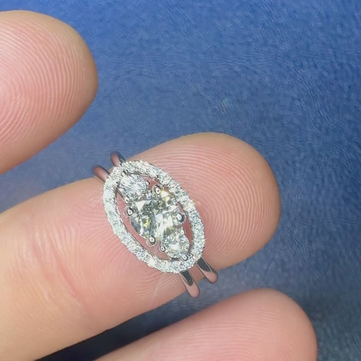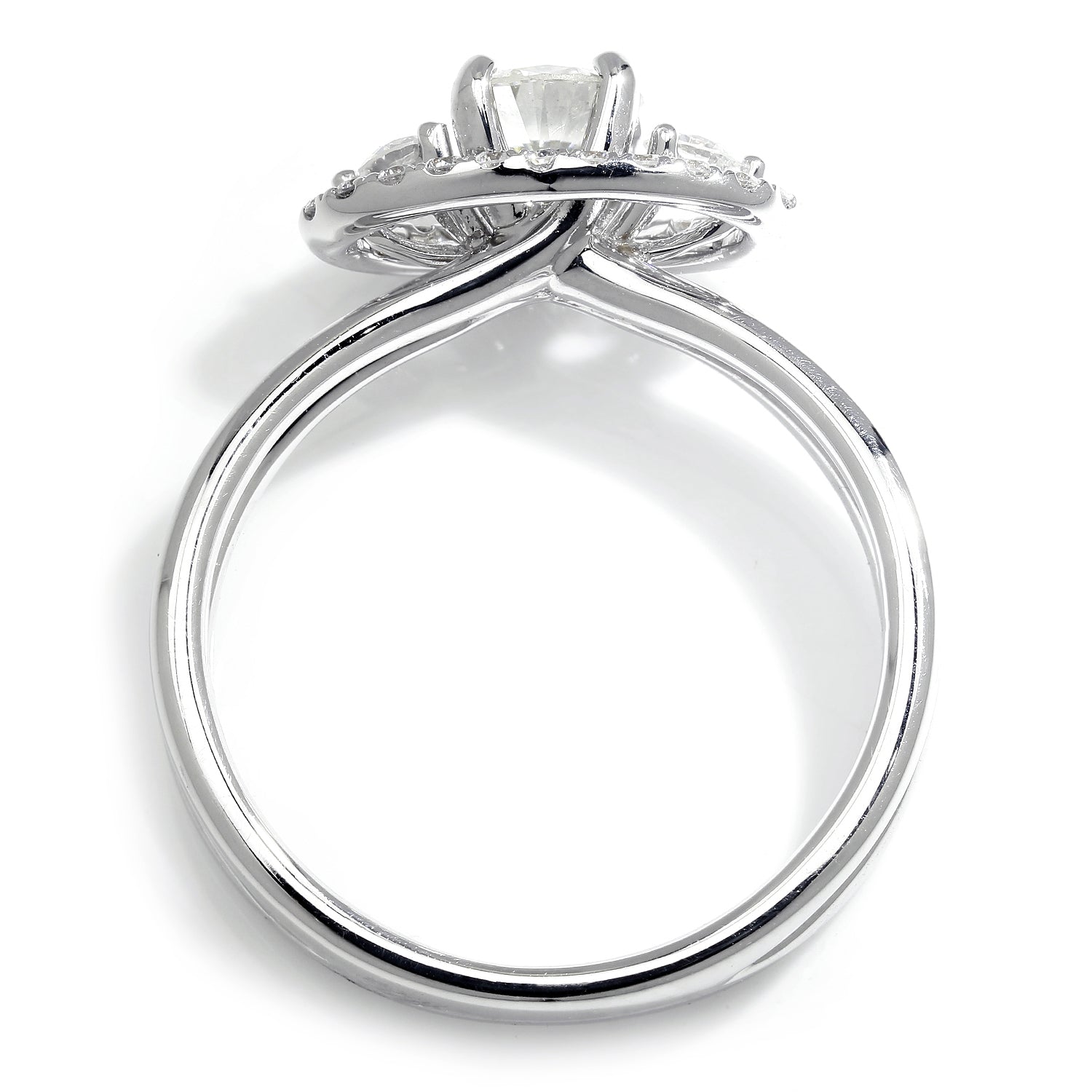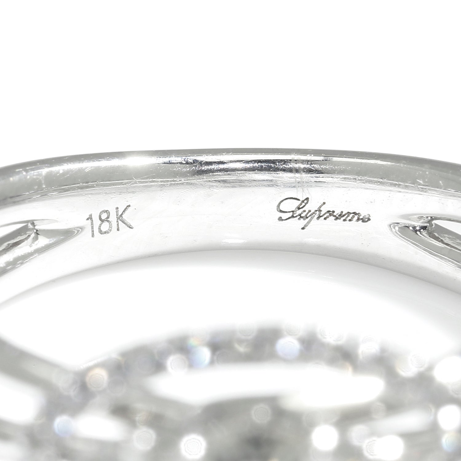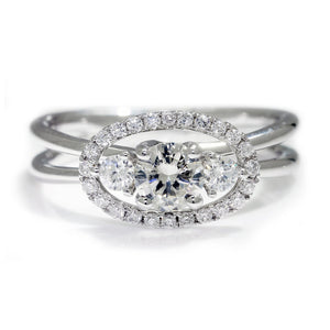 This uniquely designed split-shank ring by Supreme Jewelry features a cluster of three brilliant-cut natural diamonds at its center, surrounded by a halo of smaller round brilliants. It's 18kt white gold, and a 0.39-carat round diamond is nestled right in the center. The total diamond weight comes to 0.67 carats. It is a size 6, and we offer complimentary resizing. It is brand new!