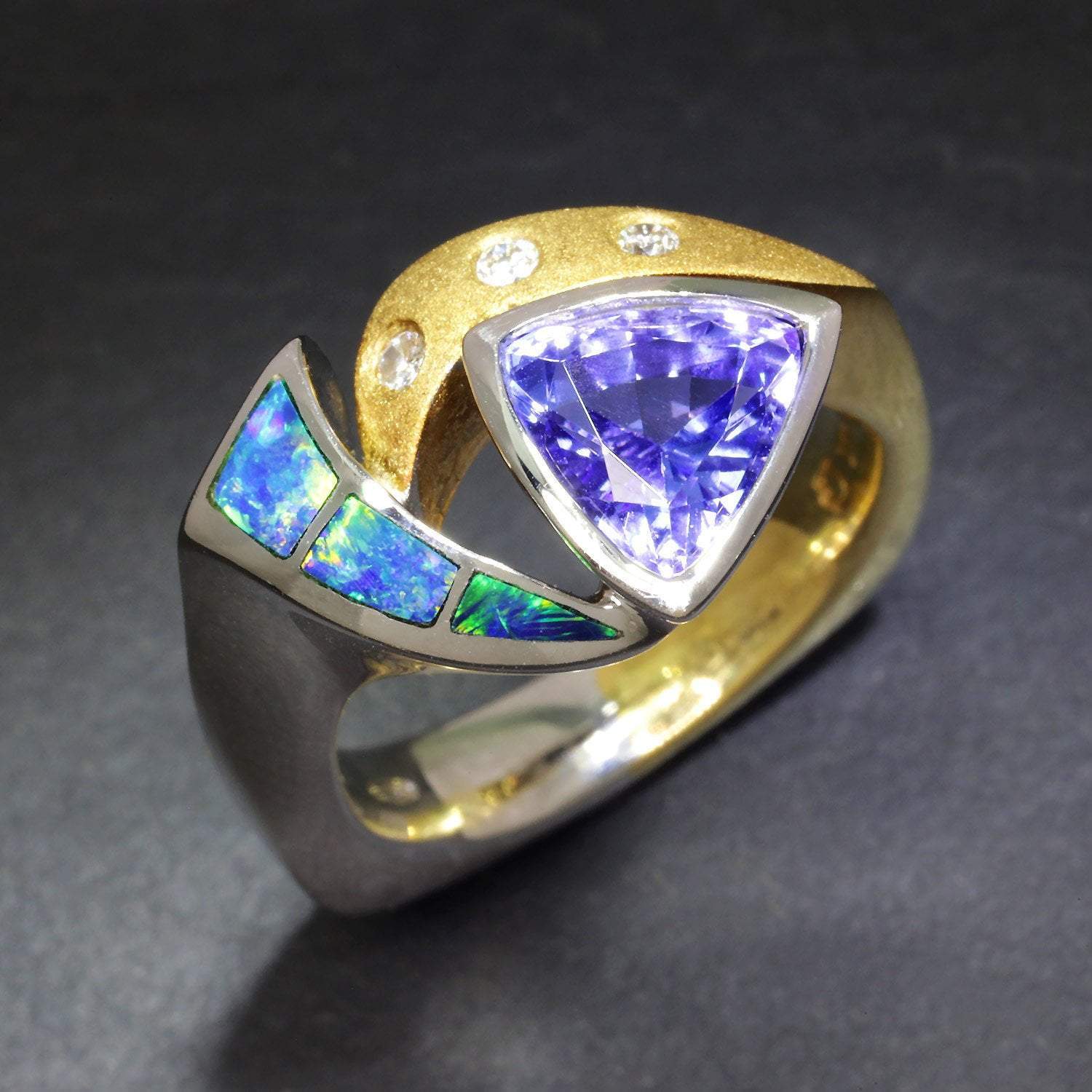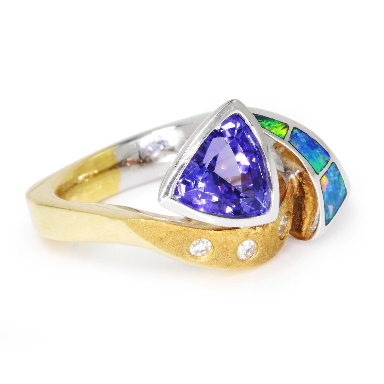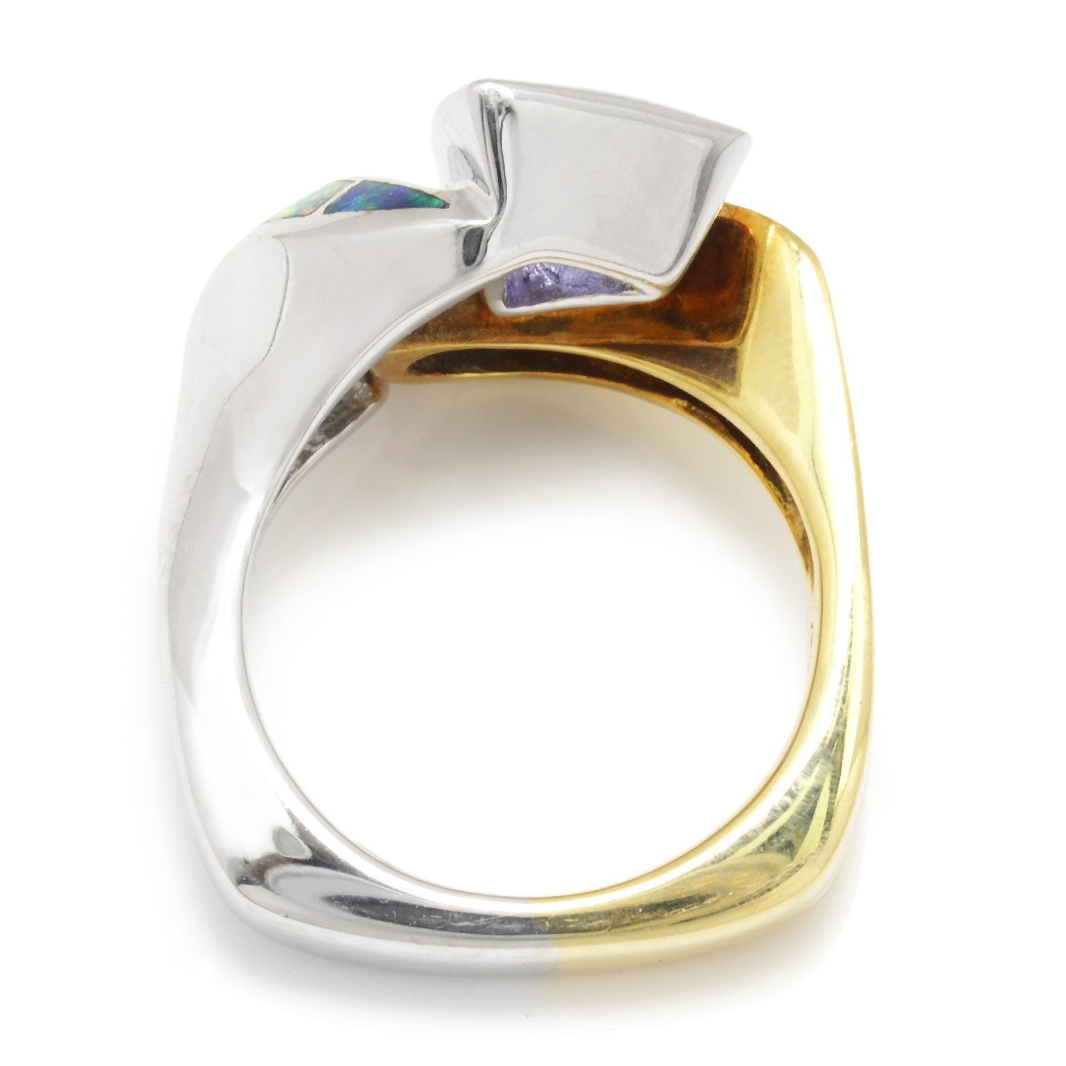 This exciting and lively 18kt two-tone gold ring celebrates a striking natural tanzanite surrounded by diamonds and inlaid Australian opal. A true artist and craftsman created this bold and imaginative piece. It is extremely well-crafted and has a nice hefty weight to it at 11.4 grams. The combination of color and skill is something to behold. It is pre-owned and in Excellent condition.