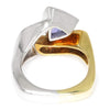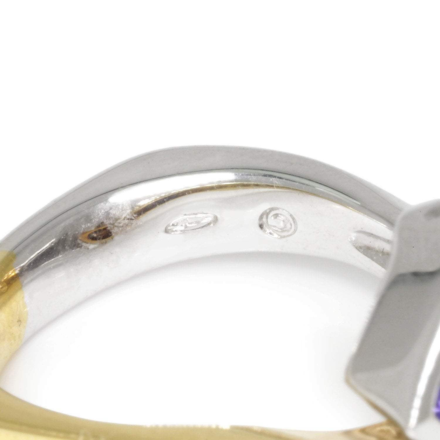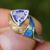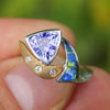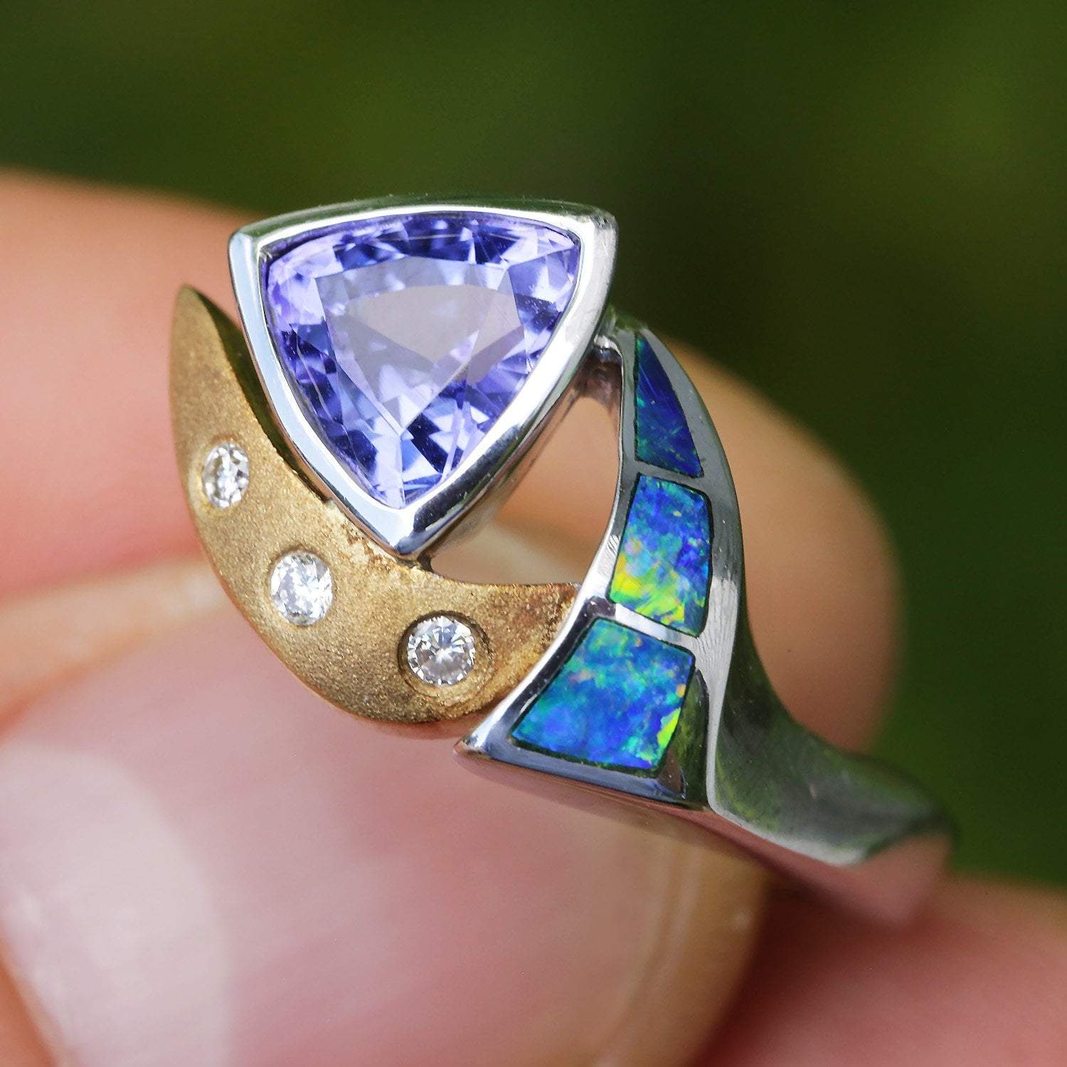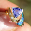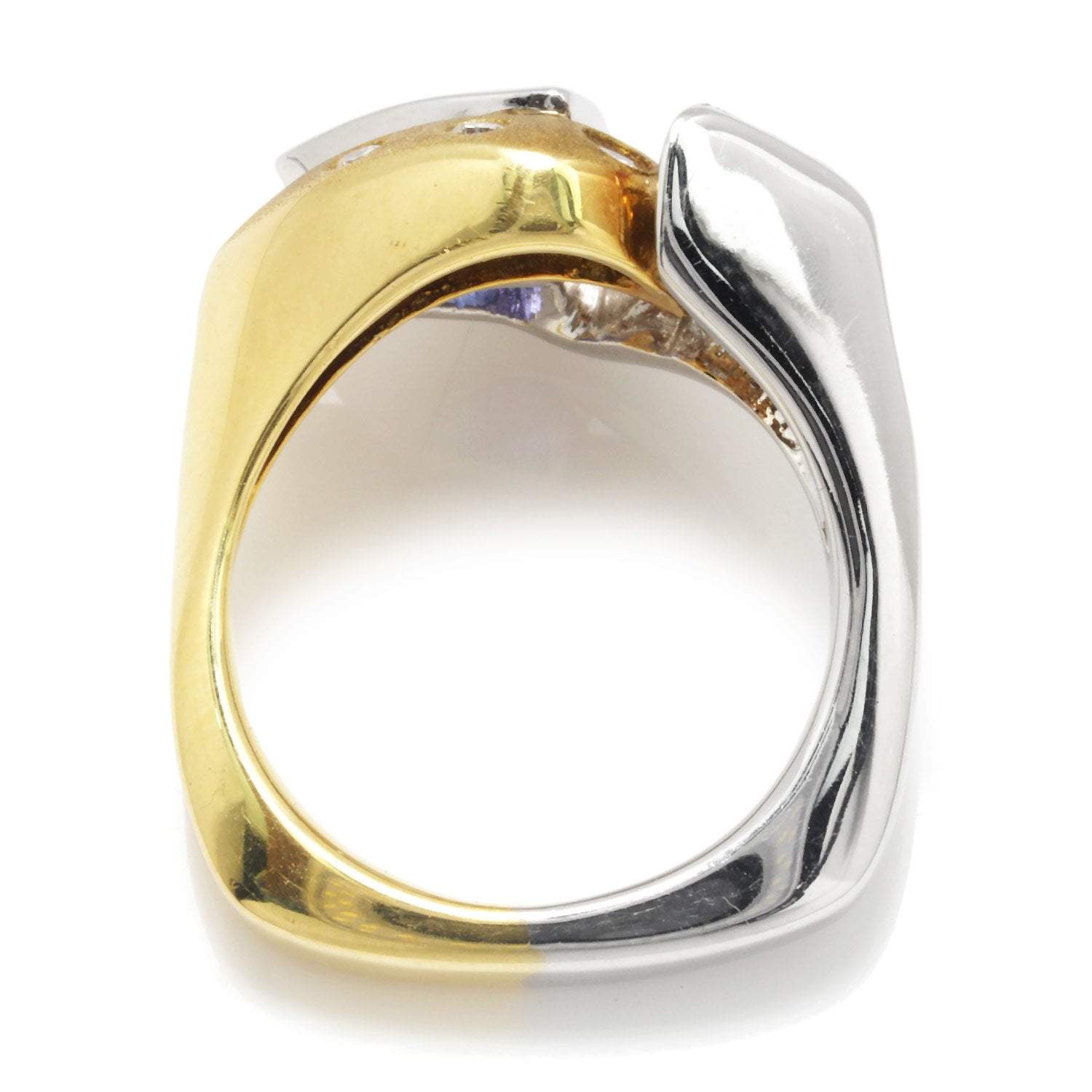This exciting and lively 18kt two-tone gold ring celebrates a striking natural tanzanite surrounded by diamonds and inlaid Australian opal. A true artist and craftsman created this bold and imaginative piece. It is extremely well-crafted and has a nice hefty weight to it at 11.4 grams. The combination of color and skill is something to behold. It is pre-owned and in Excellent condition.