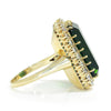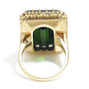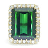 Featured is a bold statement gemstone ring certified by EGL USA to be a natural yellowish green tourmaline weighing 23.35 carats. The rectangular step cut gem is surrounded by a halo of round brilliant diamonds graded H-I in color and SI1-I2 in clarity weighing 1.10 carats total. The setting is made of solid 14kt yellow gold and is currently a size 7.75 and can be resized. The original EGL USA Certificate and UGS Appraisal are included. The ring is appraised for $17,883 as of June 17, 2019.