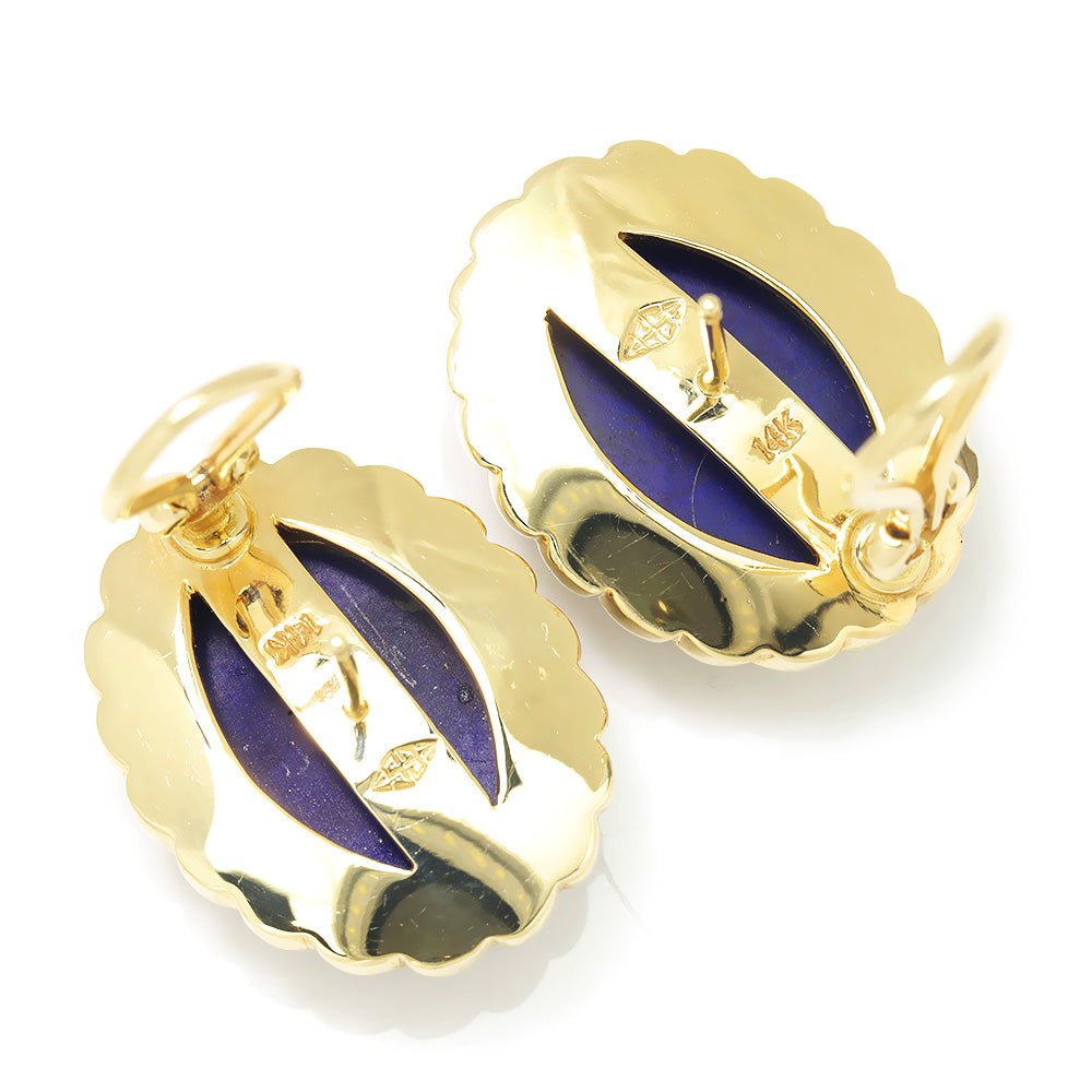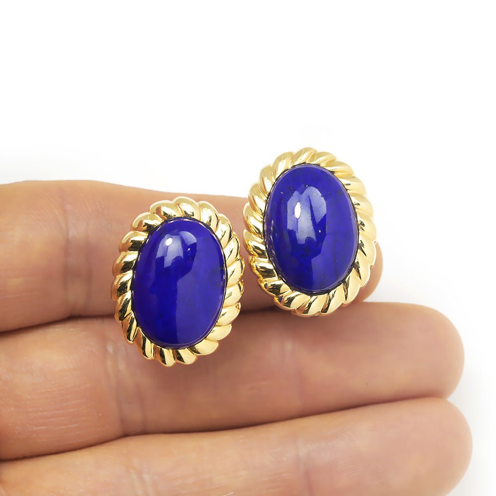 These vintage French clip with post earrings are solid 14kt yellow gold, featuring a highly polished ribbed design surrounding the oval lapis lazuli gemstones. The oval cabochon cut gems are bezel set and weigh about 18 1/2 carats. They exhibit royal blue hues with hints of gold pyrite flecks. They weigh just over 16 grams and measure 7/8" in length and 3/4" in width. They are in excellent overall condition with minimal signs of wear.