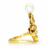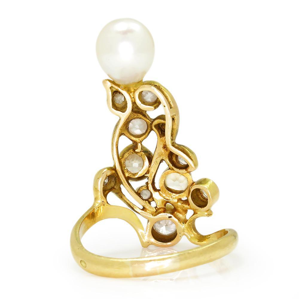 Incredibly unique and extremely well-made is this vintage diamond and pearl dinner ring made from solid 18kt yellow gold. The ring, inspired by nature, grows with multiple vines of the filigree gold with old mine cut diamonds blooming throughout. At the top of the ring is an elegant pear-shaped cultured Akoya pearl measuring 8.50mm x 7.25mm. The rings face measures 1 1/8" long and is a size 7.5 and can be resized. The designer's stamp is on the outside of the band and appears to be an owl perched on a branch. There are 11 old mine cut natural diamonds weighing about 1.00 carat total and range in color from H to P and are SI2-I2 in clarity. The ring is in Excellent condition and of the most unique designs that we have seen.