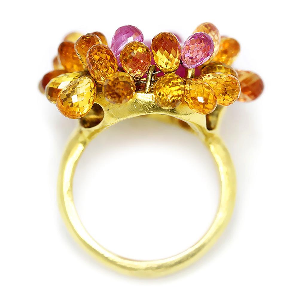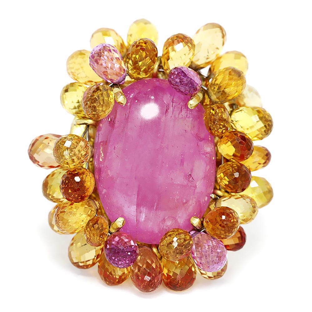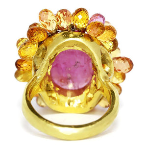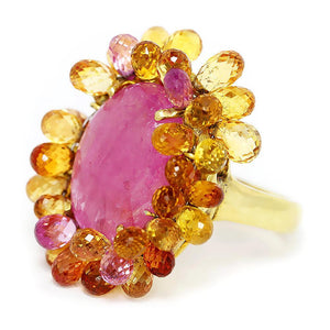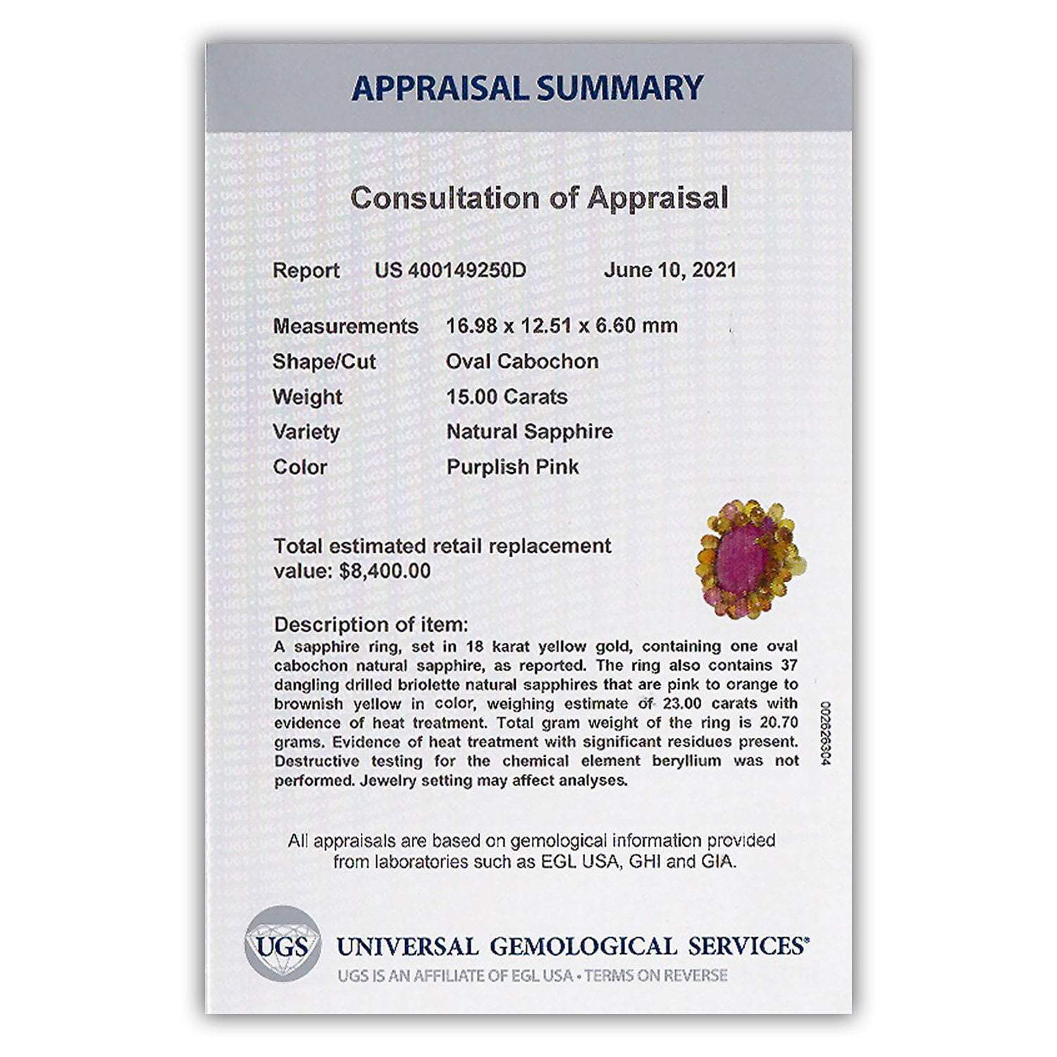 Featured is a one-of-a-kind handmade ring certified by EGL USA and crafted of heavy 18kt yellow gold exhibiting a bold oval cabochon cut natural pink sapphire at its center surrounded by briolette cut sapphires. The center sapphire weighs 15.00 carats and displays natural internal striations. The purplish pink cabochon cut gem is surrounded by 37 drilled briolette cut pink to orange to brownish yellow natural sapphire’s weighing 23.00 carats total. The sapphire’s are entangled in a wire so they are free to jiggle and flutter around the ruby creating a flashy colorful display. The ring weighs a hefty 20.3 grams and is currently a size 6.75, which can be resized. It's pre-owned and in great condition with a small chip on the surface of the sapphire and normal signs of wear.