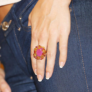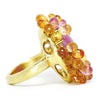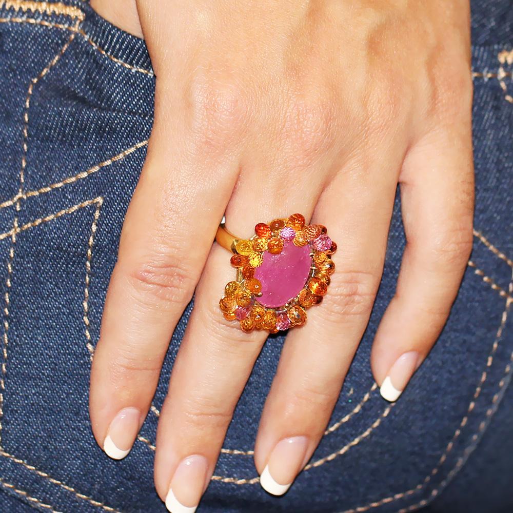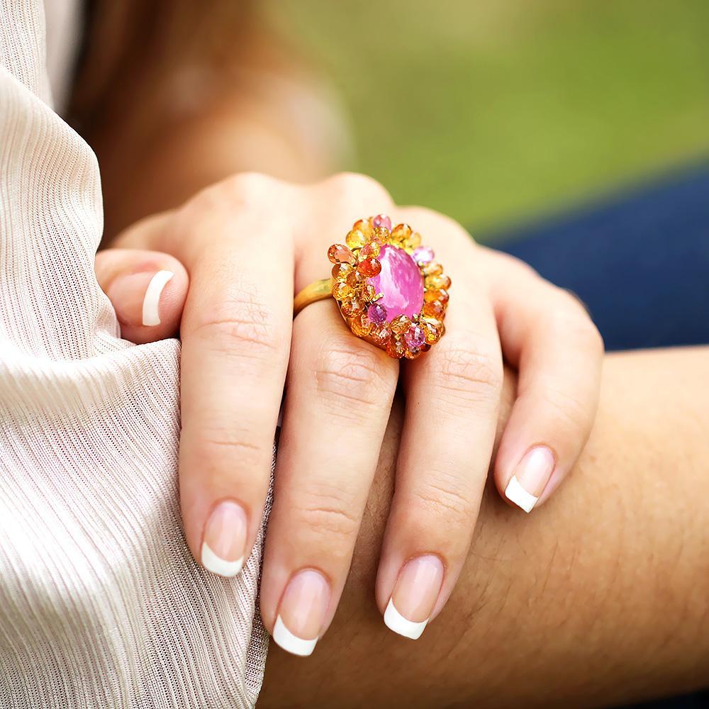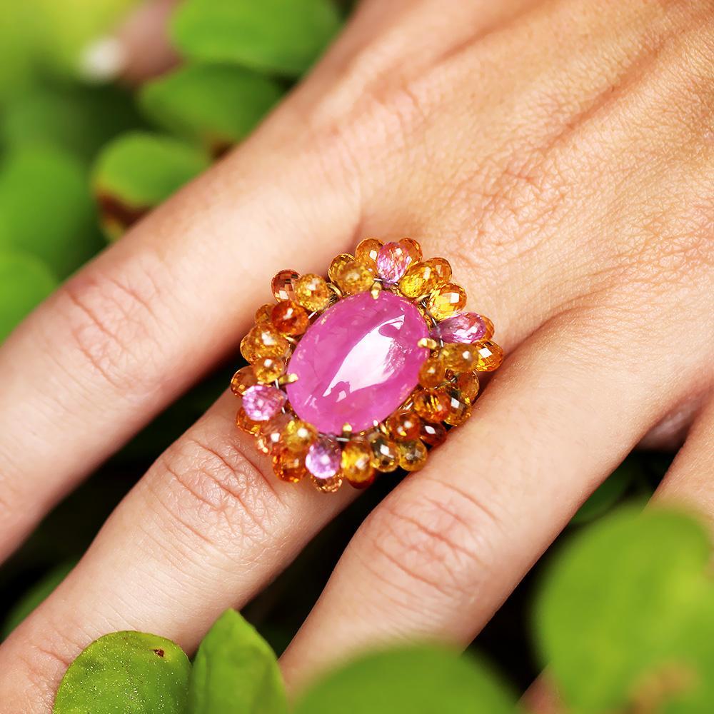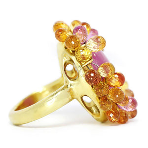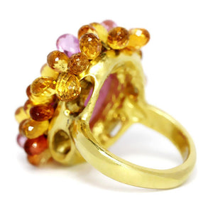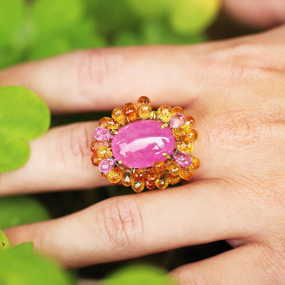 Featured is a one-of-a-kind handmade ring certified by EGL USA and crafted of heavy 18kt yellow gold exhibiting a bold oval cabochon cut natural pink sapphire at its center surrounded by briolette cut sapphires. The center sapphire weighs 15.00 carats and displays natural internal striations. The purplish pink cabochon cut gem is surrounded by 37 drilled briolette cut pink to orange to brownish yellow natural sapphire’s weighing 23.00 carats total. The sapphire’s are entangled in a wire so they are free to jiggle and flutter around the ruby creating a flashy colorful display. The ring weighs a hefty 20.3 grams and is currently a size 6.75, which can be resized. It's pre-owned and in great condition with a small chip on the surface of the sapphire and normal signs of wear.
