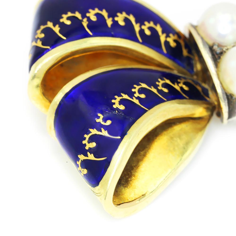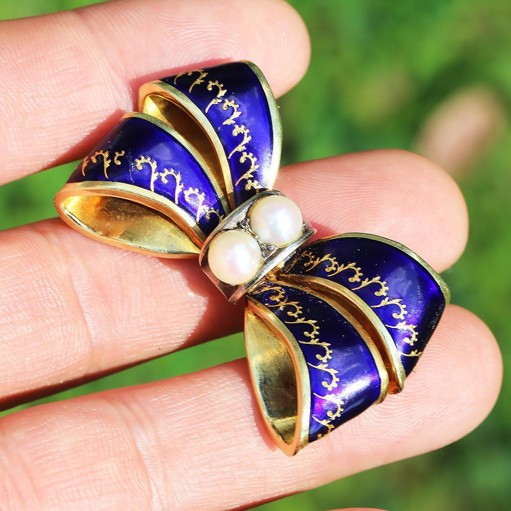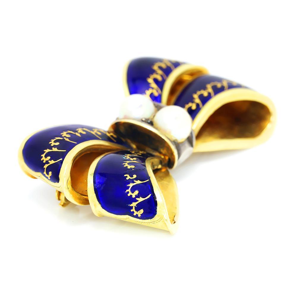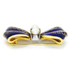 This ribbon is already tied up and ready to wear. This vintage piece is made of solid 18kt yellow gold ribbon with blue enamel on its surface and the center is made of 18kt white gold where the pearls are encrusted. The pearls measure about 6mm each and are cultured saltwater white pearls with pink overtones. They exhibit high luster and excellent nacre. The ribbons intense colors contrast beautifully against the white pearls as the blue enamel is absolutely exquisite in quality and color. A filigree gold detail has been inlaid into the enamel which creates a whimsical design. One of the gold filigree designs is partially missing yet is hard to notice. The pin weighs 16.4 grams and measures 1 7/8" in length and just over 1" in width. It is in excellent condition.